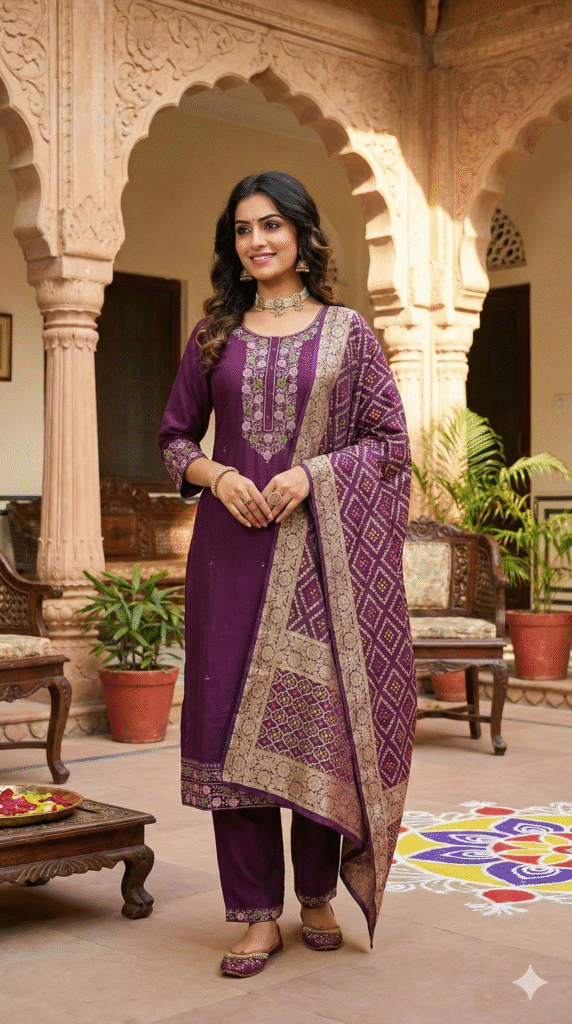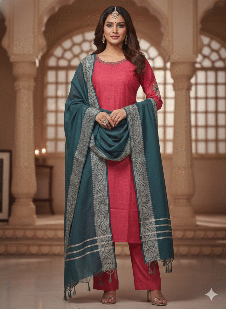 Luxurious Silk Ethnic Suit with Contrast Dupatta