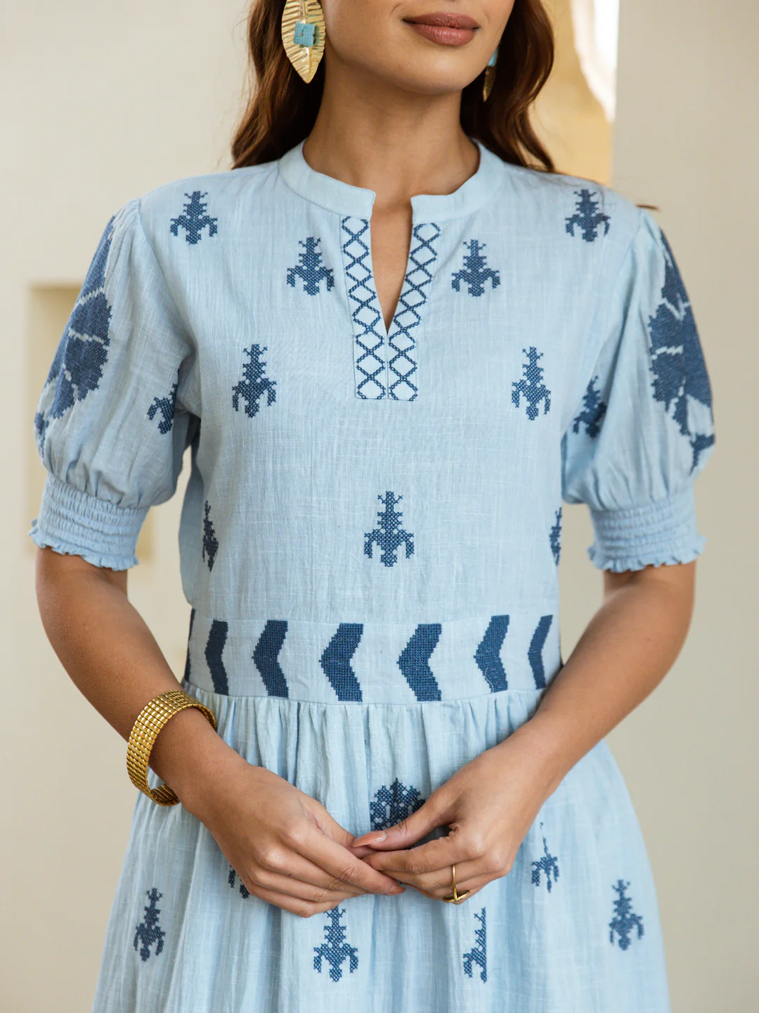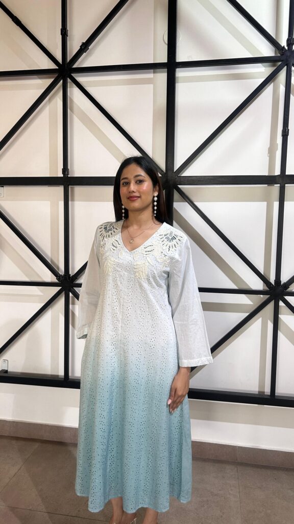 Soft and serene, this sky blue cotton dress captures the essence of effortless style. Adorned with intricate blue embroidery, it offers a tonal elegance that feels both refined and understated. Crafted from breathable cotton with a relaxed silhouette, it’s an ideal choice for warm days, combining comfort with timeless charm.