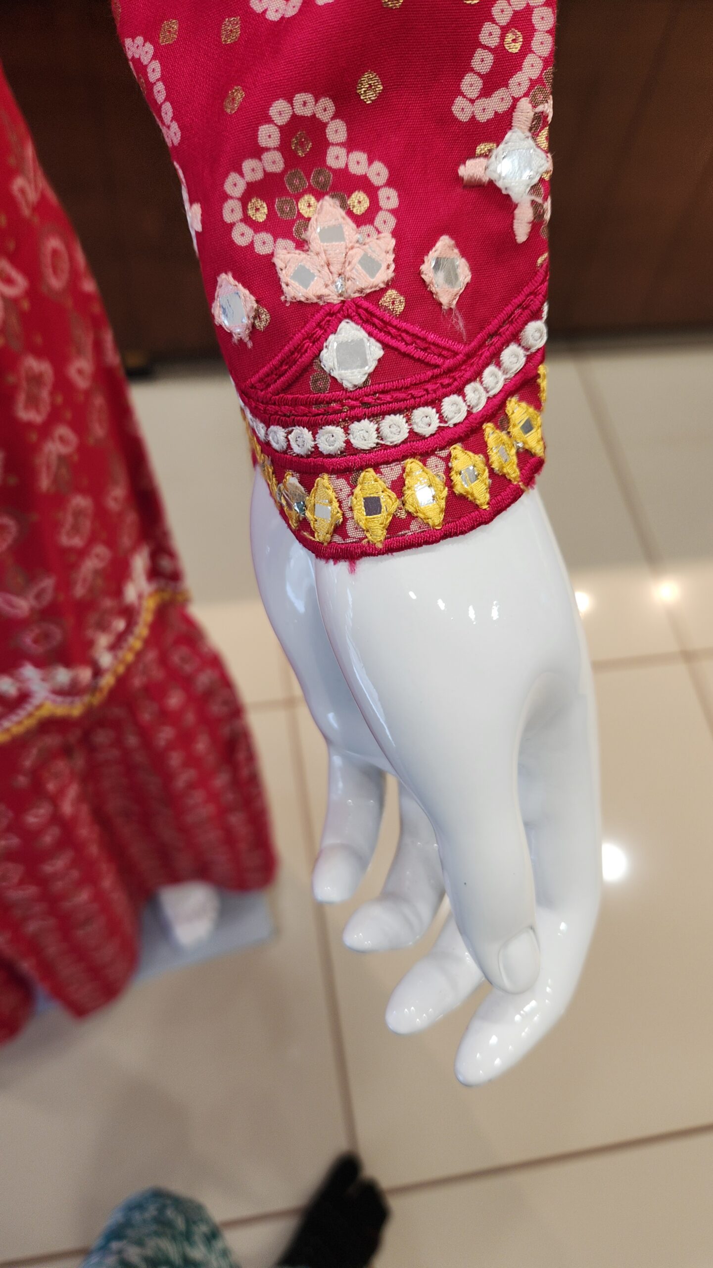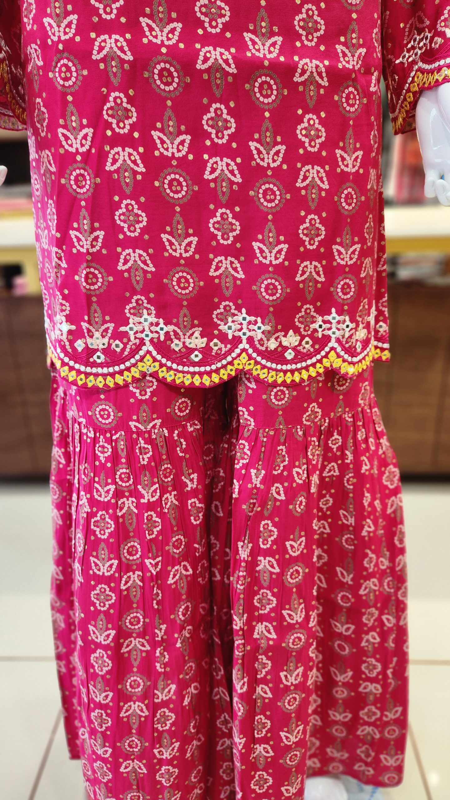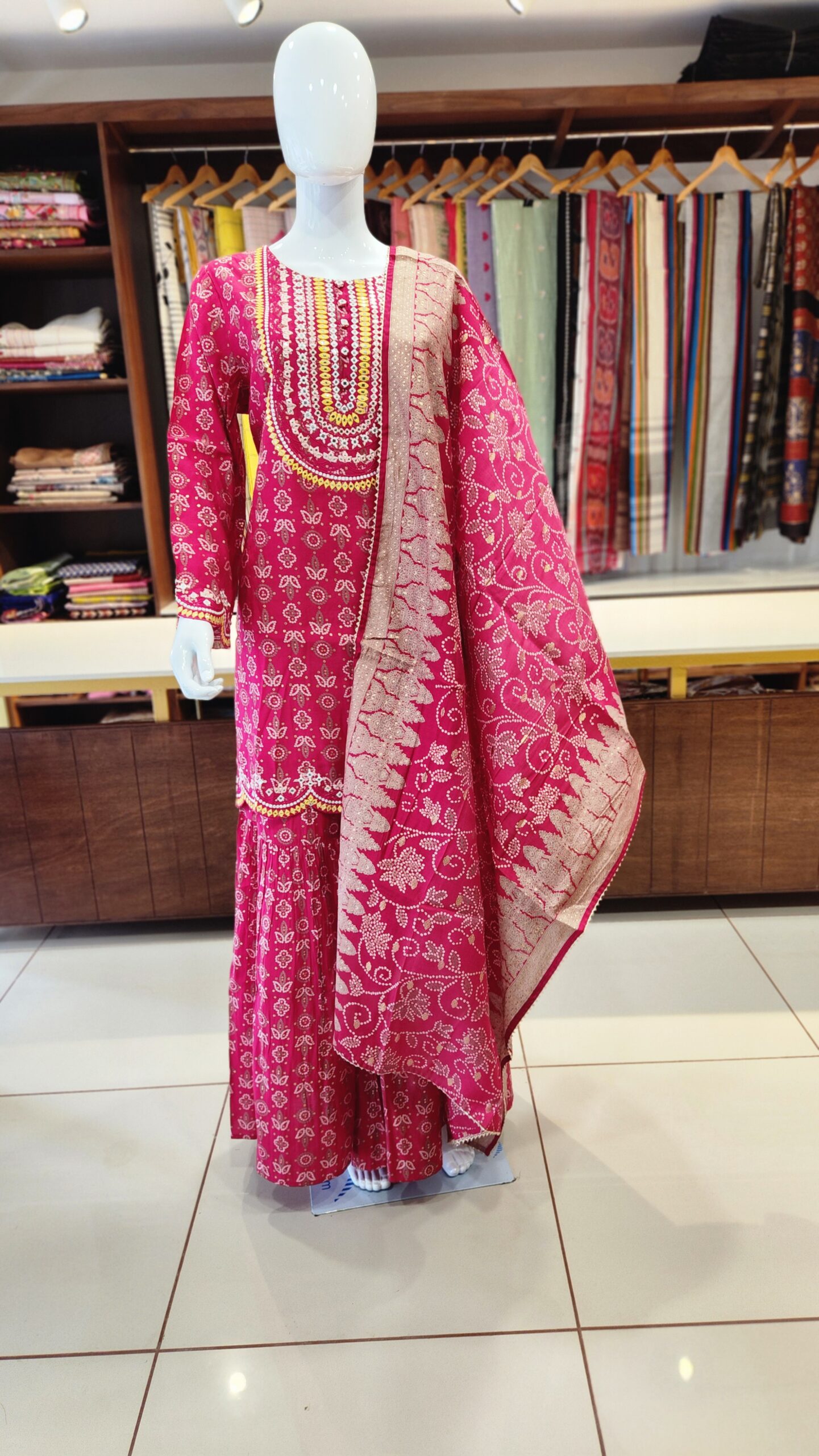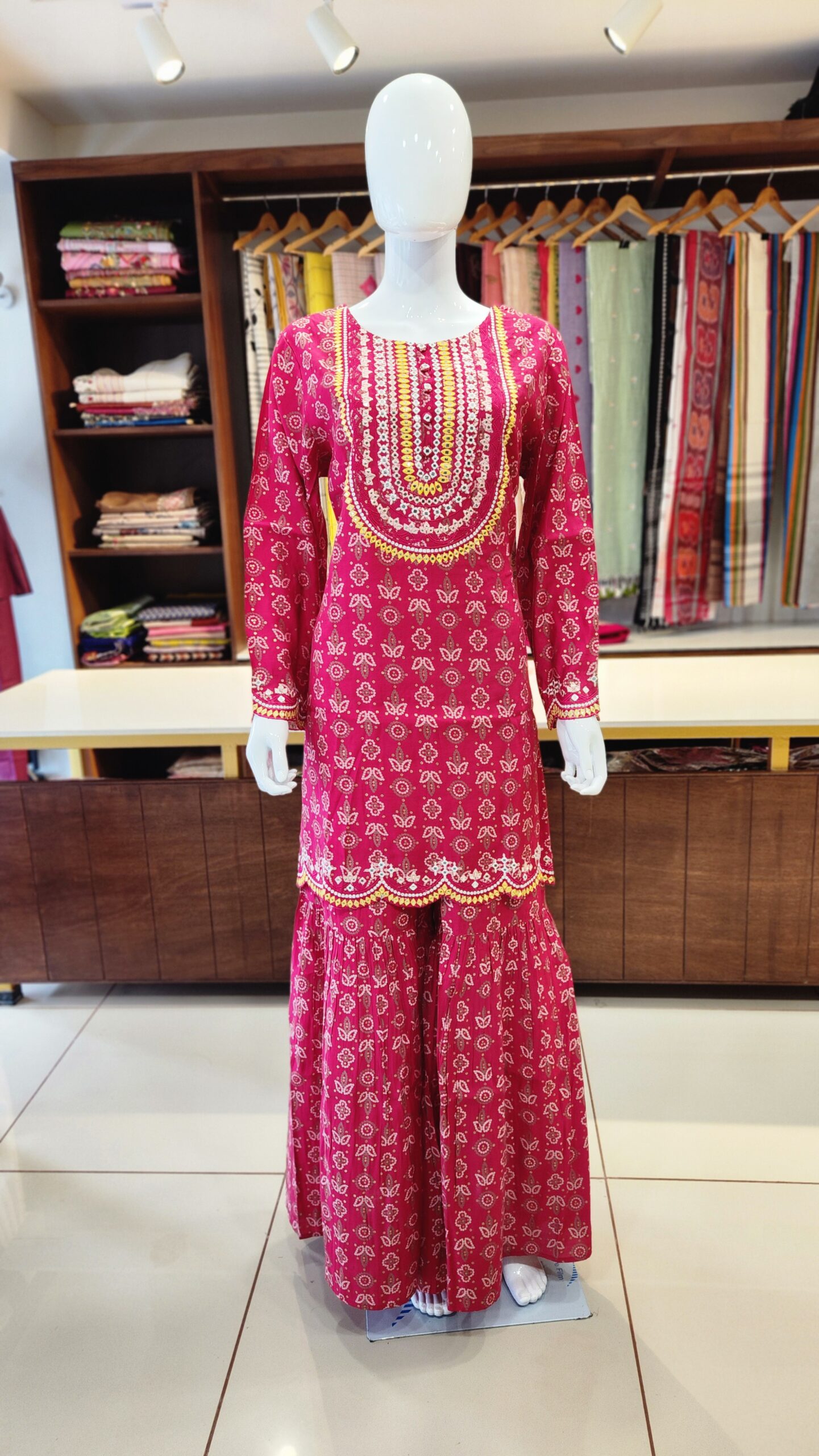 Printed sharara set with detailed yoke work and matching dupatta—graceful, festive, and effortlessly chic.