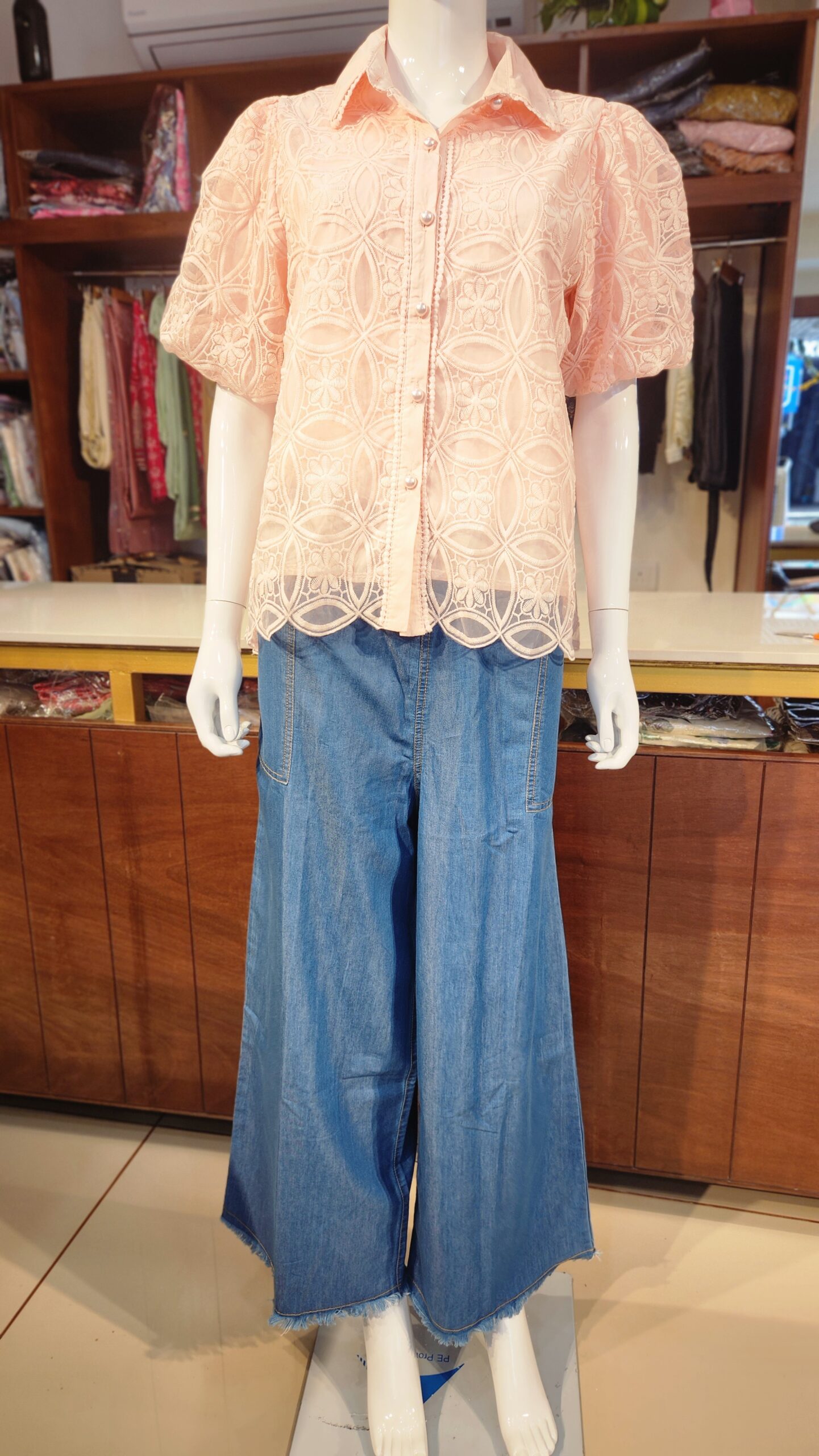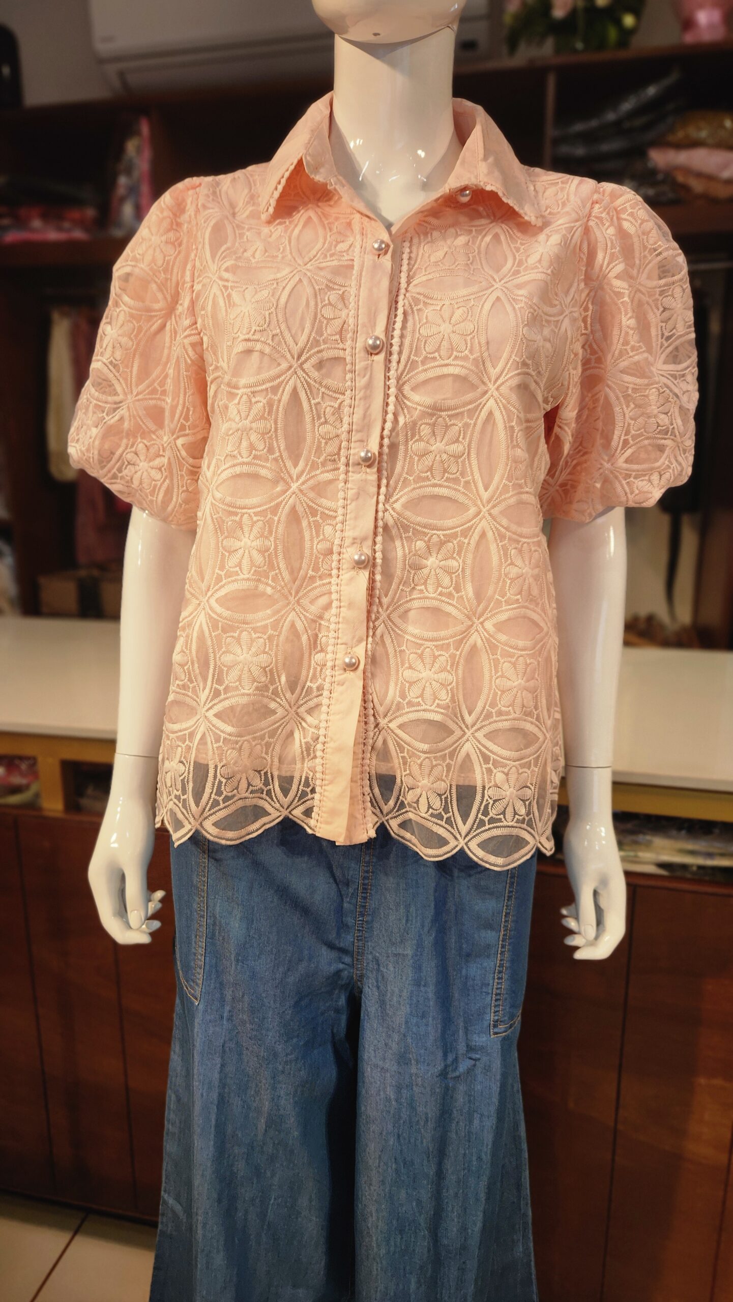 Elevate your everyday elegance with this charming peach lace top, featuring intricate floral and geometric embroidery. Crafted from lightweight fabric, it offers a breathable and comfortable fit, perfect for casual outings or semi-formal gatherings. The puffed short sleeves add a touch of femininity, while the pearl-buttoned front enhances its graceful appeal. Pair it effortlessly with denims or trousers for a chic, polished look.