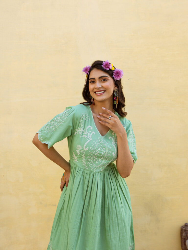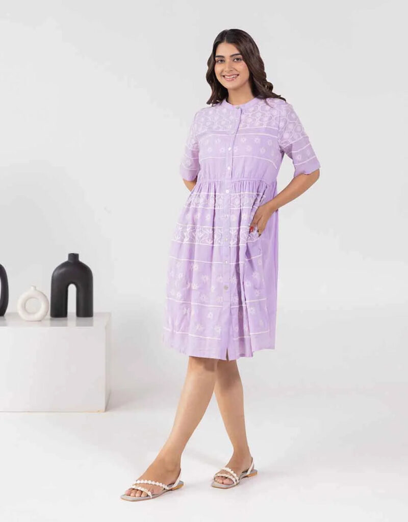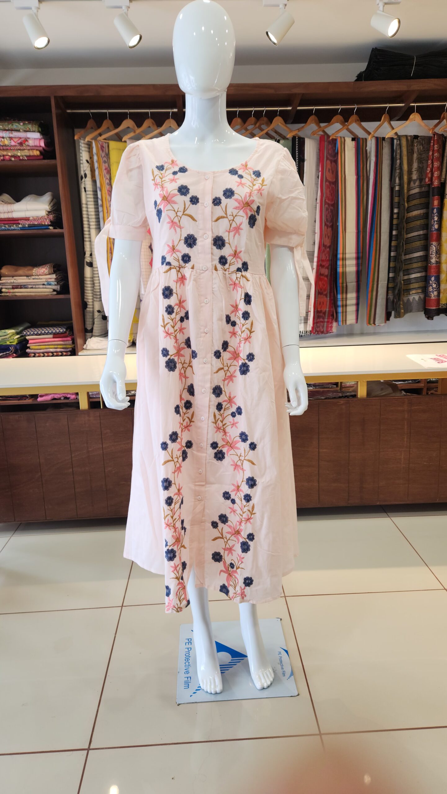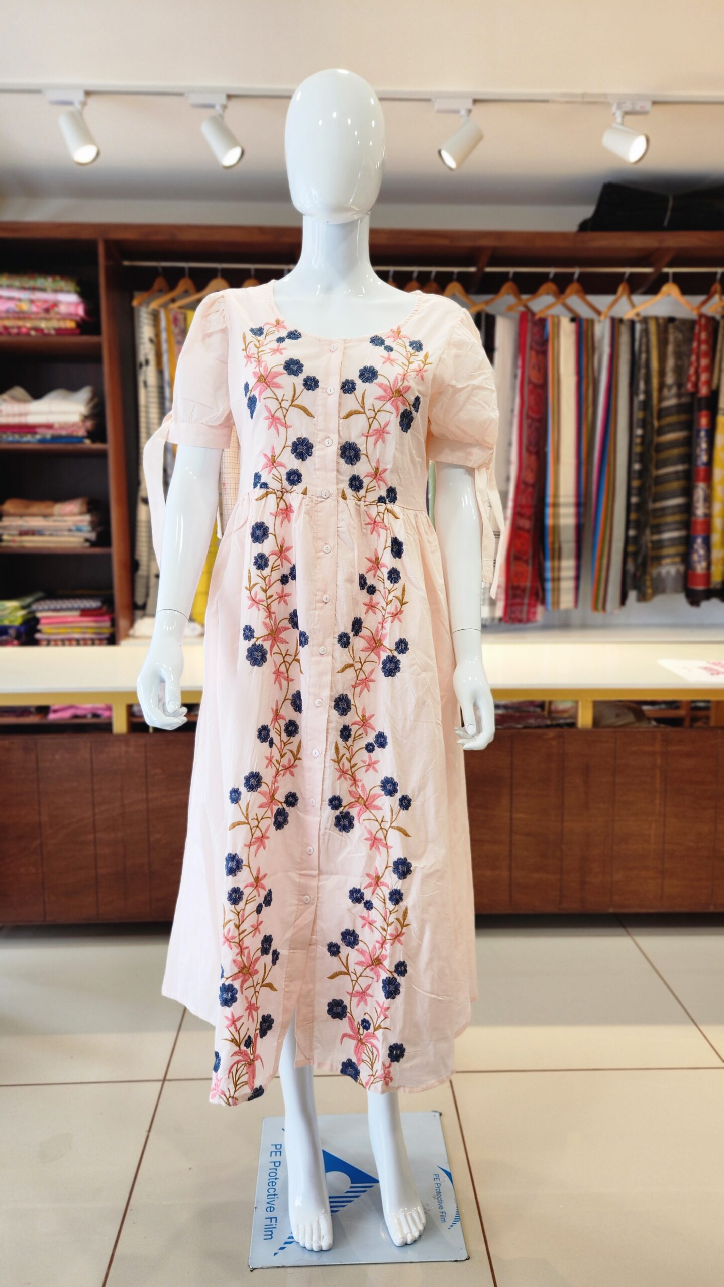 This pink cotton dress is embellished with vibrant blue and pink bright floral embroidery. It features a button-down closure and drawstrings on the sleeves for a customizable fit. Stylish and comfortable, it’s perfect for any casual yet chic occasion.