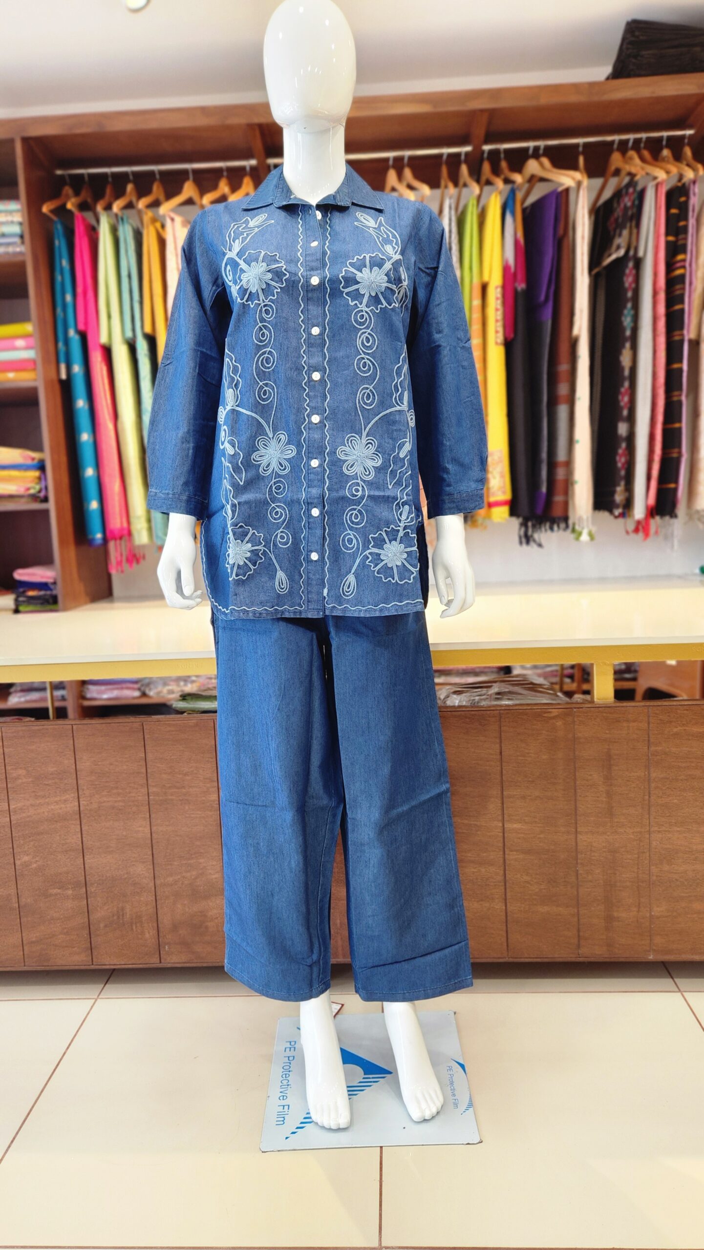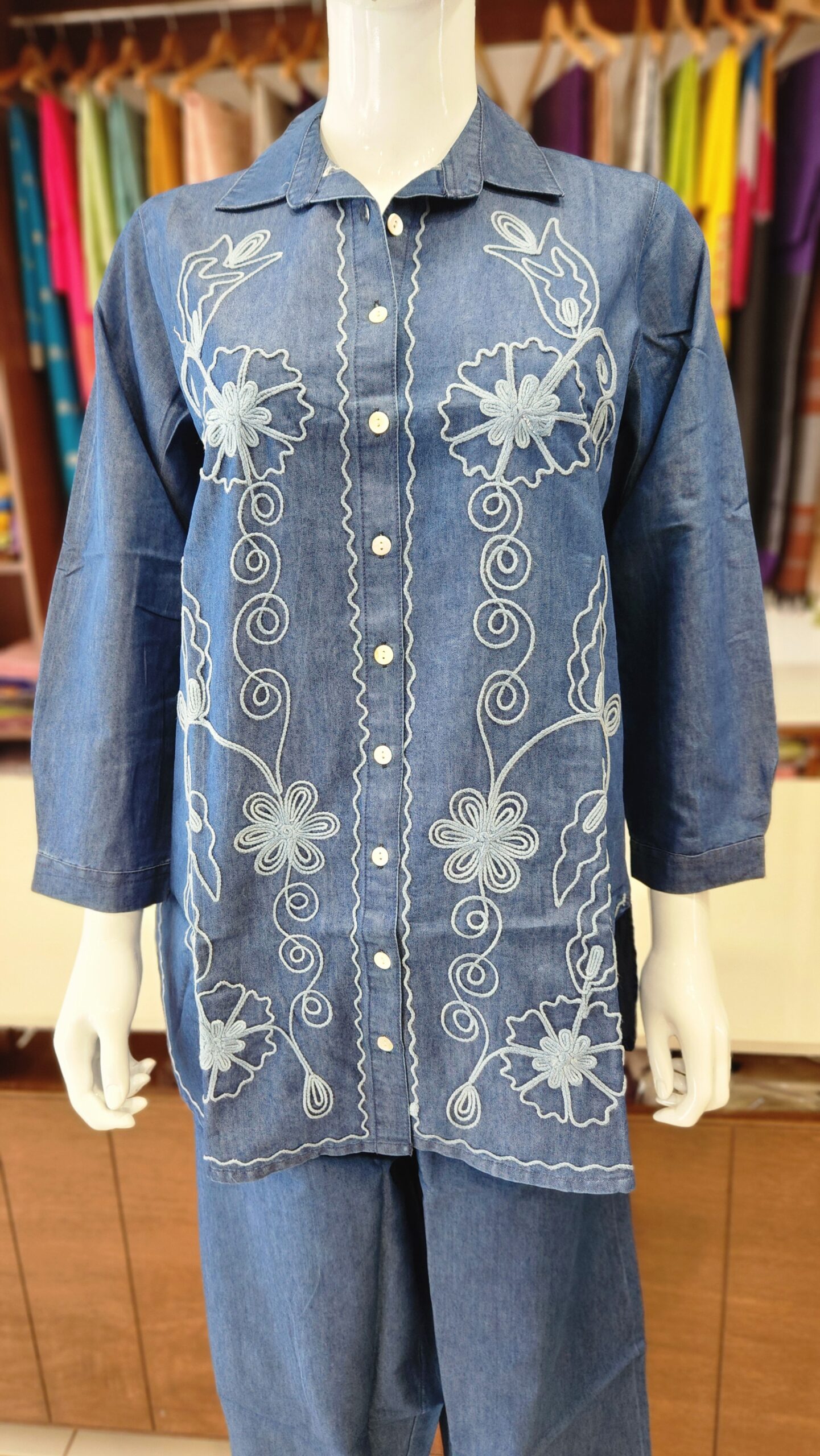 Step into everyday elegance with this denim cord set featuring all-over thread embroidery. Crafted from soft, breathable cotton denim, the set includes a stylishly tailored top and relaxed-fit bottoms—perfectly balancing comfort with artisanal detail. The intricate embroidery adds texture and charm, making it ideal for casual outings, brunches, or smart-casual gatherings.