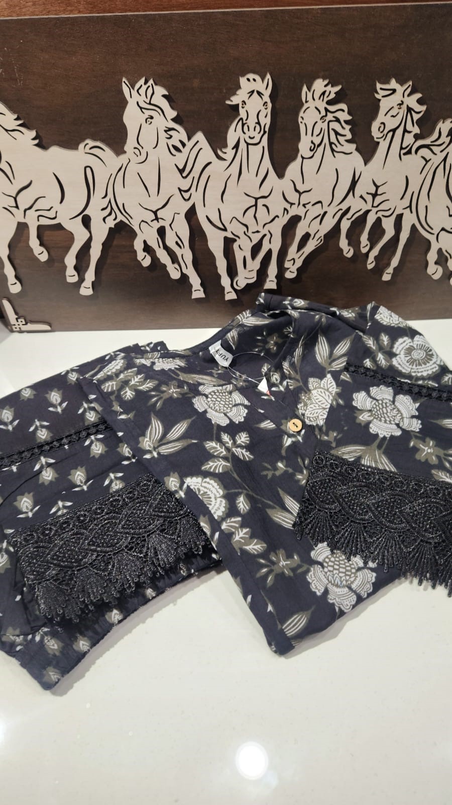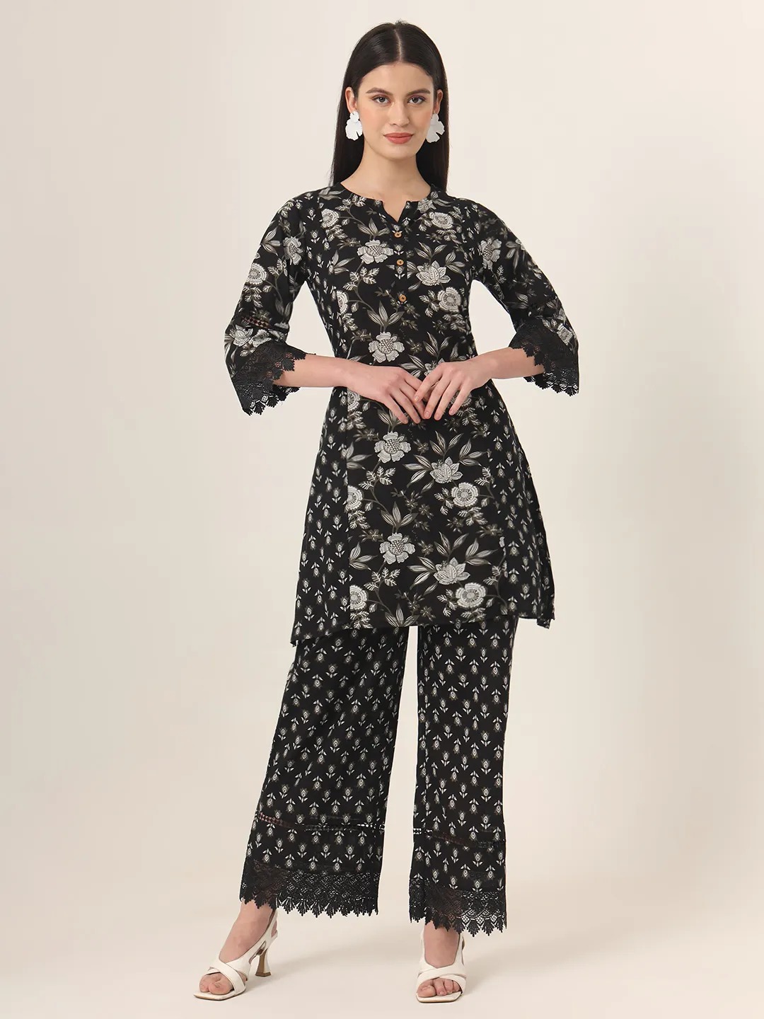 Elevate your everyday ethnic style with this elegant black printed cotton kurta set. The set features a straight-cut kurta adorned with intricate floral prints in shades of white and grey, complemented by delicate lace detailing on the three-quarter sleeves. The accompanying straight-fit pants feature a subtle all-over print and scalloped lace at the hem, adding a graceful touch. Crafted from breathable cotton fabric, this ensemble offers comfort and charm in equal measure — perfect for casual outings, office wear, or festive gatherings.