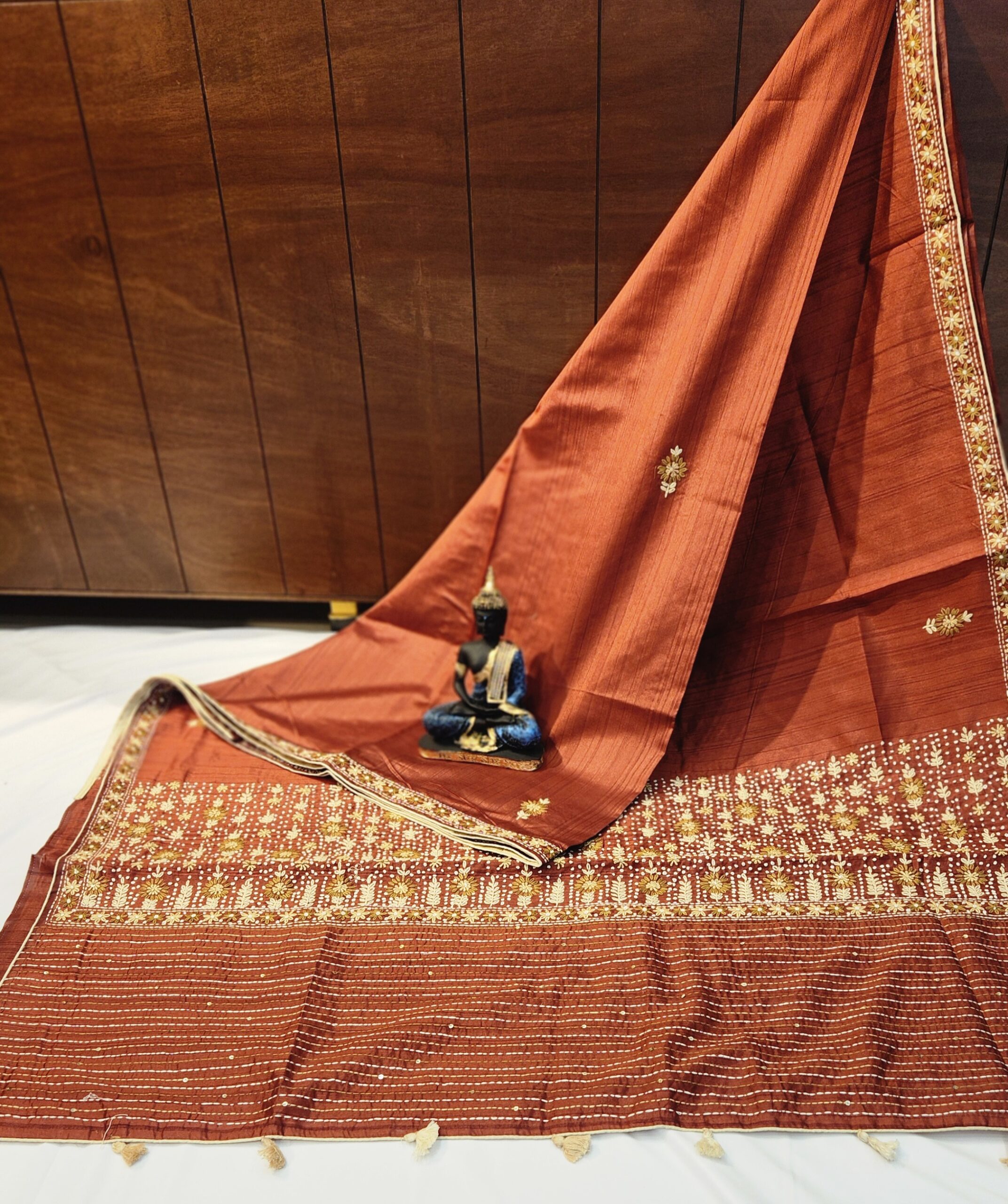 Elevate your ethnic wardrobe with this exquisitely crafted Semi Tussar saree, adorned with intricate hand bullion work on the pallu and matching designer blouse piece. Made from soft semi tussar silk, this saree drapes beautifully, offering a perfect blend of tradition and modern elegance. The handwork on the pallu showcases fine craftsmanship with delicate floral and paisley motifs, ideal for festive gatherings, weddings, and special occasions.