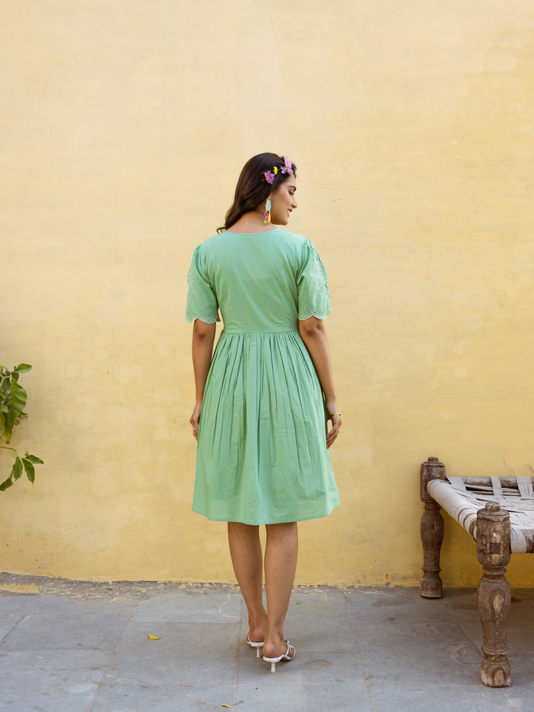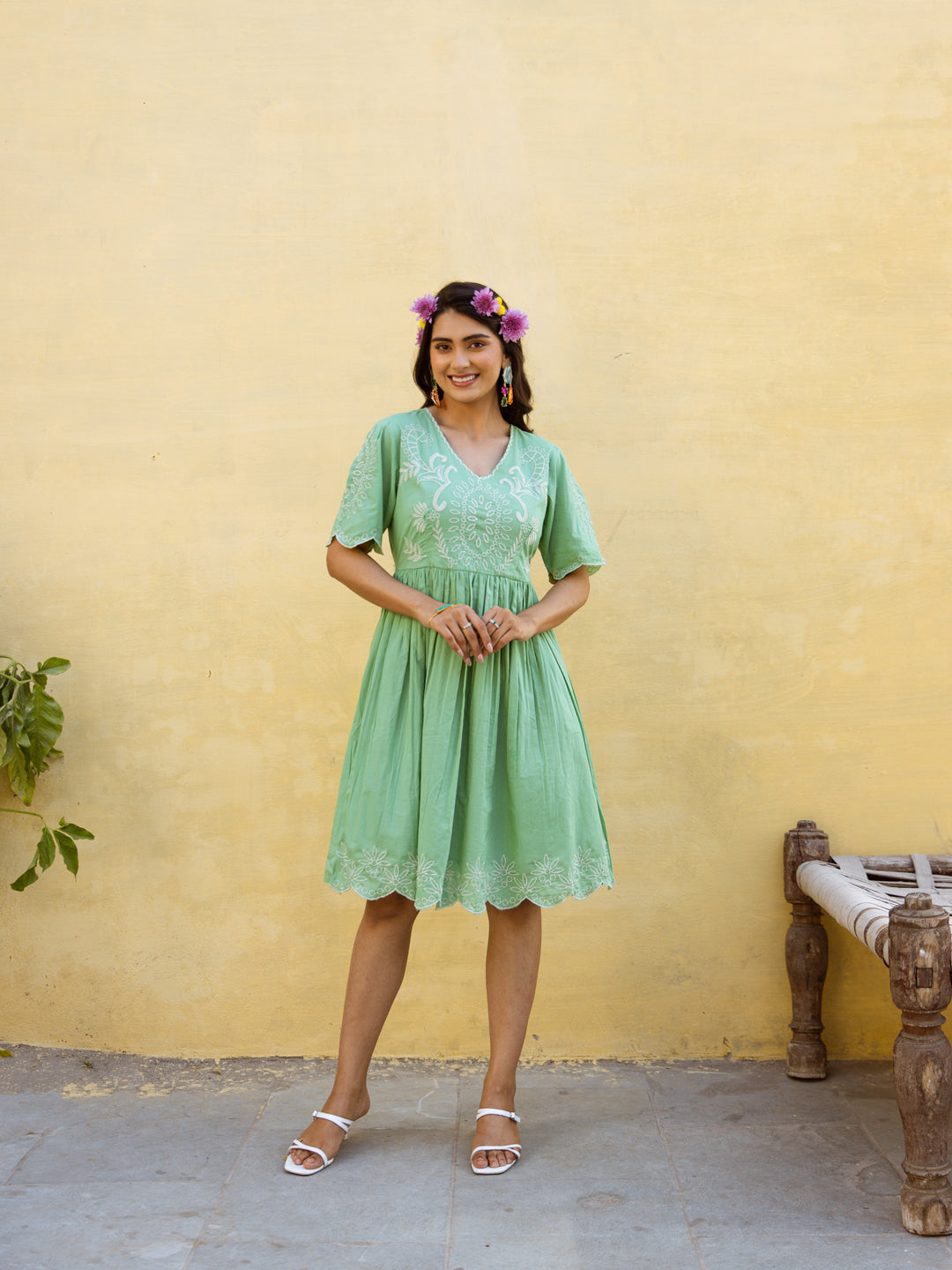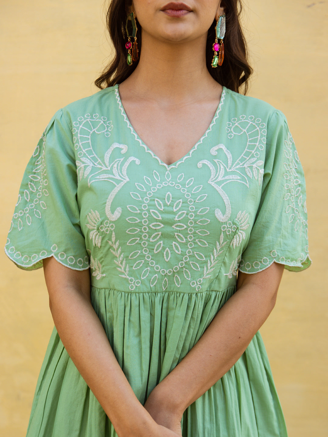 This elegant green dress is beautifully accented with delicate white embroidery, creating a fresh and timeless contrast. Made from soft, breathable fabric, it offers both comfort and style. Perfect for casual outings or festive occasions, this dress combines simplicity with graceful detailing for a refined look.