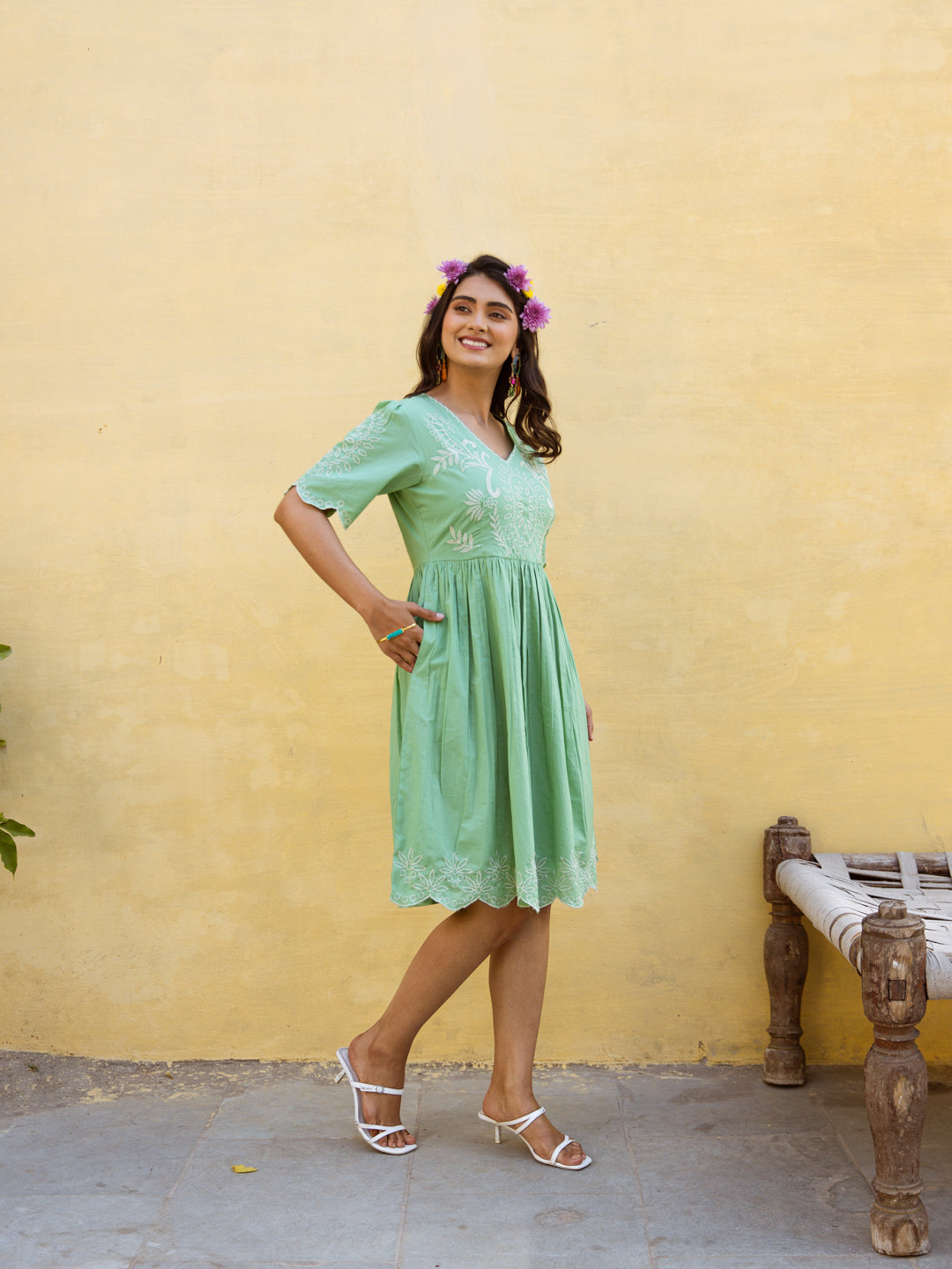 Green Embroidery short Dress