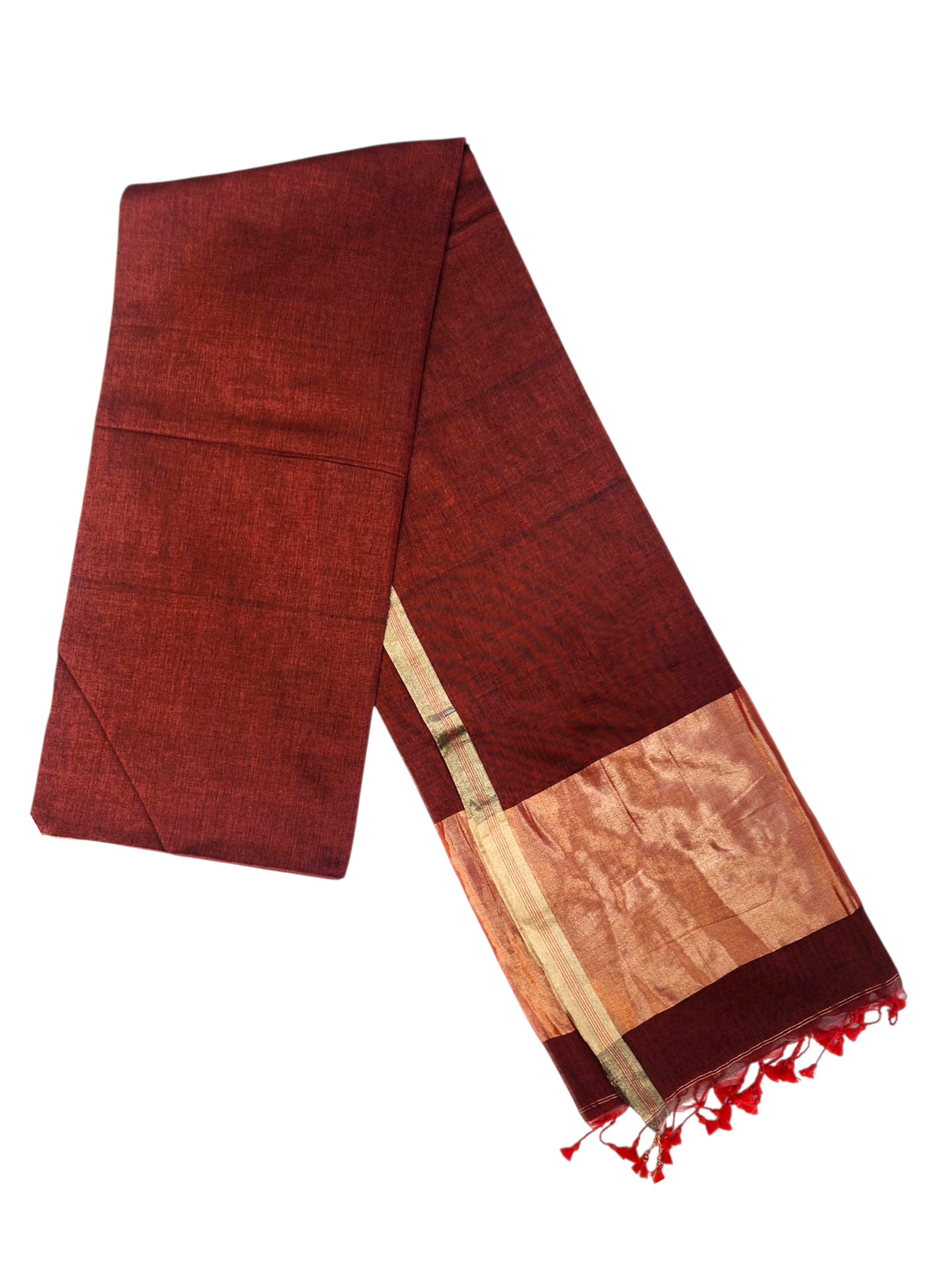 Understated elegance meets subtle shimmer in this handloom mul cotton saree, designed with a rich tissue border and pallu. The body remains gracefully plain, allowing the gentle sheen of tissue to add just the right touch of festive flair. Feather-light, breathable, and supremely soft—this saree is perfect for both everyday sophistication and graceful gatherings.