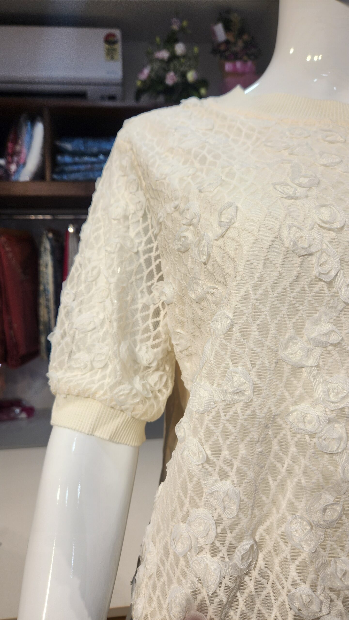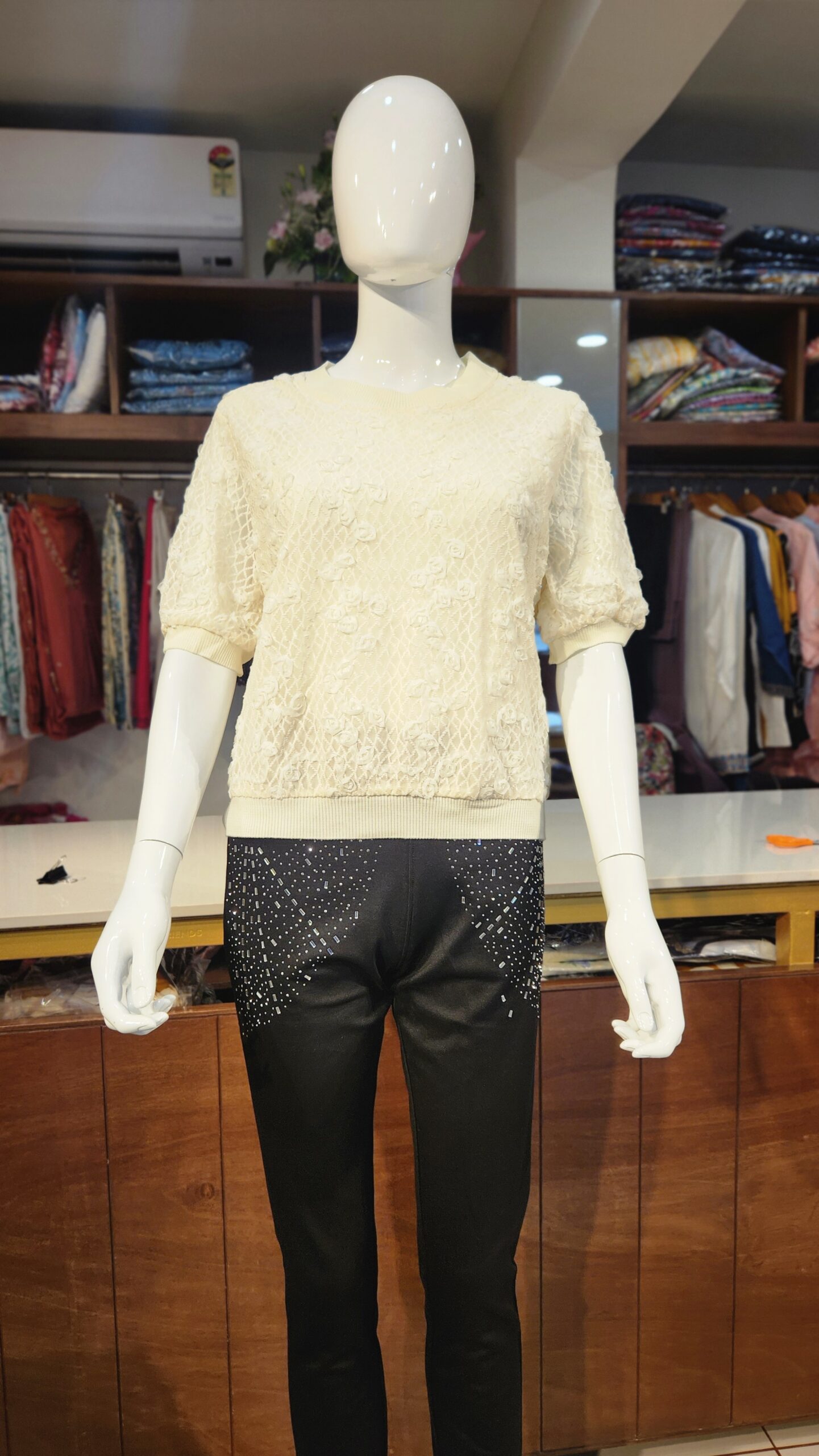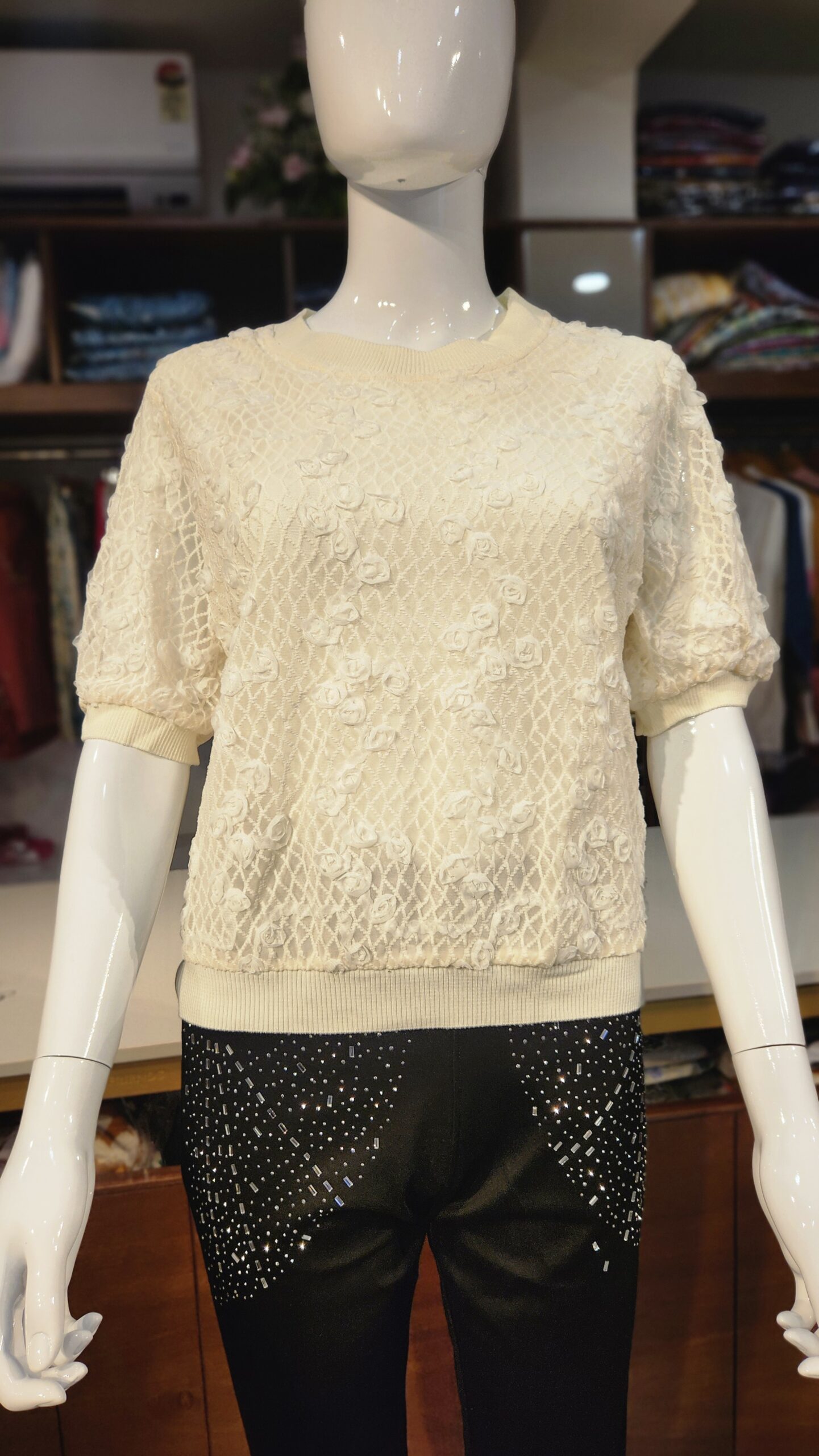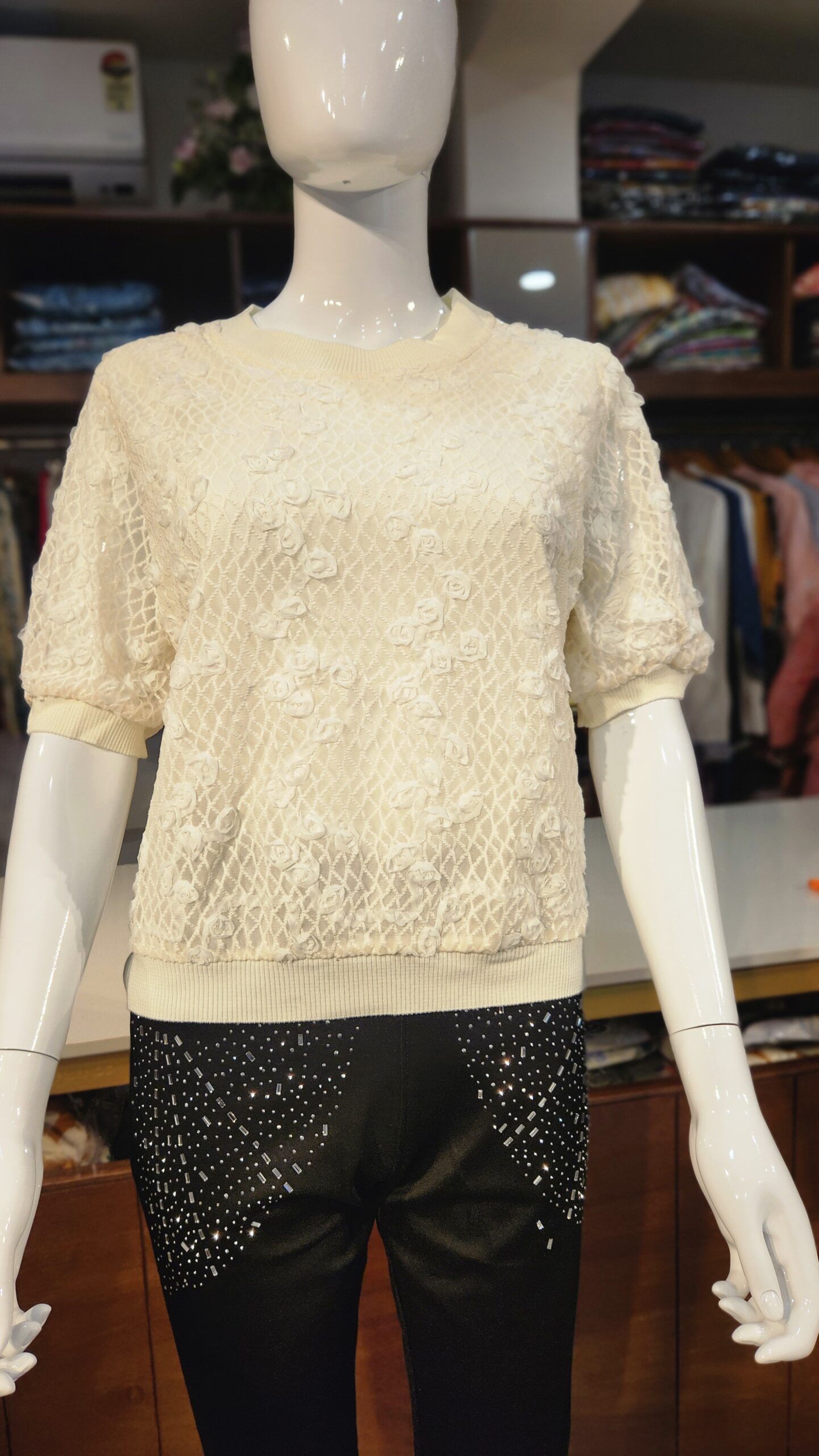 Elevate your everyday elegance with this ivory textured top, crafted with intricate 3D floral detailing over a delicate mesh pattern. The soft knit edges at the neck, sleeves, and hem provide a snug fit while maintaining a relaxed, cozy silhouette. Perfect for pairing with fitted trousers or skirts, this top brings a graceful charm to both casual and semi-formal occasions. Its subtle sophistication makes it a versatile piece for every fashion-forward wardrobe.