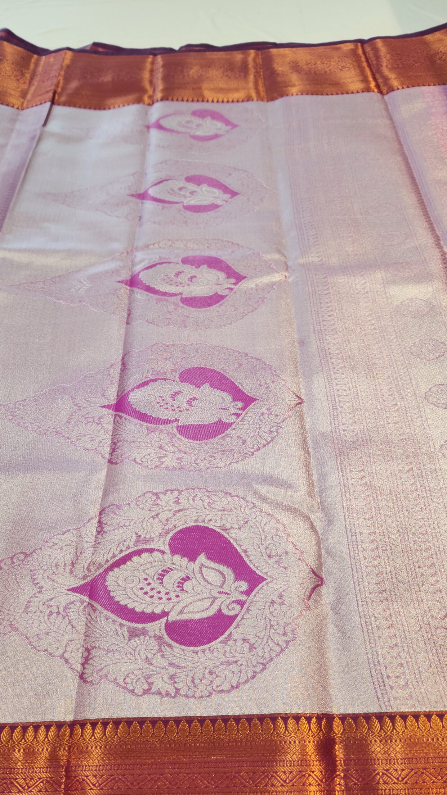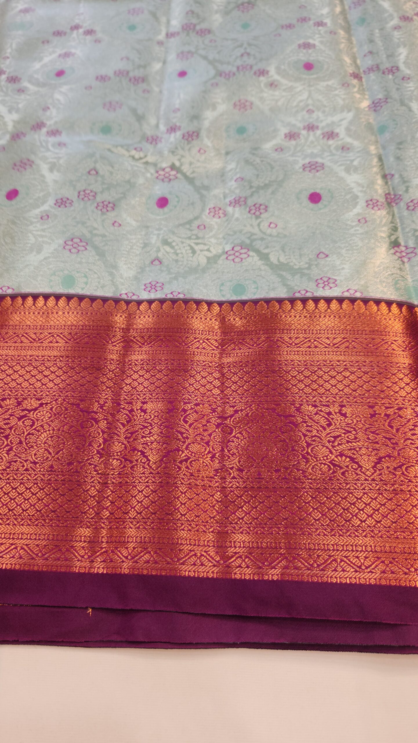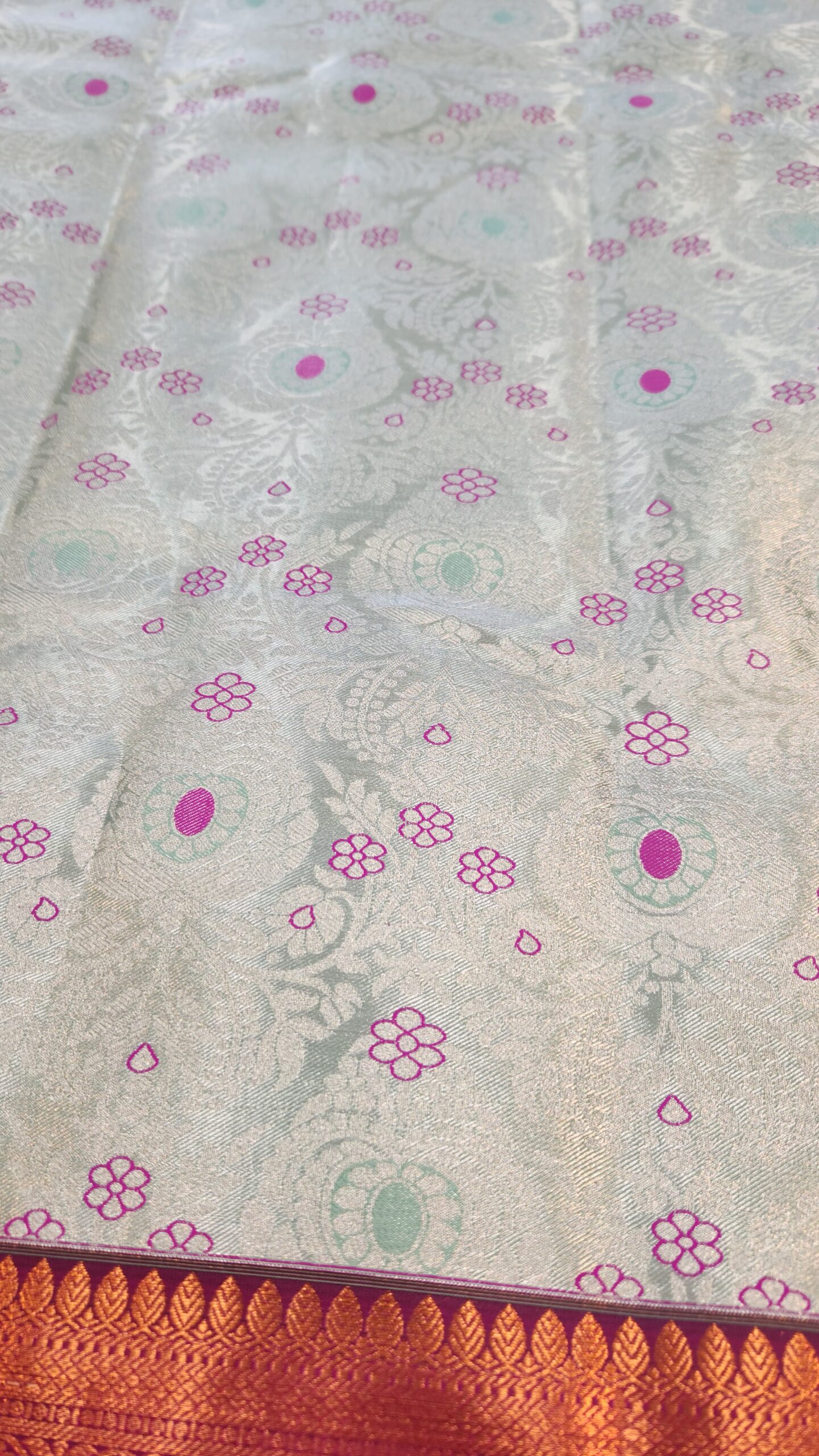 Step into timeless grandeur with this exquisite Heavy Brocade Kanchi Silk Saree, richly woven with intricate Meena work. A masterpiece of craftsmanship, this saree features luxurious silk threads interlaced with vibrant meenakari detailing, creating a tapestry of tradition and opulence. The heavy brocade body is adorned with elaborate floral and paisley motifs, perfectly complemented by a contrasting zari-woven pallu and an elegant blouse piece. Ideal for weddings, festive occasions, and special ceremonies, this saree is a regal addition to any ethnic wardrobe.