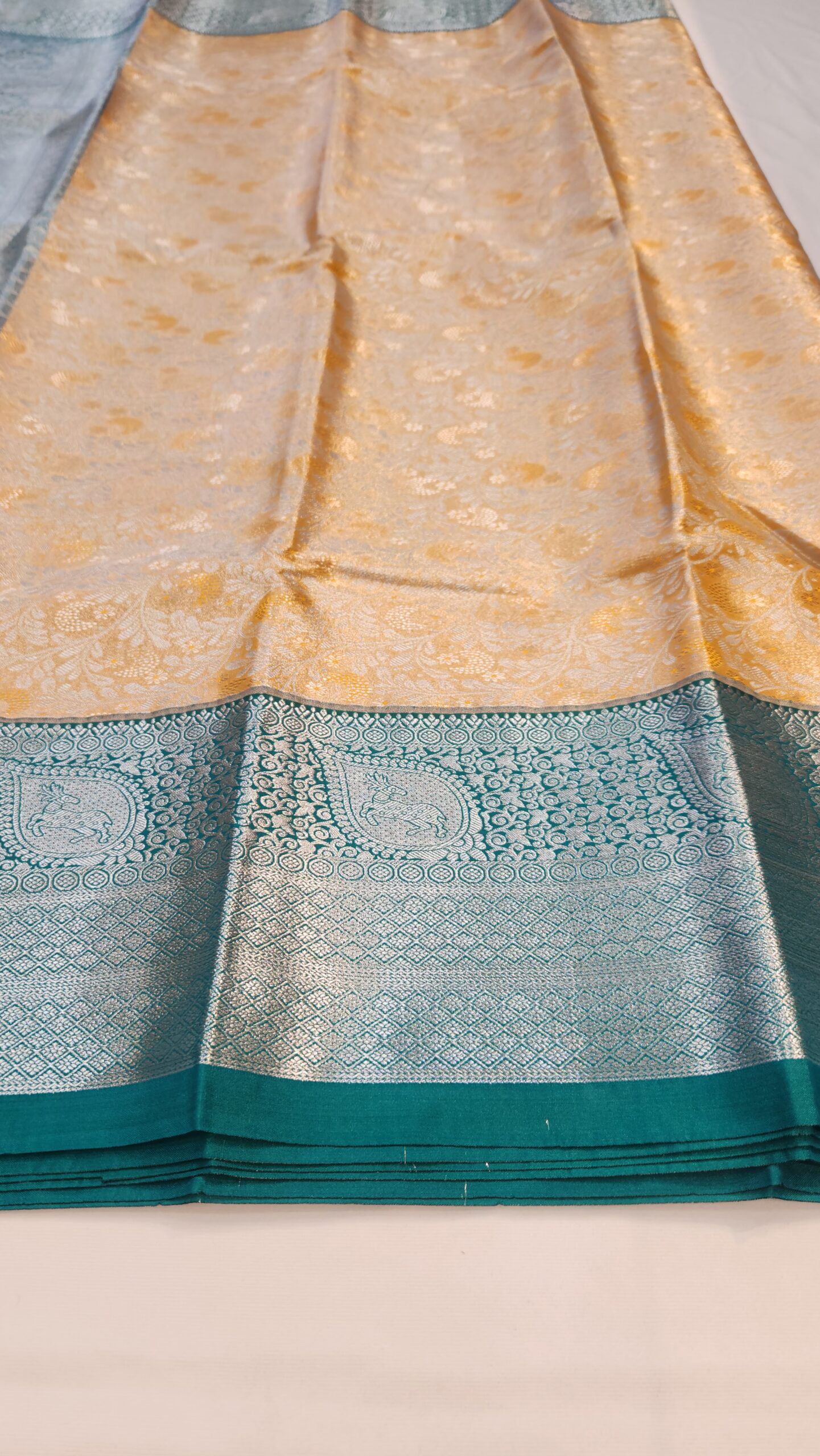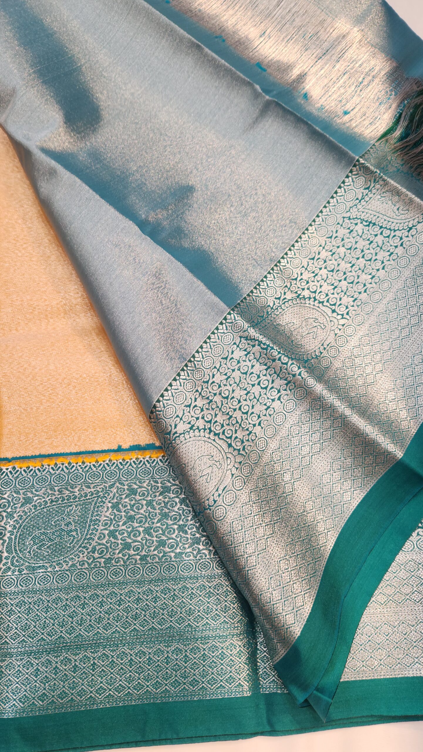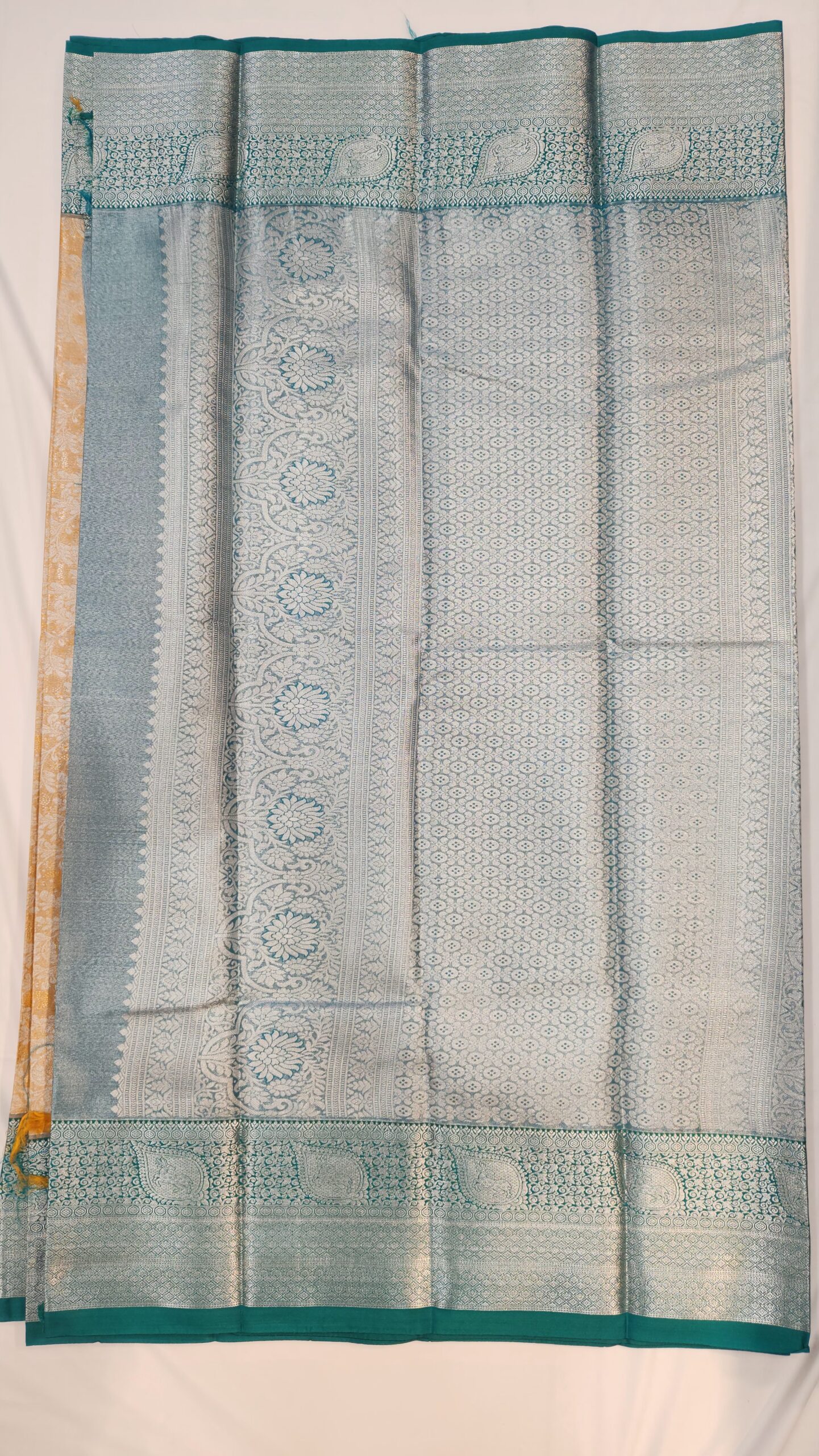 Step into timeless grandeur with this exquisite Heavy Brocade Kanchi Silk Saree, richly woven with intricate Meena work. A masterpiece of craftsmanship, this saree features luxurious silk threads interlaced with vibrant meenakari detailing, creating a tapestry of tradition and opulence. The heavy brocade body is adorned with elaborate floral and paisley motifs, perfectly complemented by a contrasting zari-woven pallu and an elegant blouse piece. Ideal for weddings, festive occasions, and special ceremonies, this saree is a regal addition to any ethnic wardrobe.