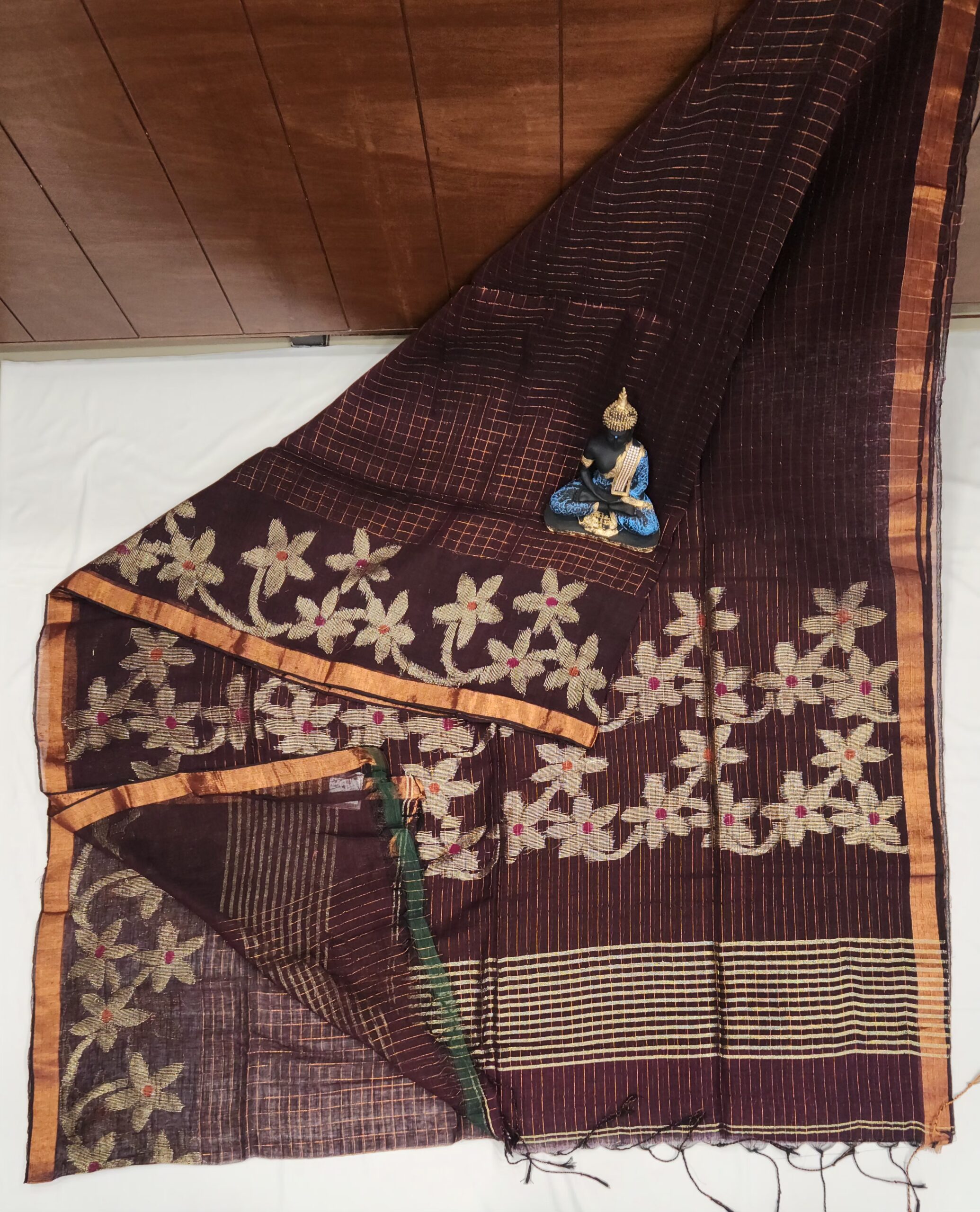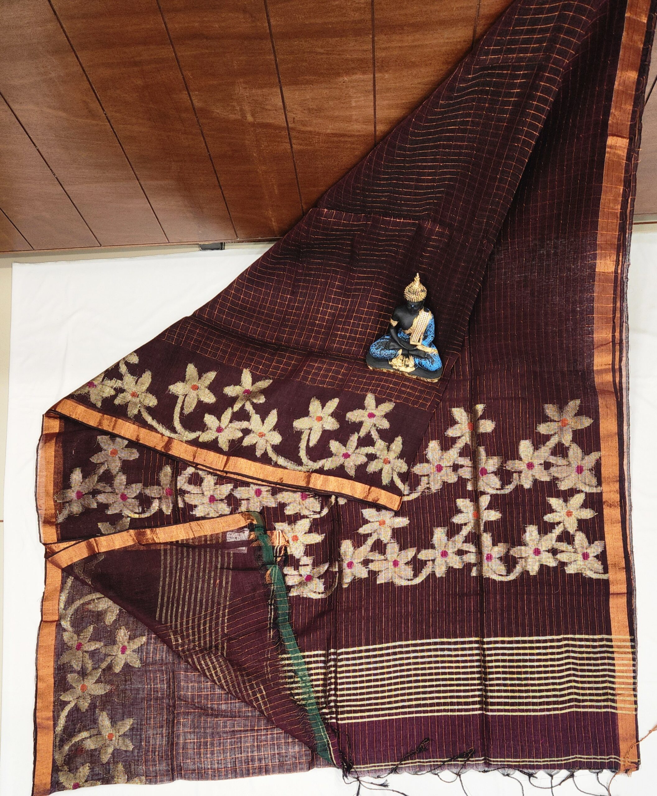 Embrace understated elegance with this Linen Saree adorned with intricate jari floral weaving. The soft, breathable texture of pure linen is beautifully complemented by delicate zari-woven floral patterns that add a subtle shimmer. Lightweight yet graceful, this saree is perfect for daytime celebrations, festive brunches, or elegant office wear. Comes with a matching blouse piece for a complete look.