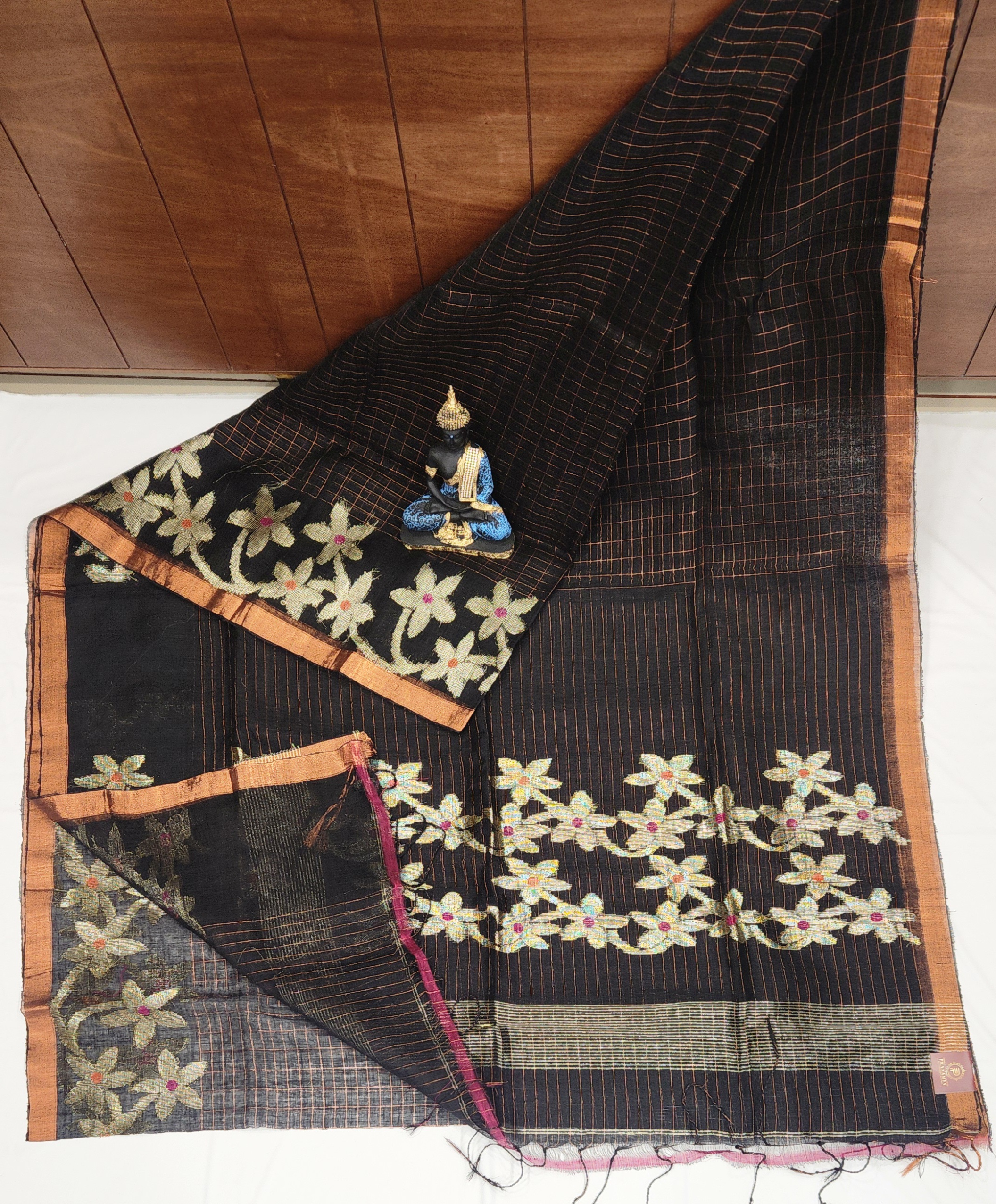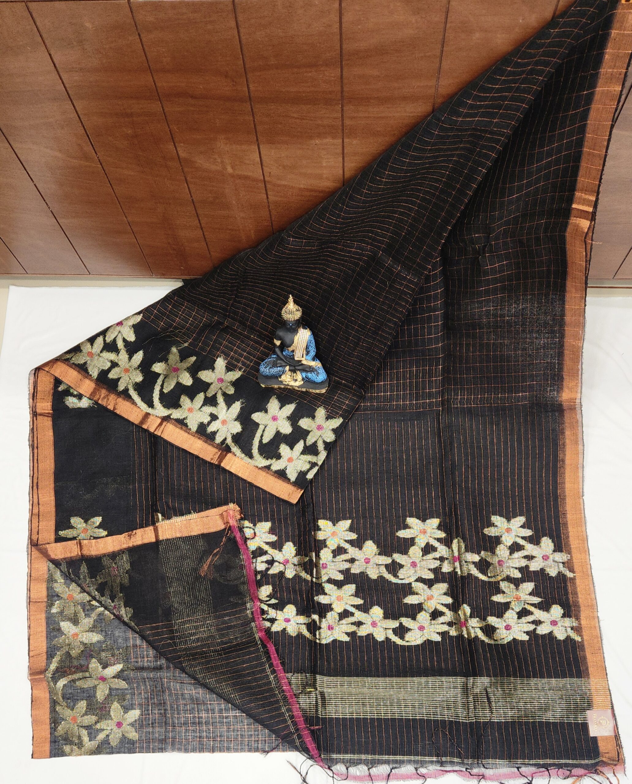 Linen checks saree with floral weaving in jari