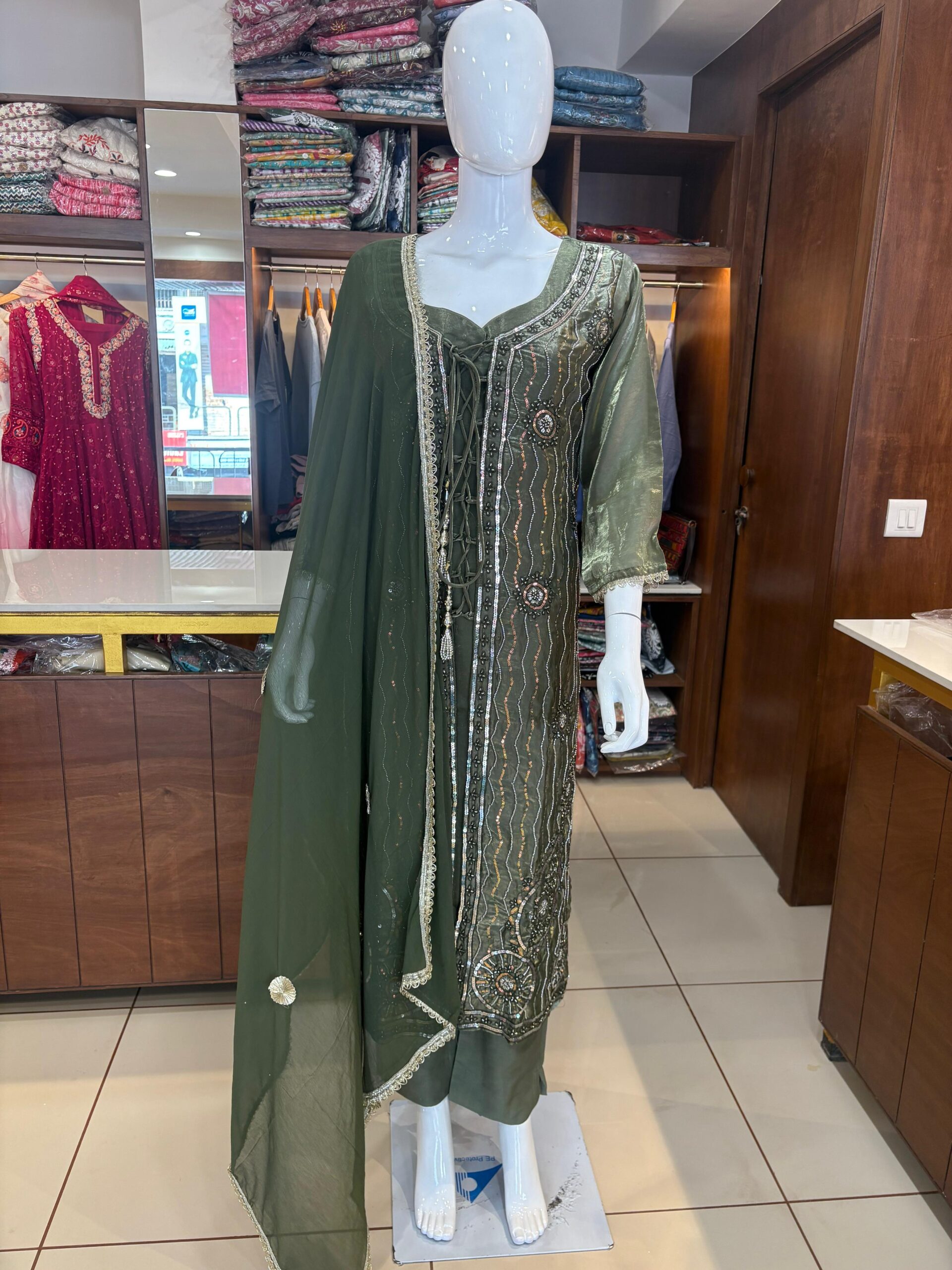 Exude regal elegance in this exquisite Olive Green Fendi Silk 3-Piece Suit, a masterpiece designed for luxurious festive wear. The kurta is crafted from sumptuous Fendi silk, offering a rich drape and a subtle sheen. It is adorned with opulent, heavy embroidery across the front, featuring a sophisticated blend of zardozi, sequin, and intricate thread work arranged in circular motifs and vertical patterns. The sheer sleeves are finished with delicate embellished cuffs. The set includes matching solid green bottoms and a sheer dupatta with a decorative gold lace border and scattered motifs, completing the look with grace. This suit is a perfect choice for weddings, formal gatherings, and special celebrations where you want to make a lasting impression.