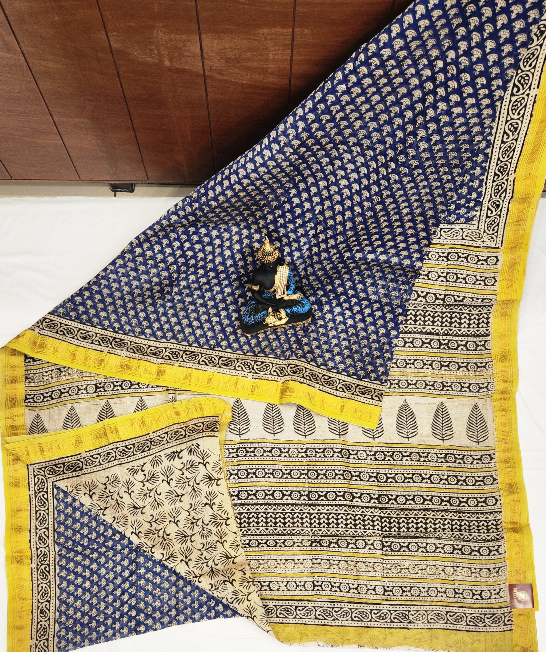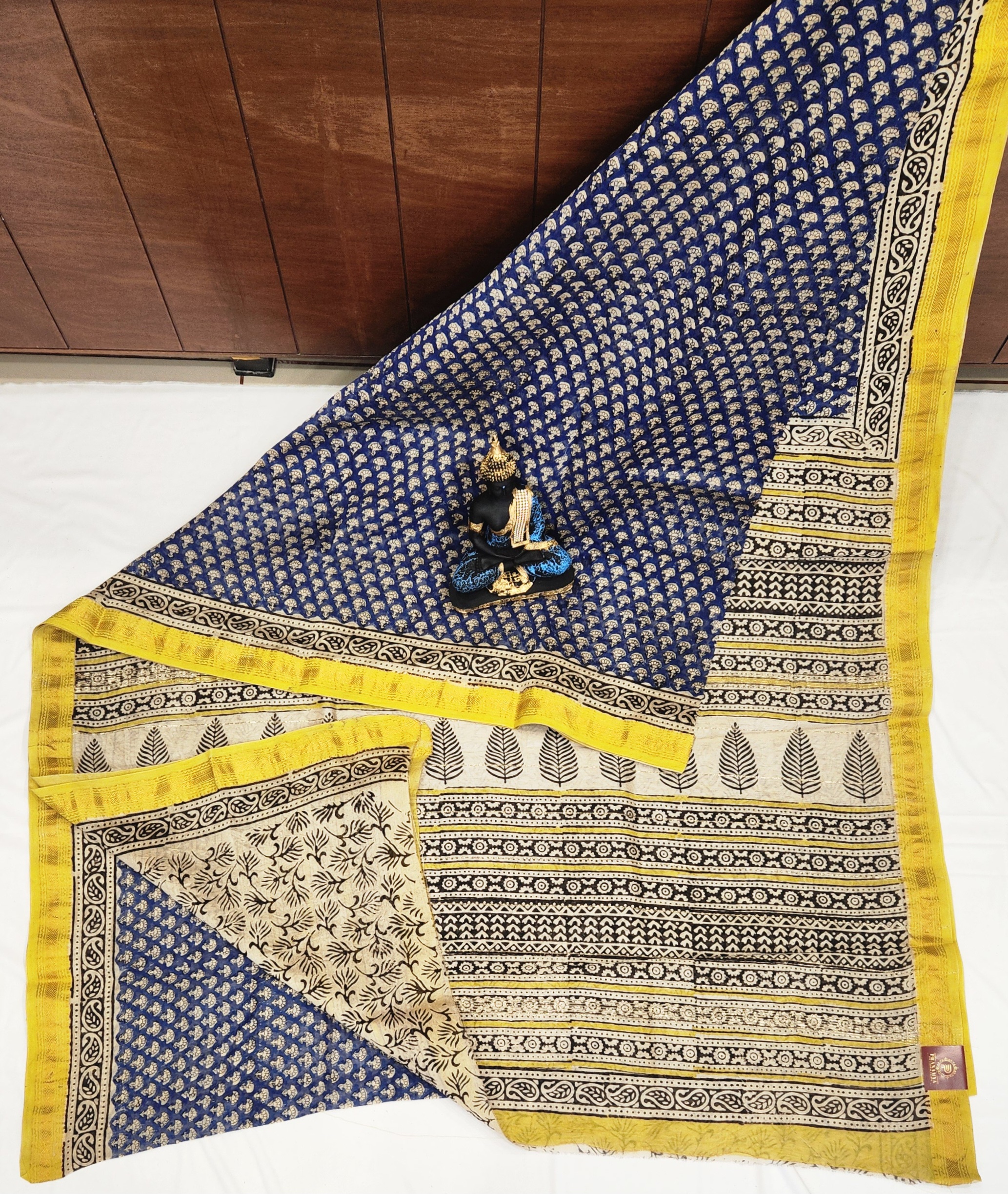 Maheshwari silk saree with traditional hand Bagru prints, zari border, and soft, elegant drape—perfect for artistic festive looks.
