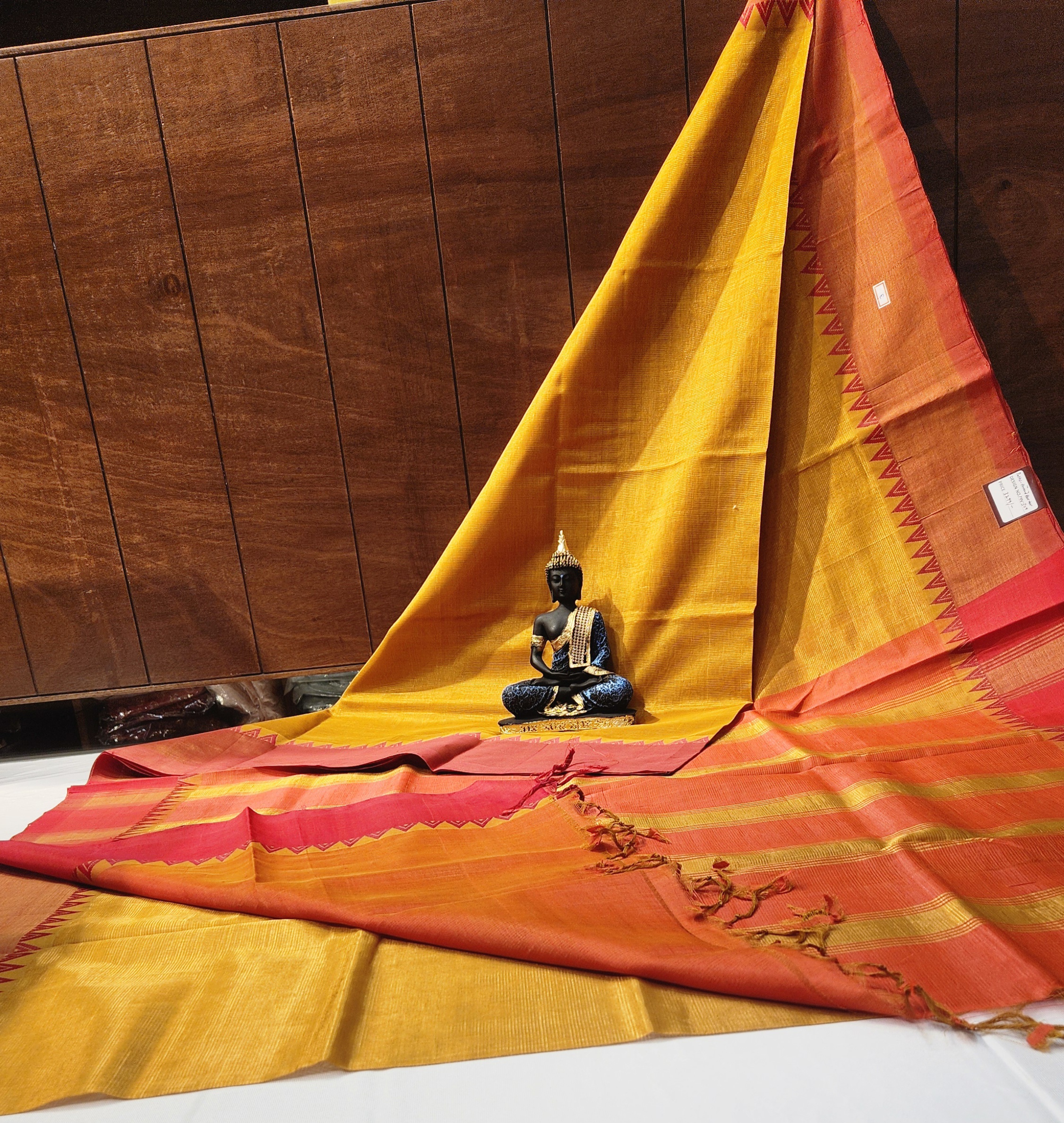 This Mangalgiri silk saree with its vivid contrast pallu and classic thread temple border is a tribute to handwoven heritage.