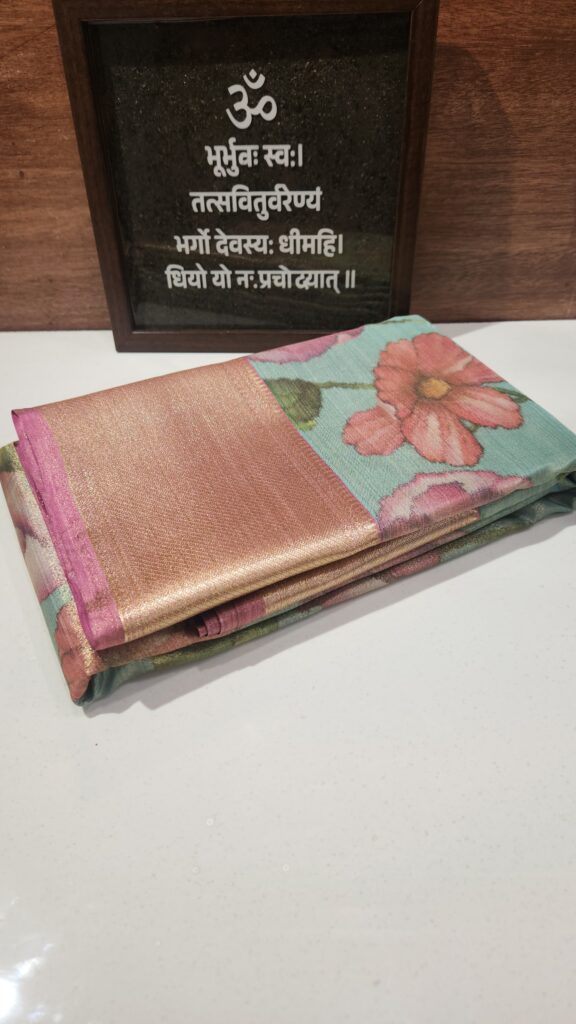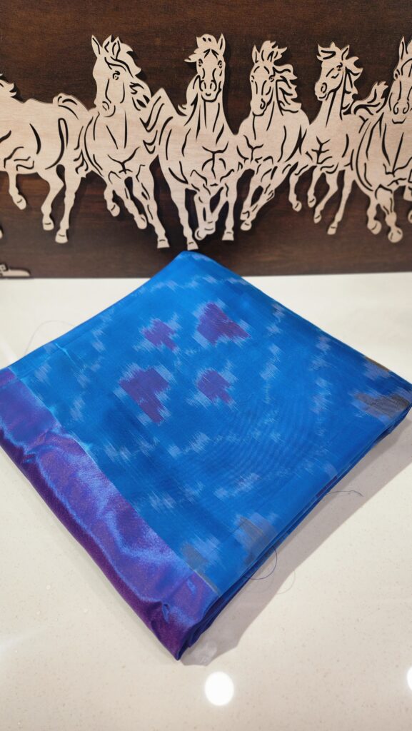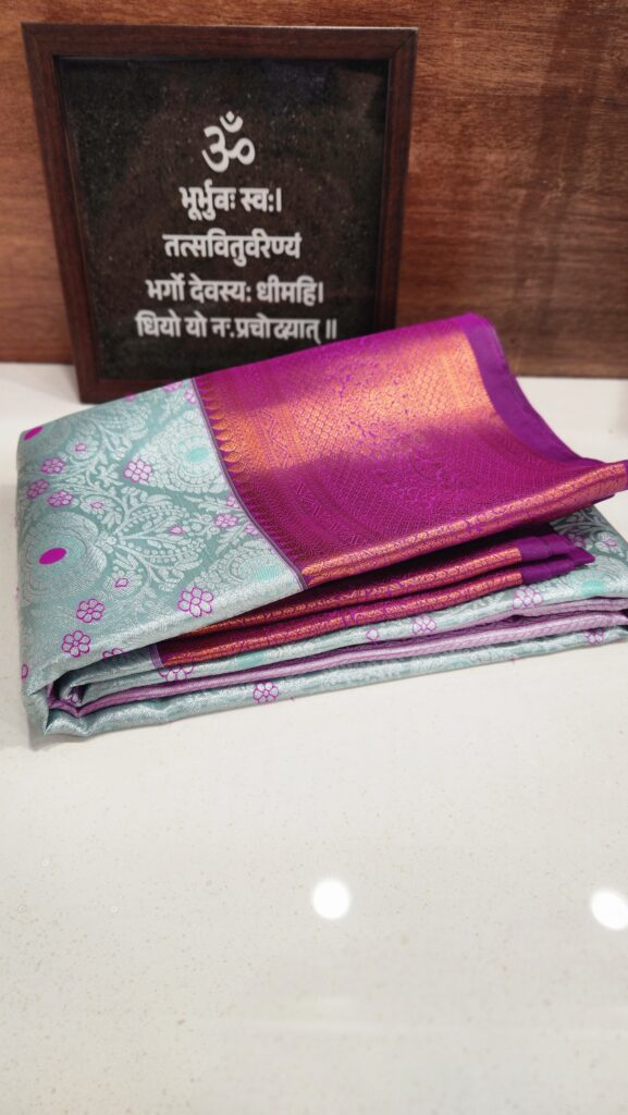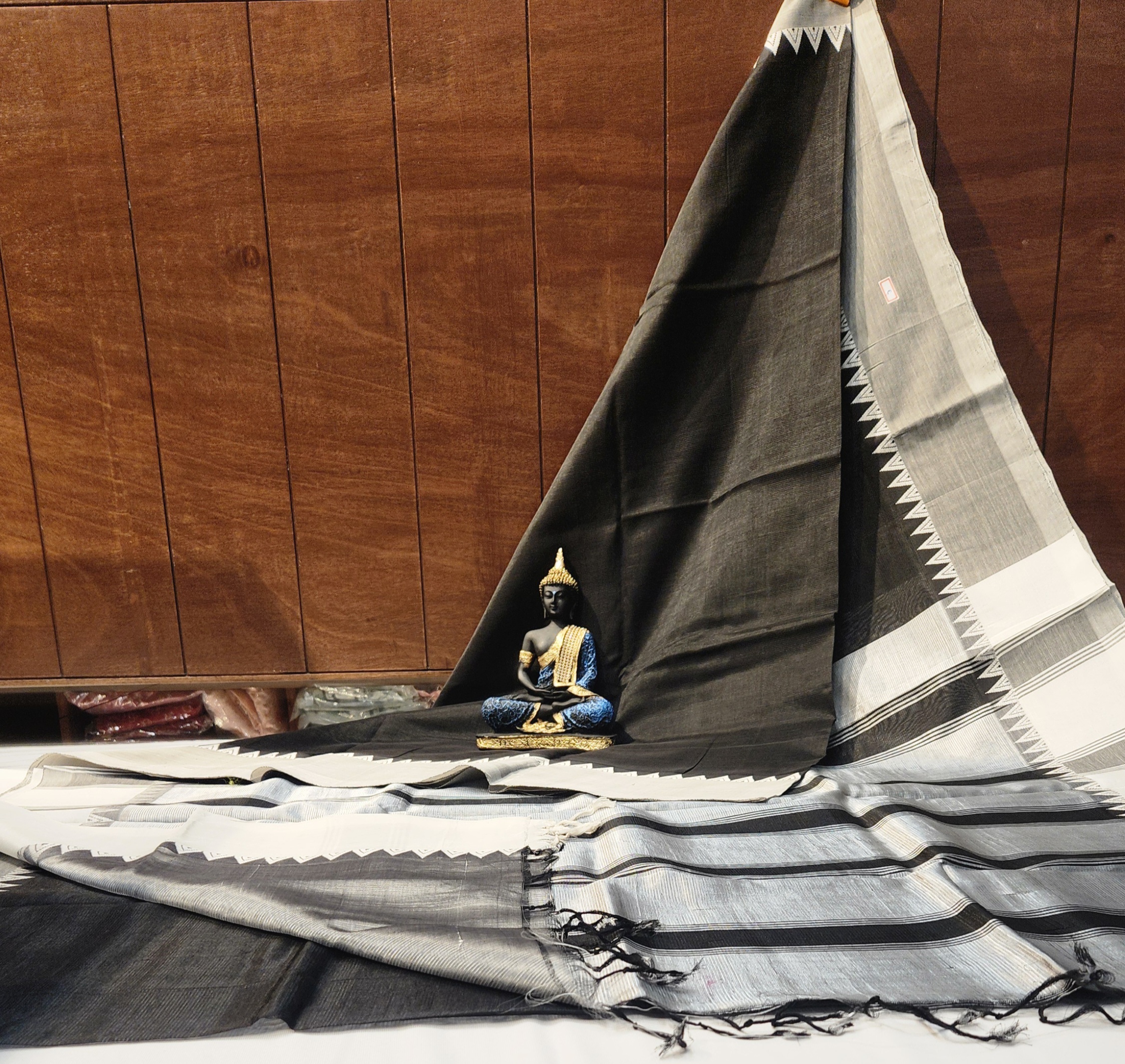 This Mangalgiri silk saree with its vivid contrast pallu and classic thread temple border is a tribute to handwoven heritage.