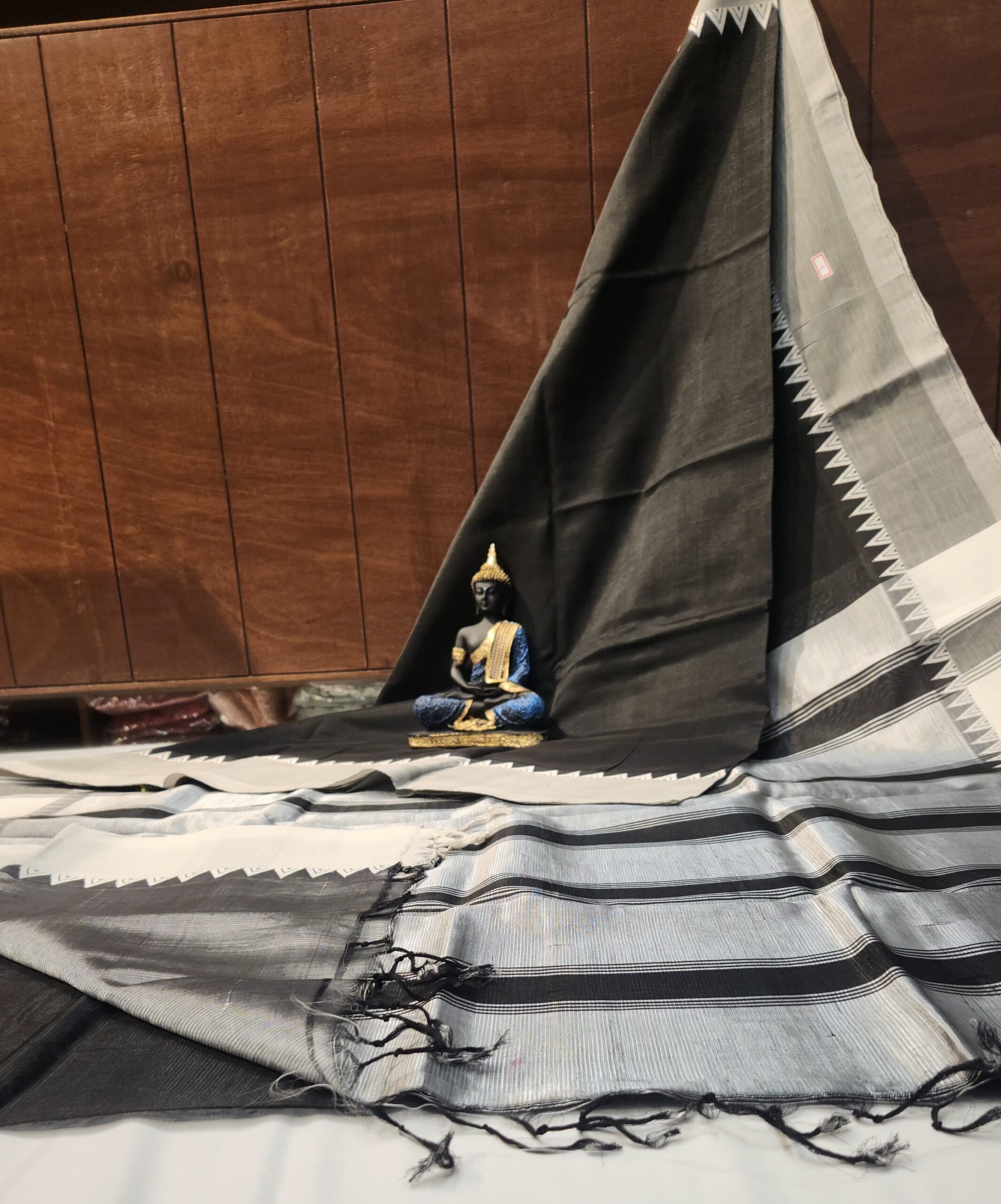 Gracefully handwoven in the heart of Andhra Pradesh, this Mangalgiri silk saree is a celebration of tradition and craftsmanship. Crafted from fine silk, it features a beautifully contrasting pallu that adds depth and drama. The standout element—the intricate thread temple border—enhances its elegance, making it perfect for festive occasions and intimate celebrations. Lightweight, lustrous, and timeless, this saree drapes like a dream.