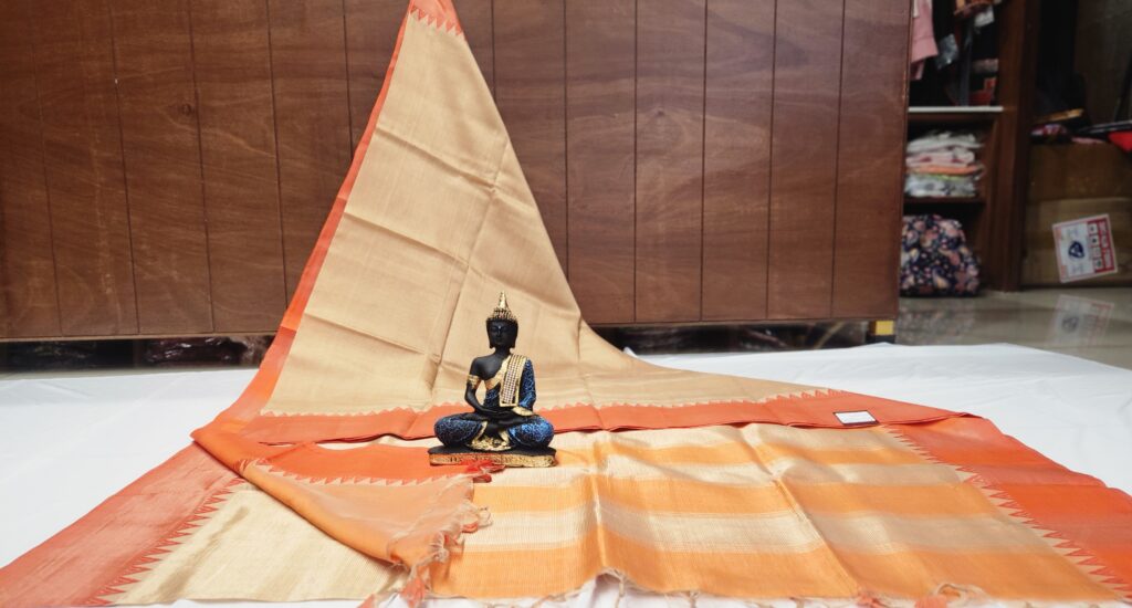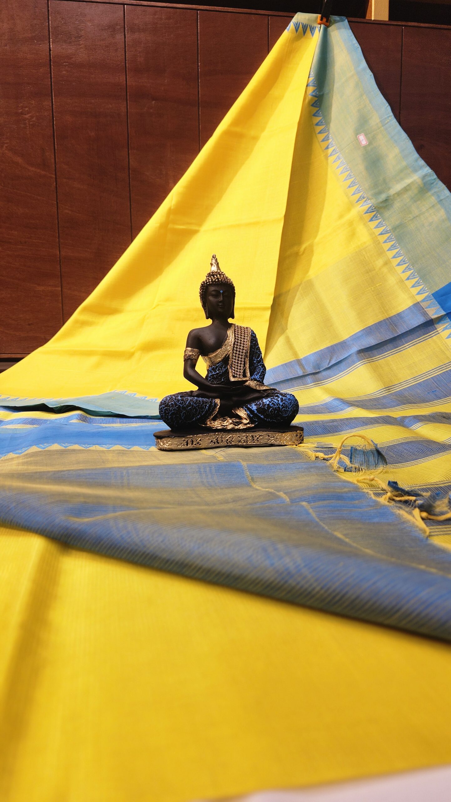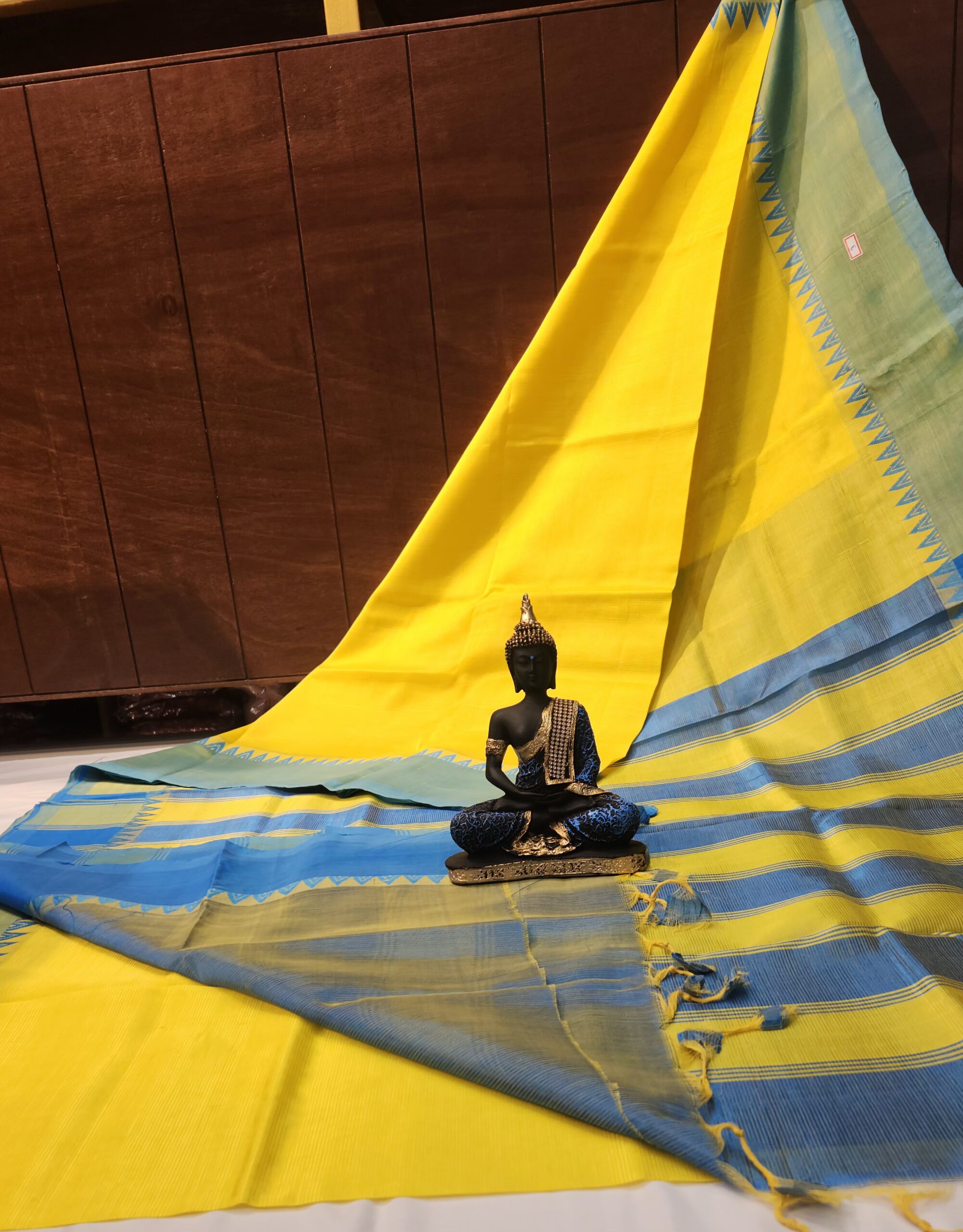 This Mangalgiri silk saree with its vivid contrast pallu and classic thread temple border is a tribute to handwoven heritage.