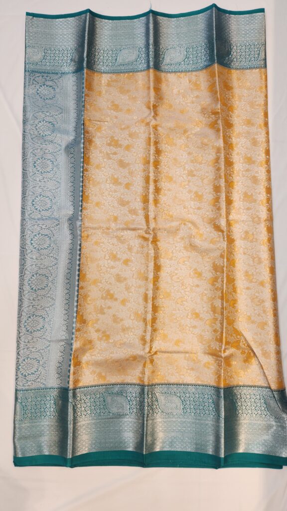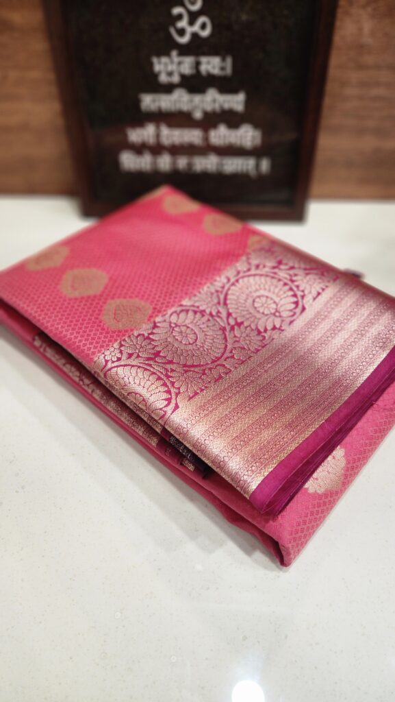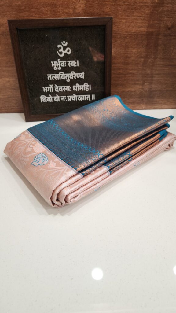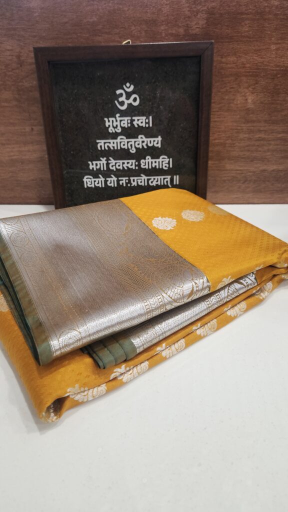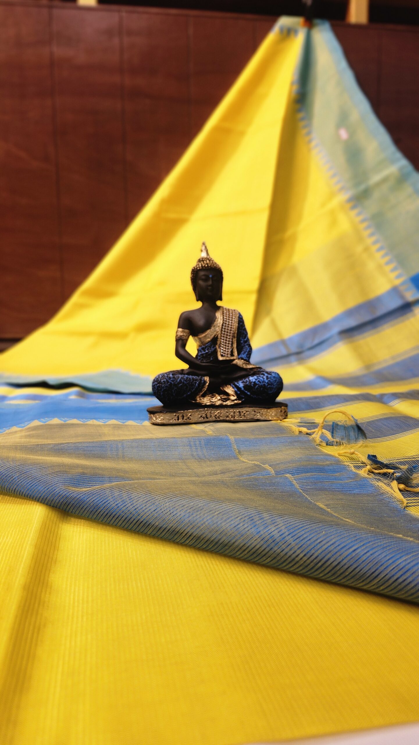This Mangalgiri silk saree with its vivid contrast pallu and classic thread temple border is a tribute to handwoven heritage.