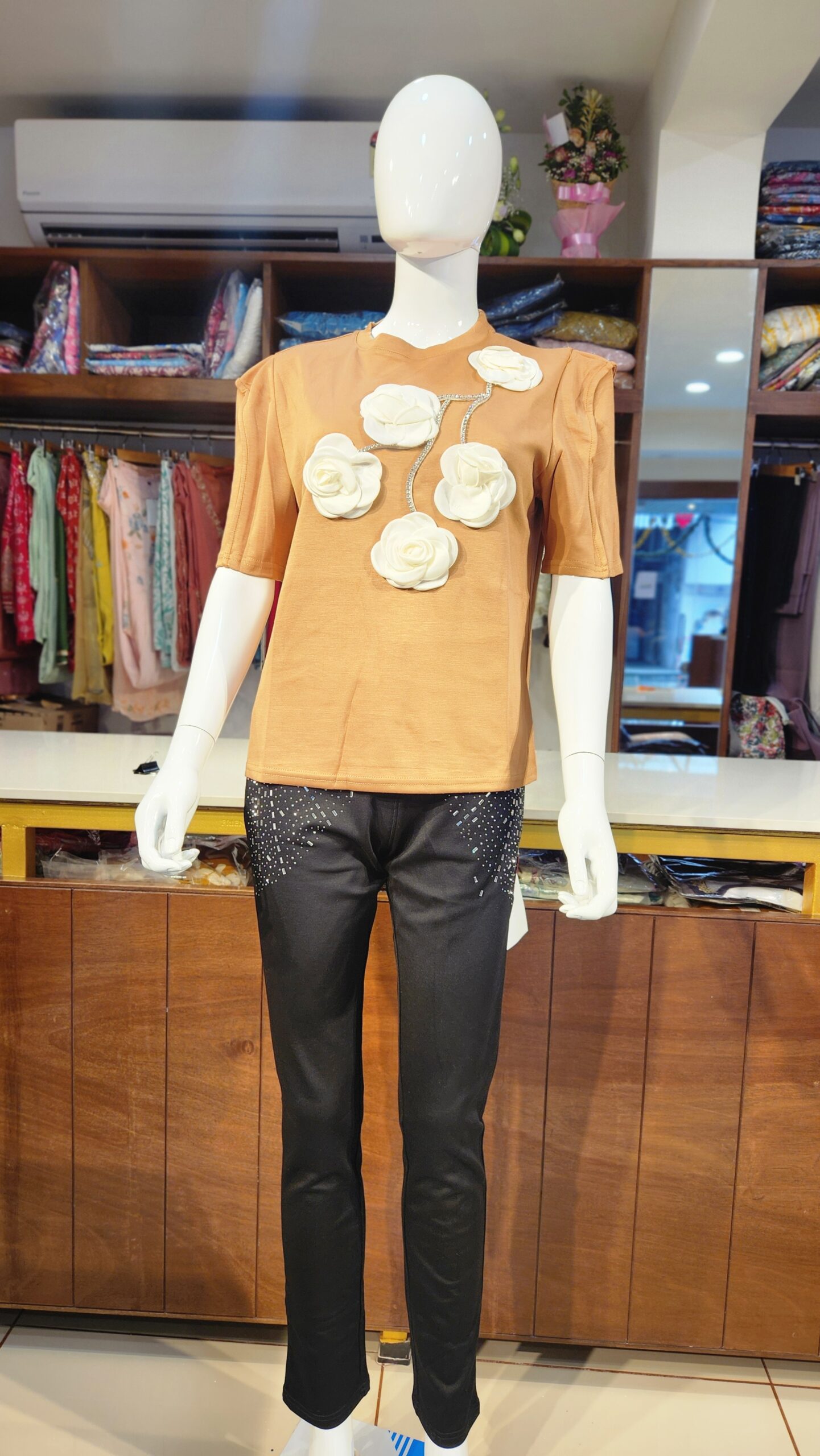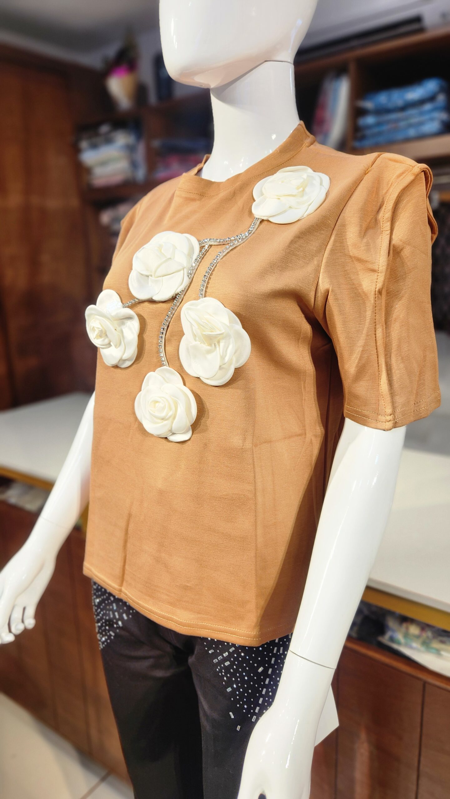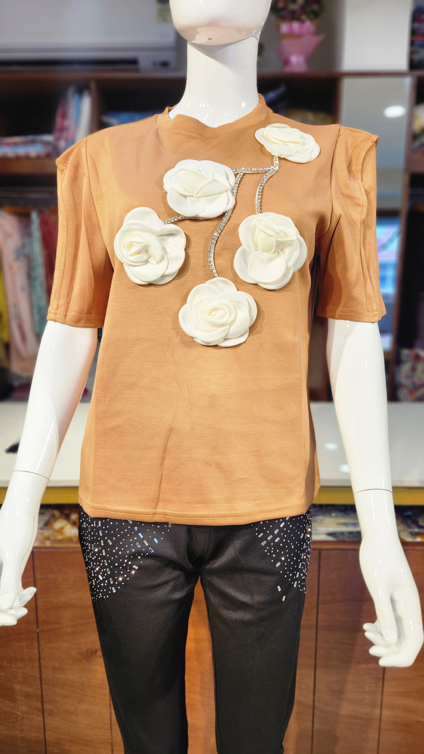 Add a touch of elegance to your casual wear with this chic Caramel Brown T-Shirt, featuring stunning 3D white rose appliqués and delicate rhinestone vine detailing. Crafted from soft, breathable cotton-blend fabric, this half-sleeve tee offers both comfort and contemporary flair. The structured floral embellishments give it a bold, artistic vibe—perfect for brunches, day-outs, or casual evenings with friends.