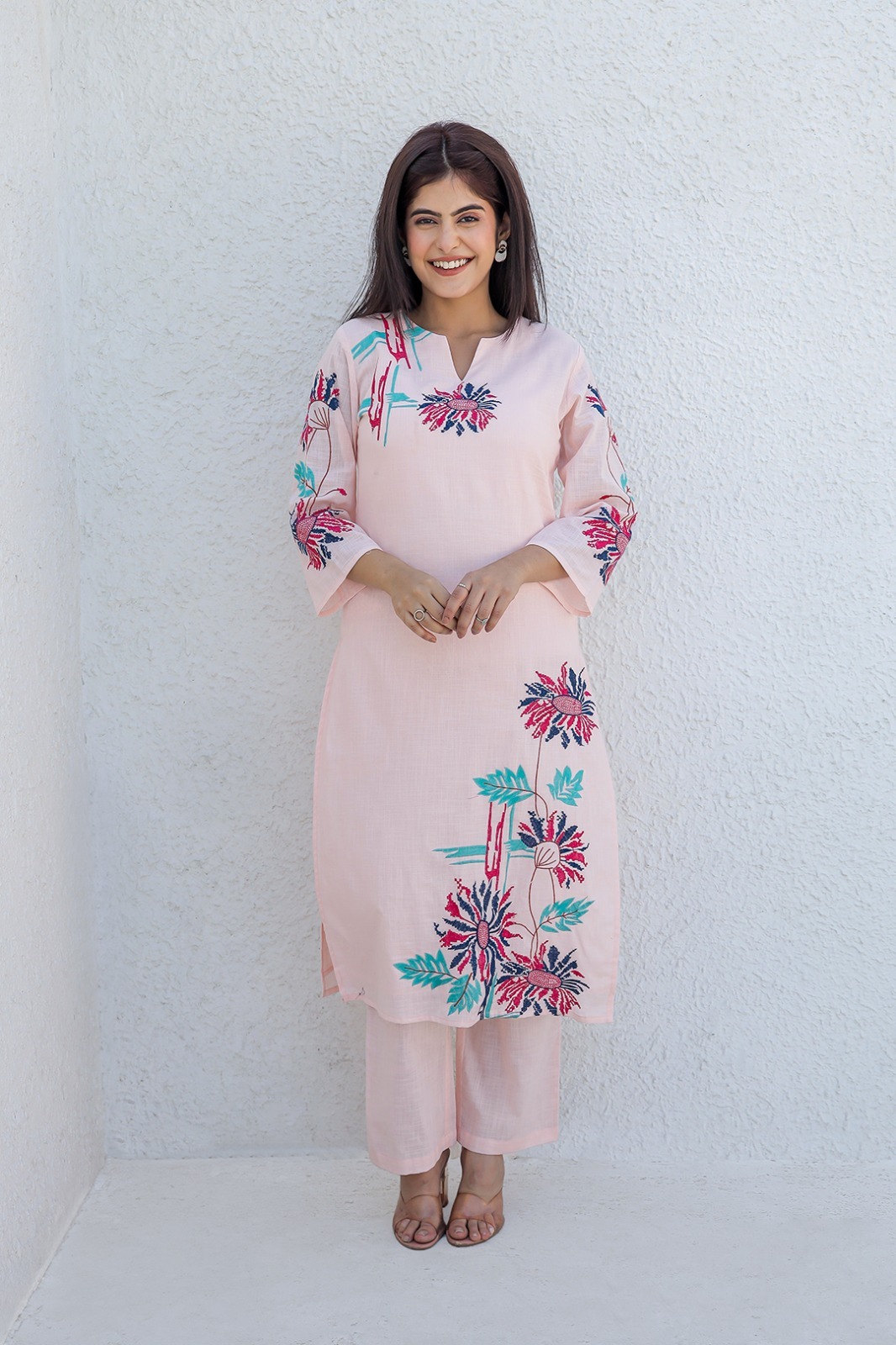 Effortless elegance meets everyday comfort in this Premium Cotton Kurta Set, crafted from breathable, high-quality cotton. Adorned with delicate fine embroidery on the yoke and sleeves, the kurta features a flattering silhouette that transitions seamlessly from casual brunches to festive gatherings. Paired with a coordinated bottom and a soft dupatta, this 2-piece set is a timeless addition to your wardrobe.