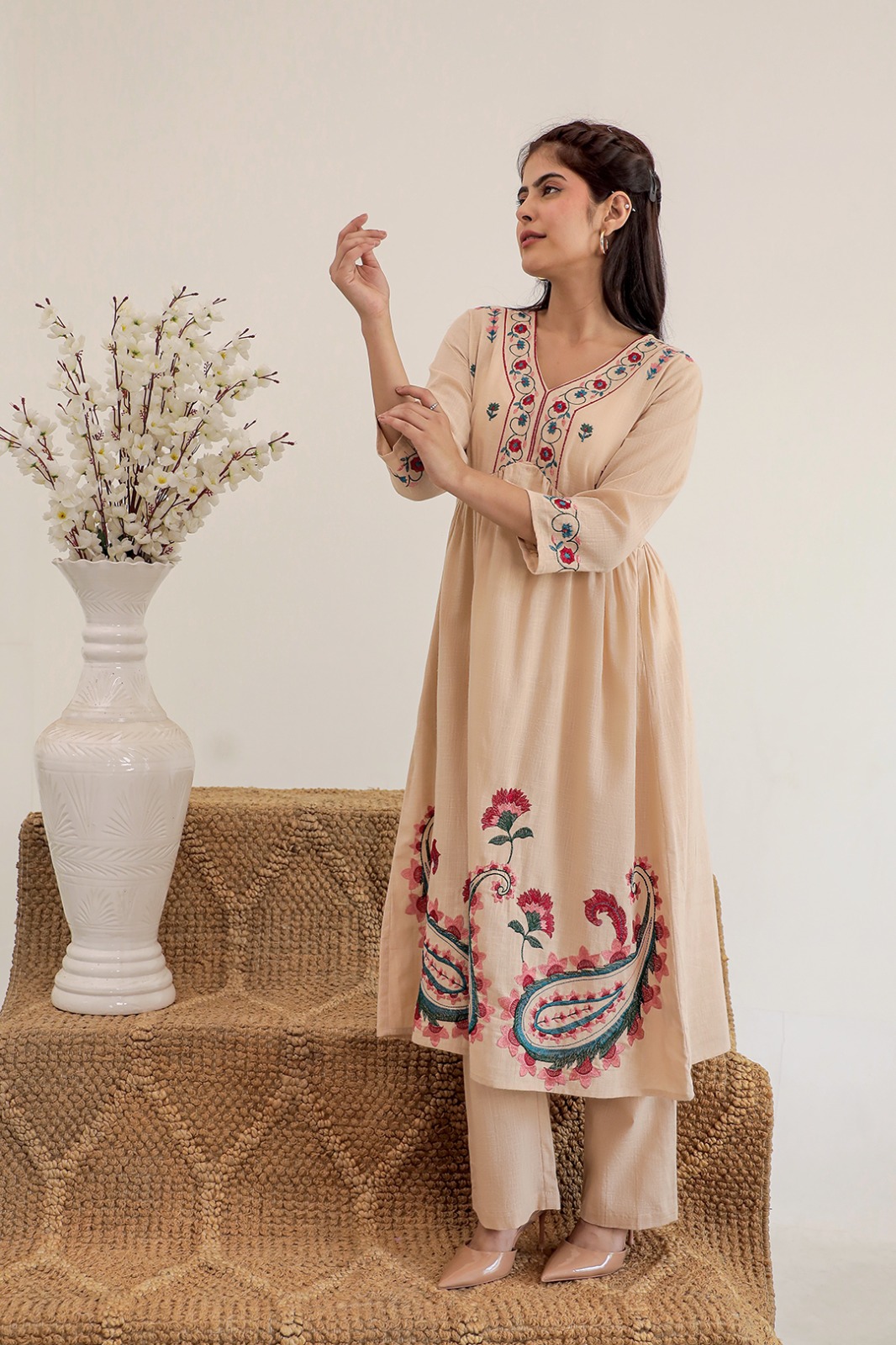 Effortless elegance meets everyday comfort in this Premium Cotton Kurta Set, crafted from breathable, high-quality cotton. Adorned with delicate fine embroidery on the yoke and sleeves, the kurta features a flattering silhouette that transitions seamlessly from casual brunches to festive gatherings. Paired with a coordinated bottom and a soft dupatta, this 3-piece set is a timeless addition to your wardrobe.