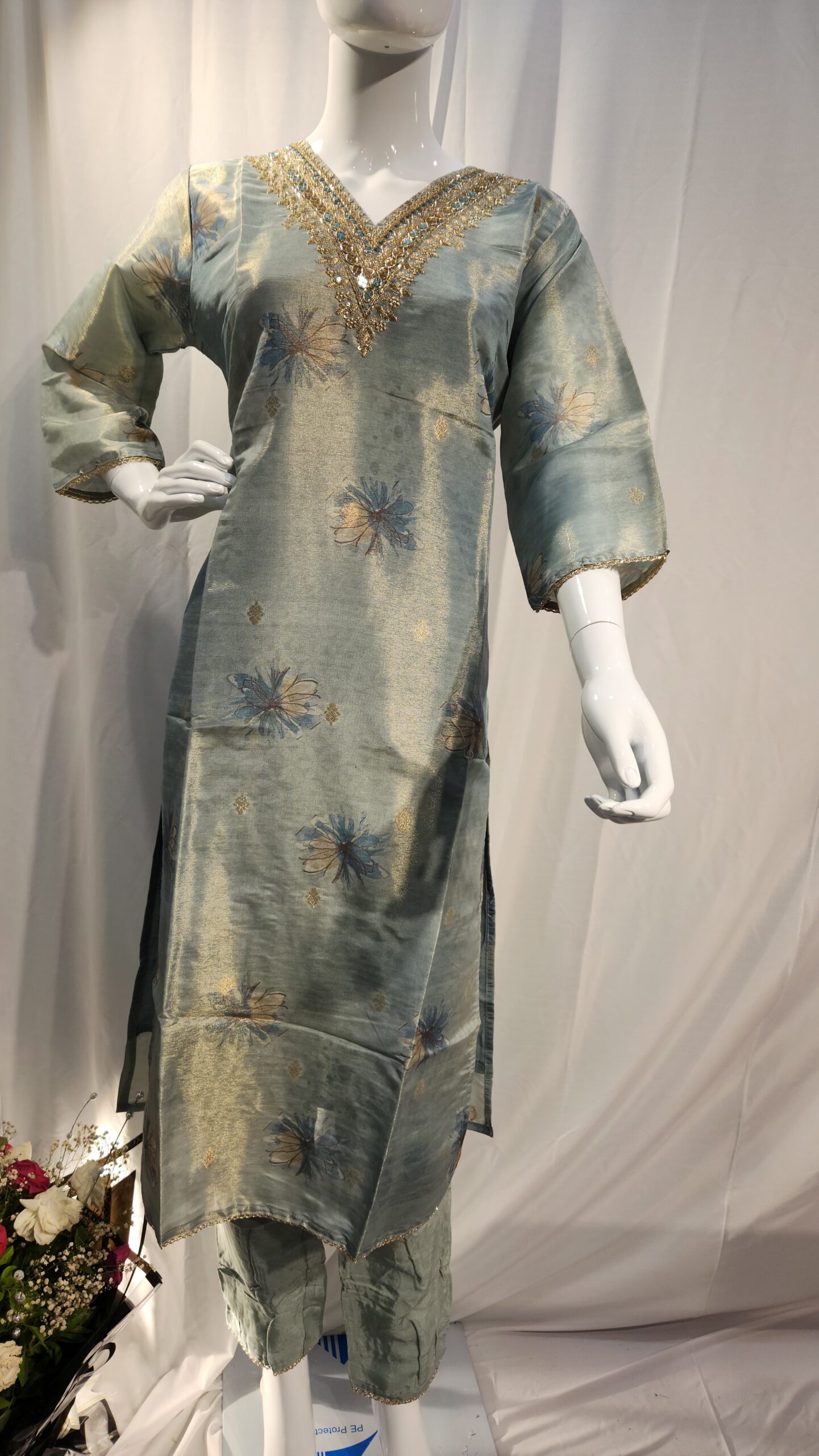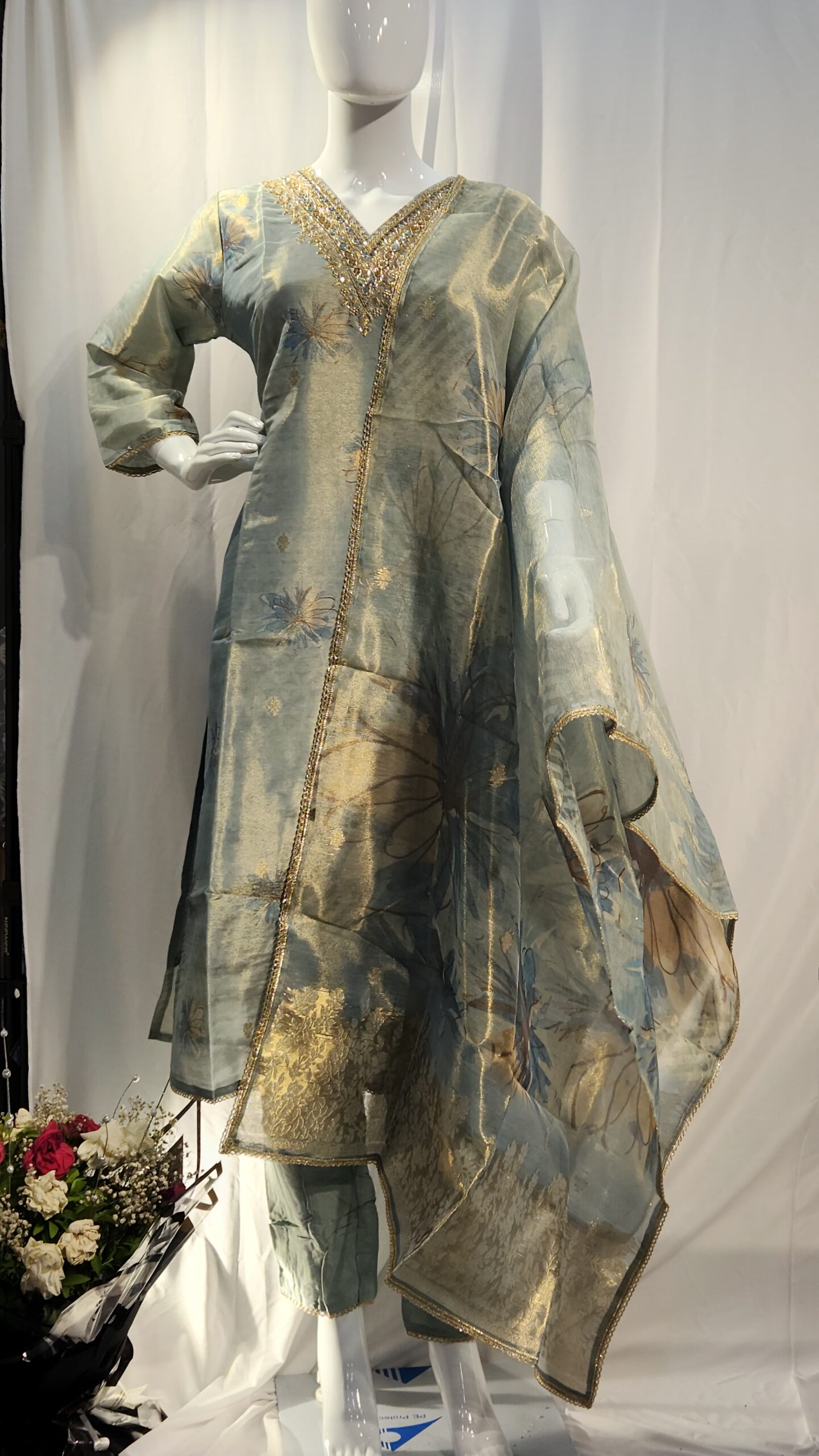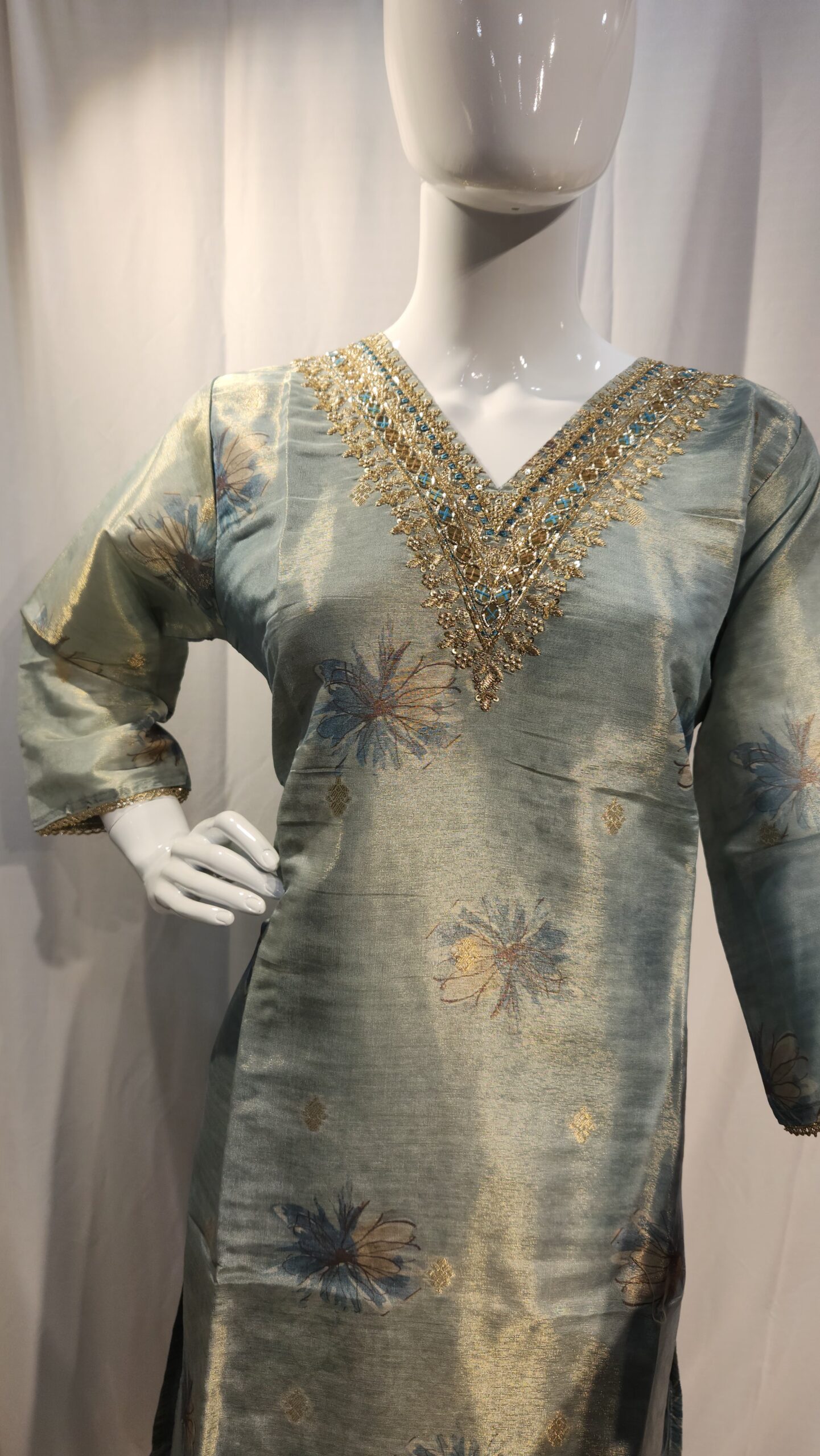 Add a touch of regal elegance to your wardrobe with this exquisite tissue silk 3-piece suit. Crafted from lightweight, semi-sheer tissue silk, the set features a gracefully tailored kurta, matching bottoms, and a digital printed organza dupatta. The subtle sheen and crisp texture of tissue silk give the outfit a refined, luxurious look—perfect for festive occasions, weddings, or formal gatherings.