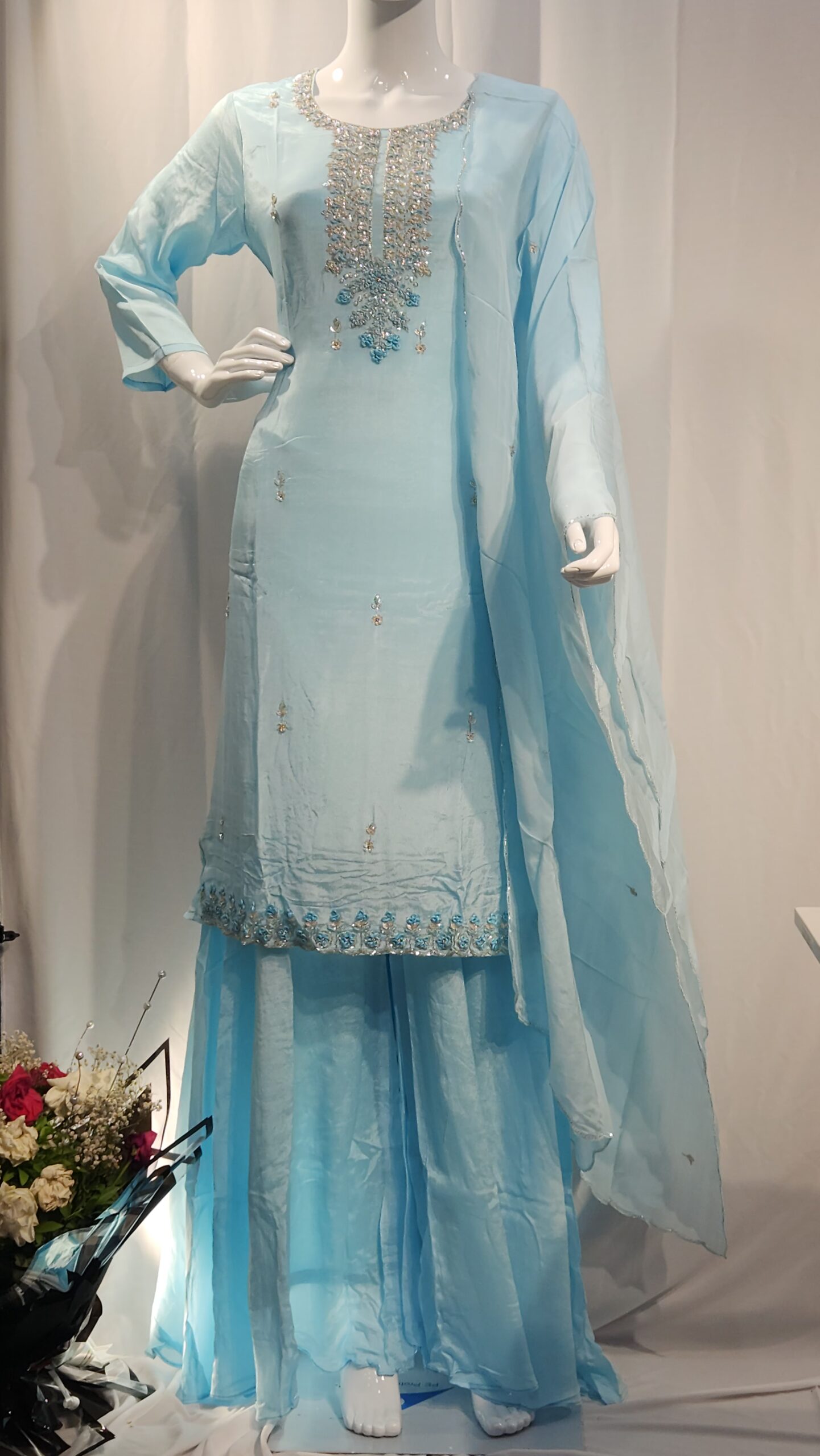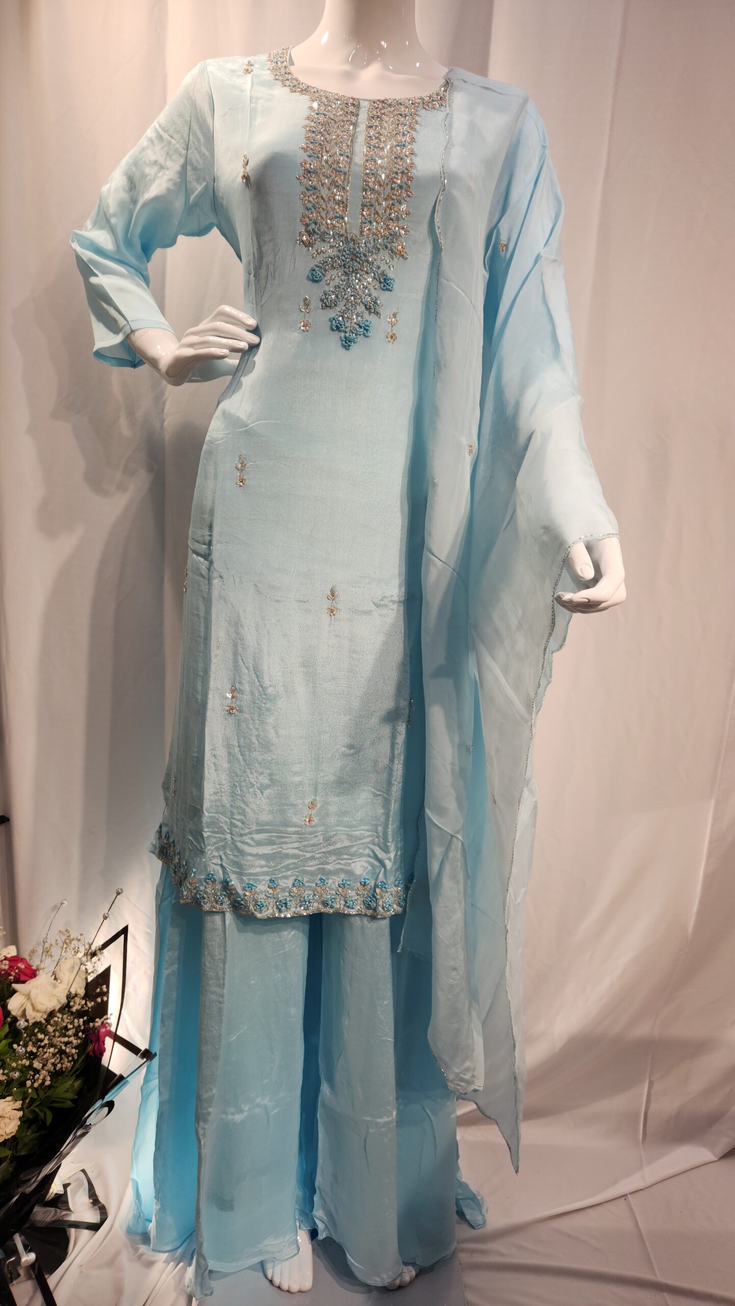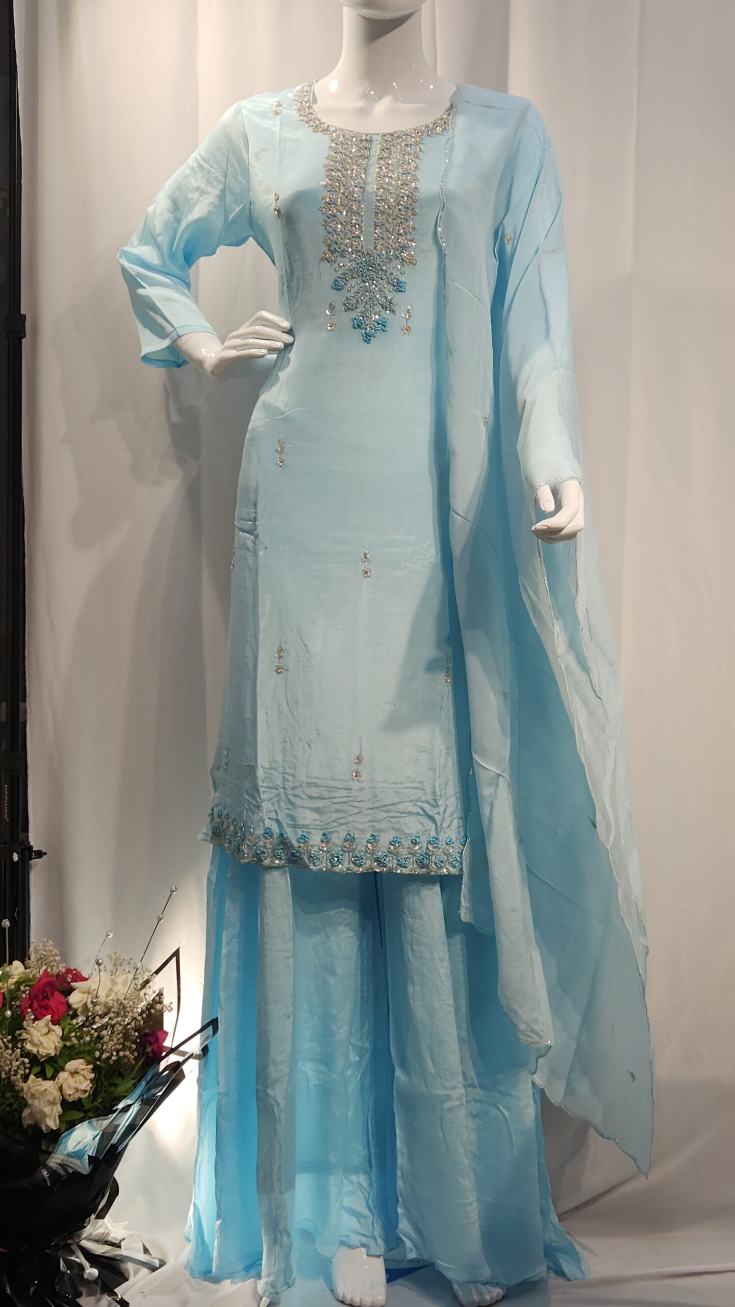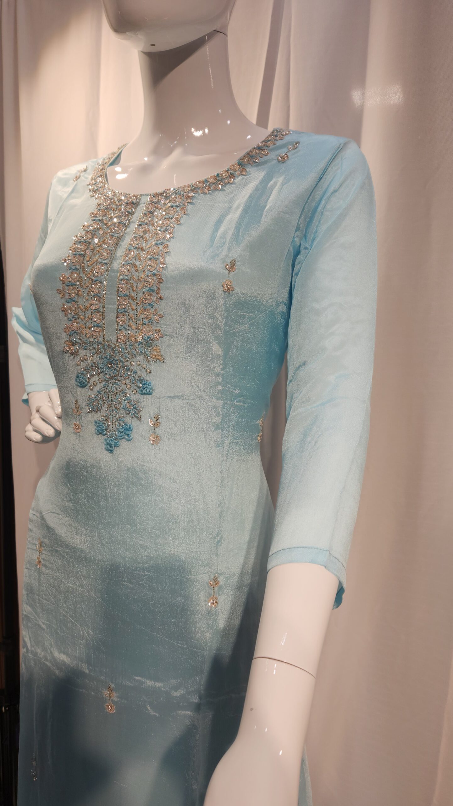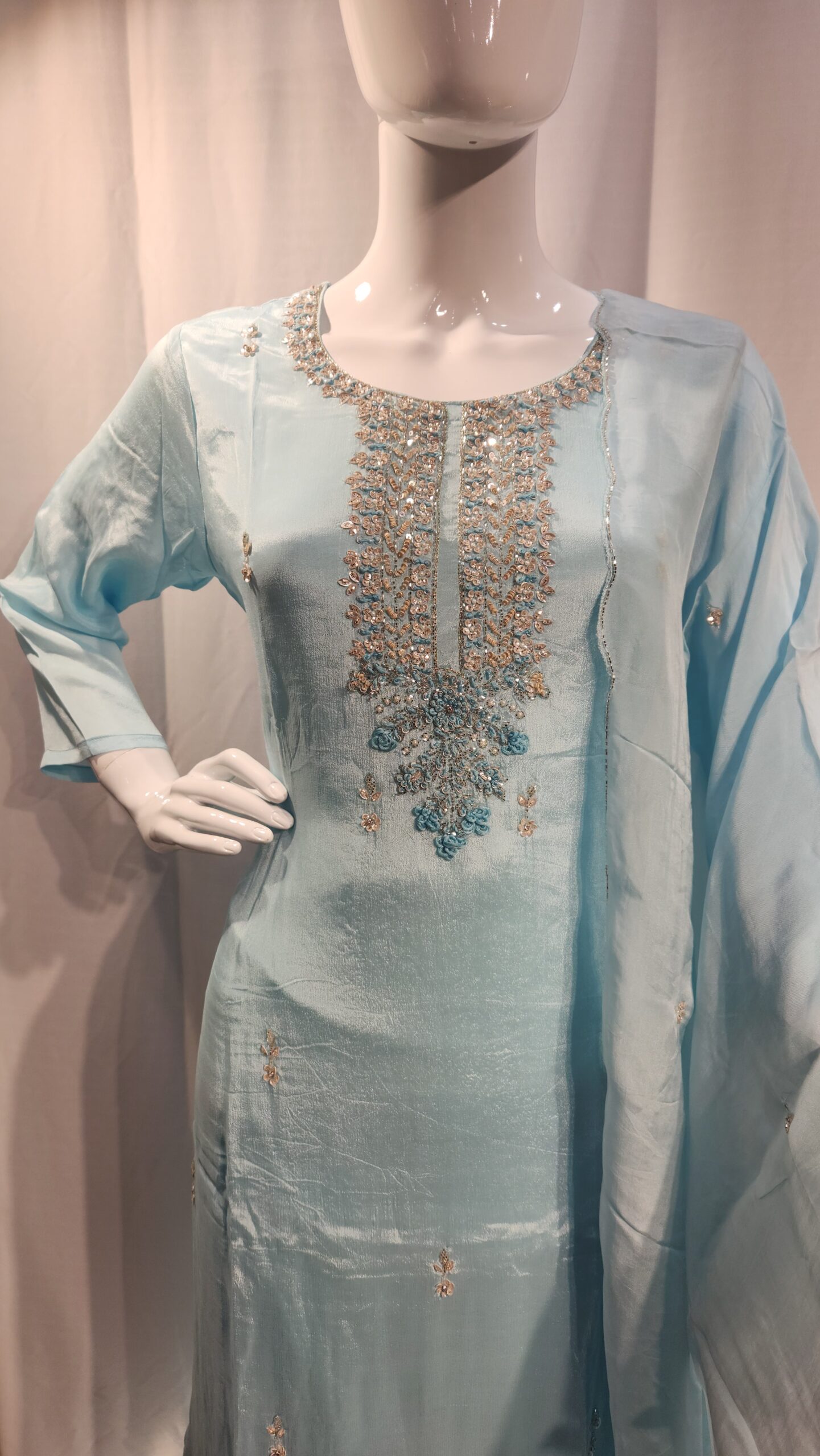 Elevate your ethnic wardrobe with this exquisitely crafted Pure Chinon Hand Work Suit, a perfect blend of elegance, tradition, and fine craftsmanship. Designed for those who appreciate timeless beauty and artisanal detailing, this suit set is ideal for festive occasions, weddings, and special gatherings.