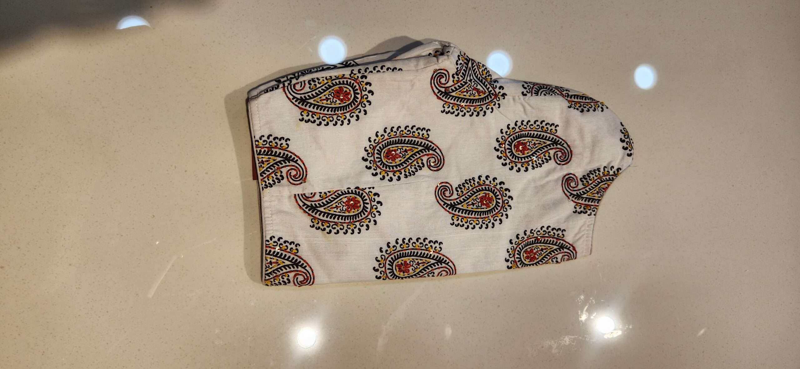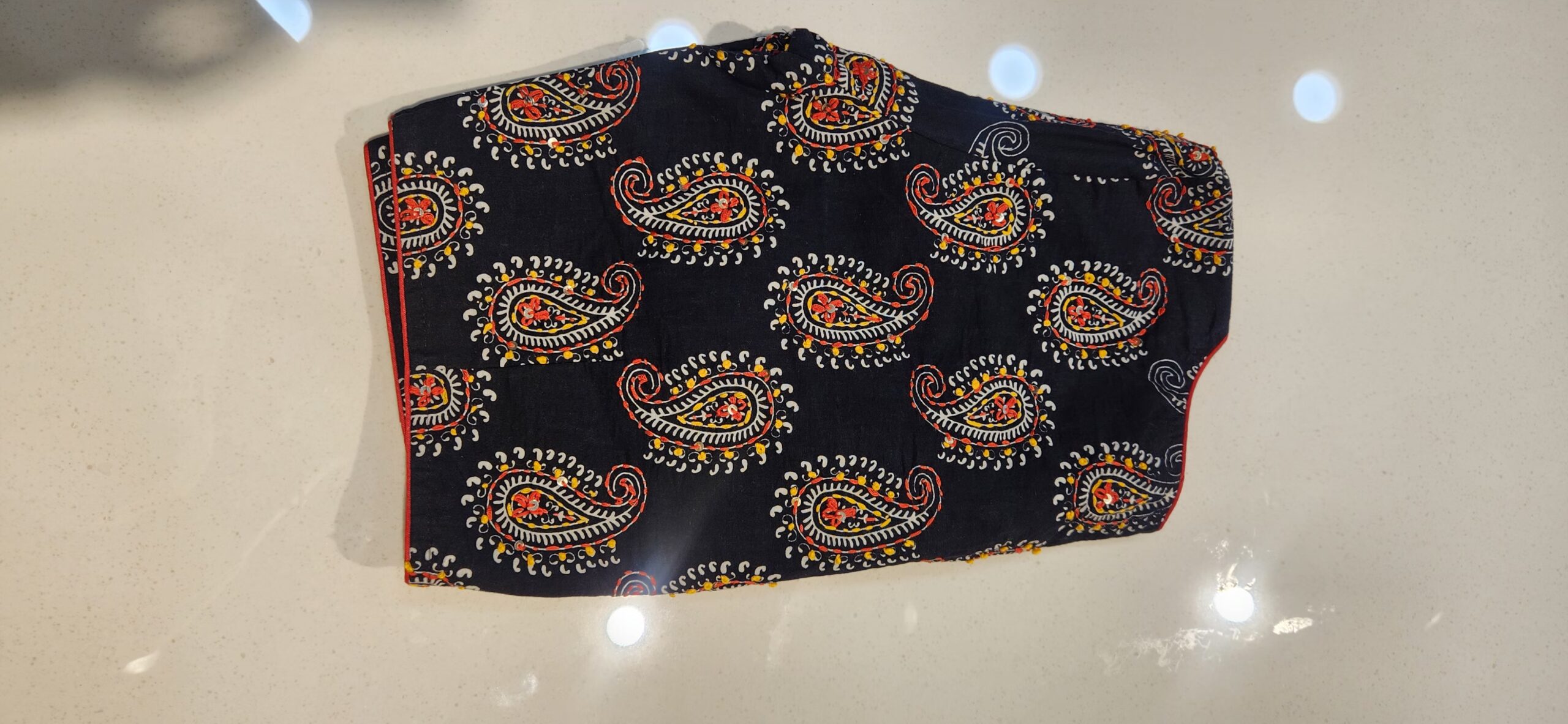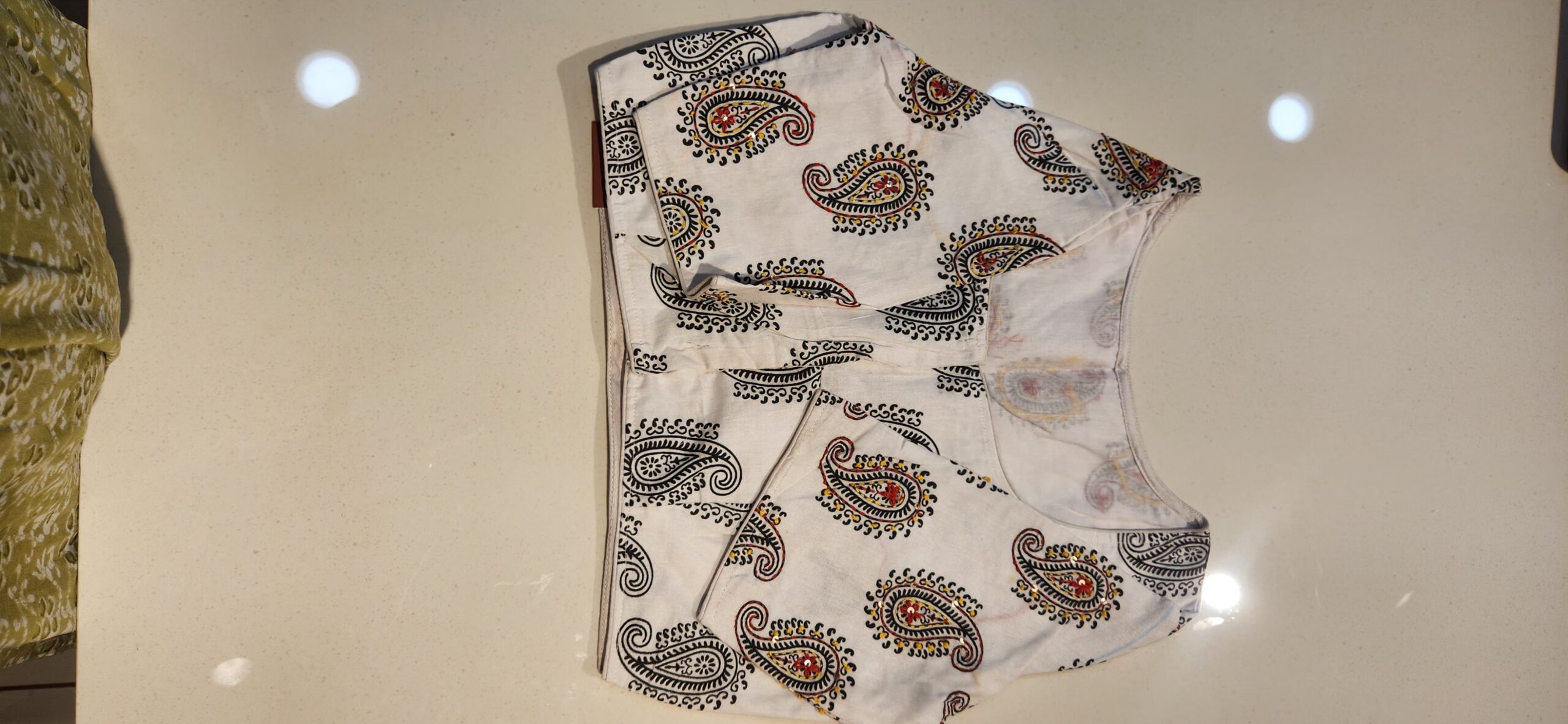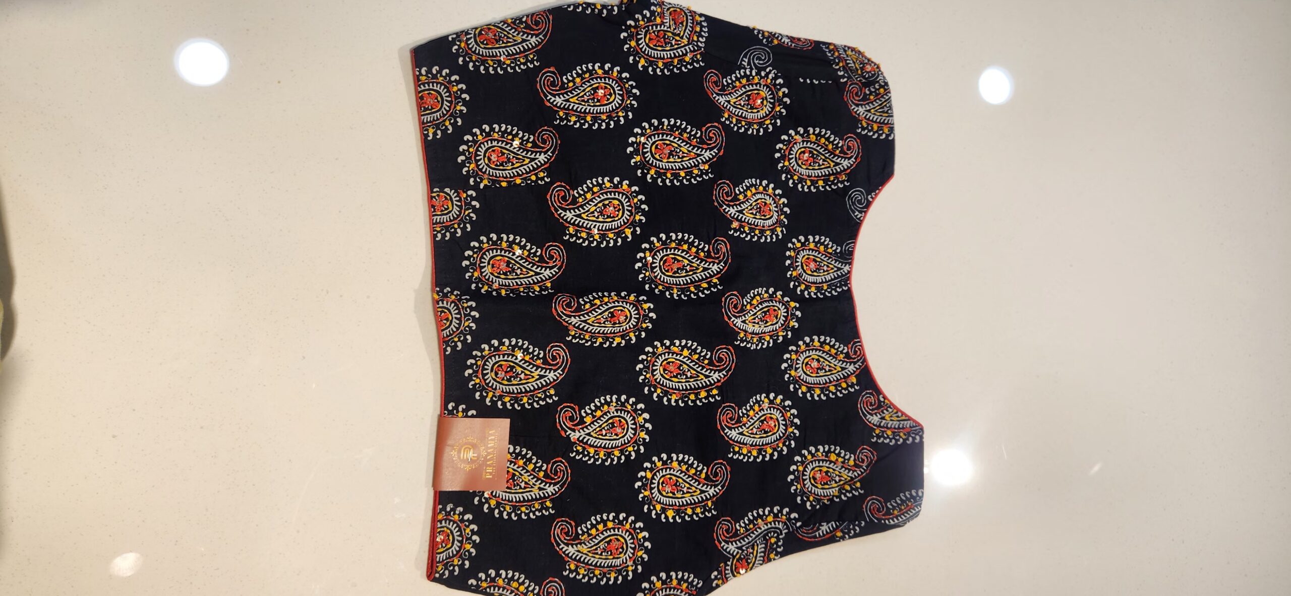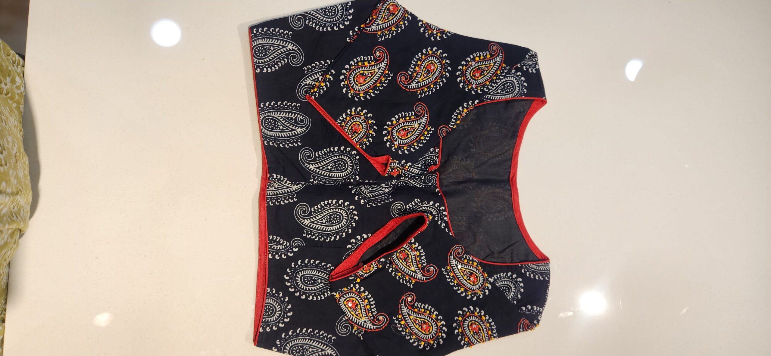 Pure cotton blouse with lining in princess cut. It has subtle katha work done on the back. It comes with elbow sleeves.