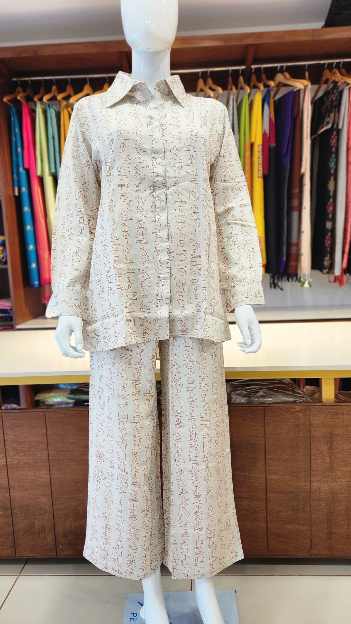 Step into effortless style with this Pure Cotton Cord Set, designed for comfort, ease, and everyday elegance. Featuring an all-over abstract script print in earthy tones, this two-piece set includes a full-sleeved collared shirt and wide-leg pants—perfectly balancing casual charm with modern flair. The breathable pure cotton fabric makes it ideal for long hours, travel days, or casual get-togethers, while the relaxed silhouette ensures a flattering fit for all body types.