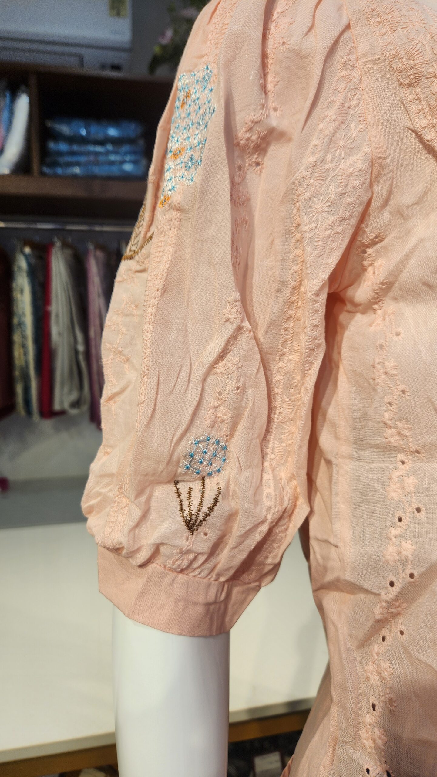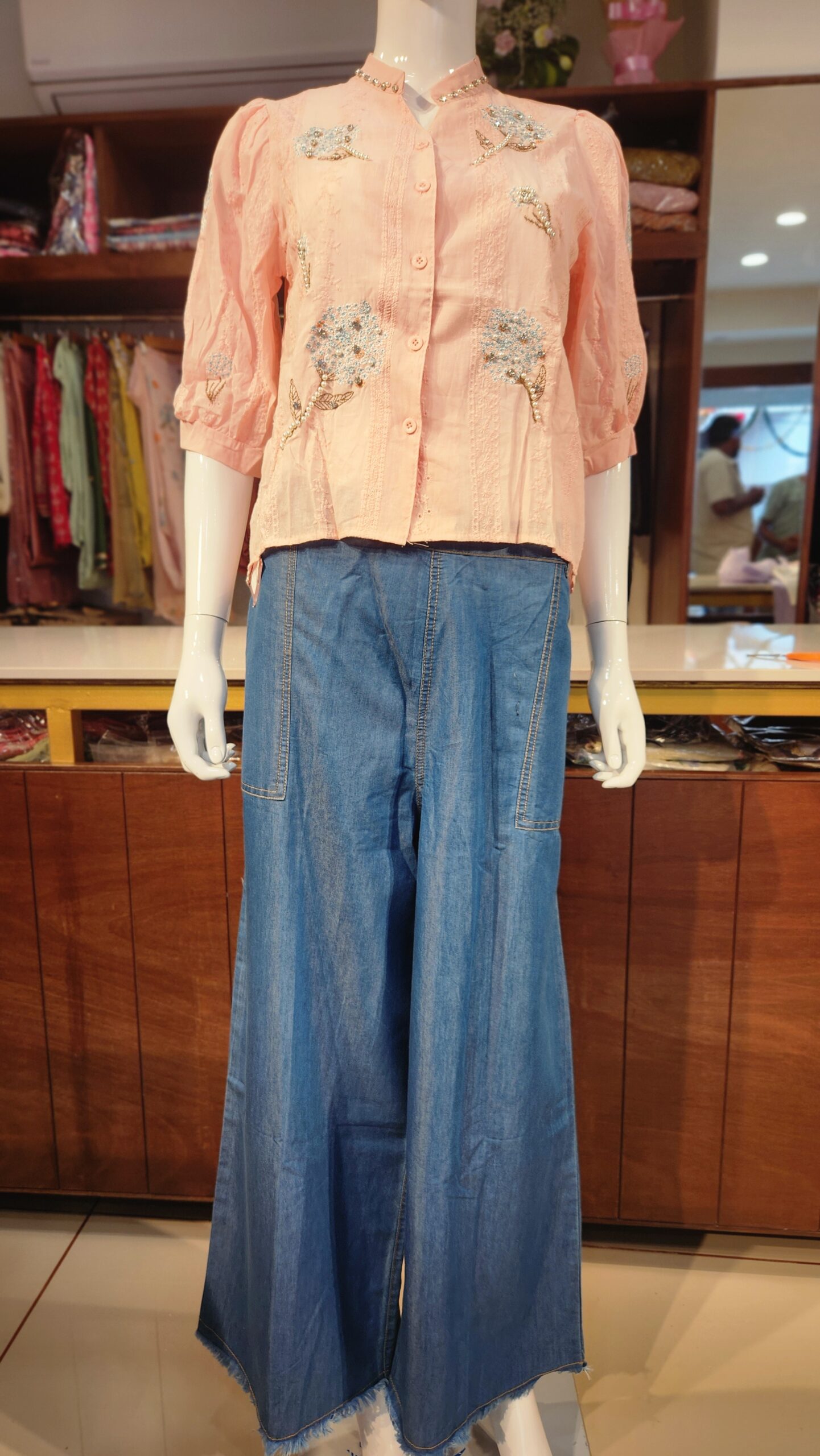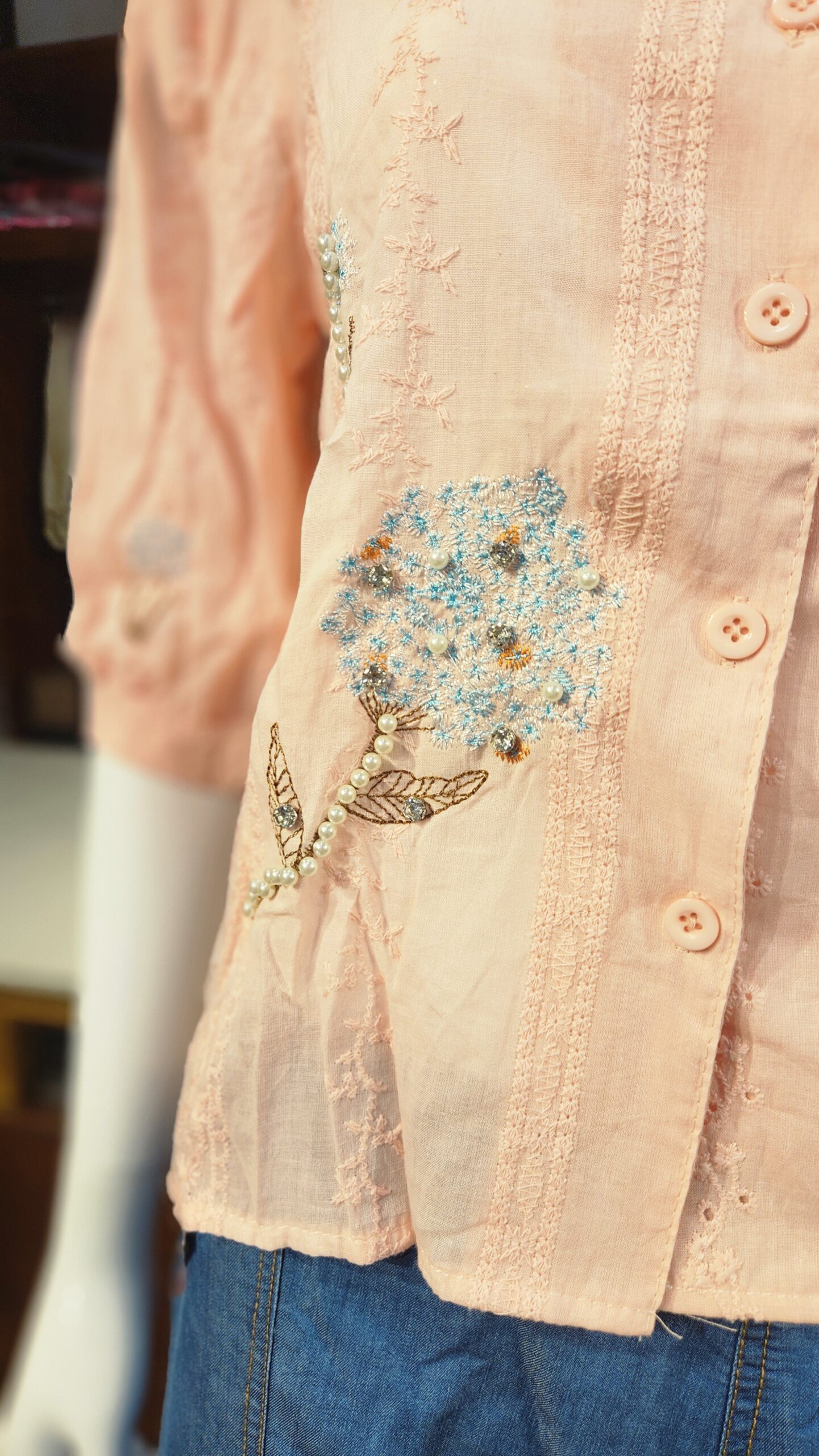 Add a soft, feminine charm to your wardrobe with this delicate blush pink blouse. Crafted in a lightweight fabric, it features elegant floral embroidery with bead and pearl work that brings subtle sparkle to the look. The blouse has a front button-down closure, a modest chinese collar with V-neckline with embroidered edging and gently puffed 3/4th sleeves that enhance its vintage appeal. Perfectly paired with denims, skirts, or trousers, this top is ideal for brunches, casual outings, or even a boutique day out.