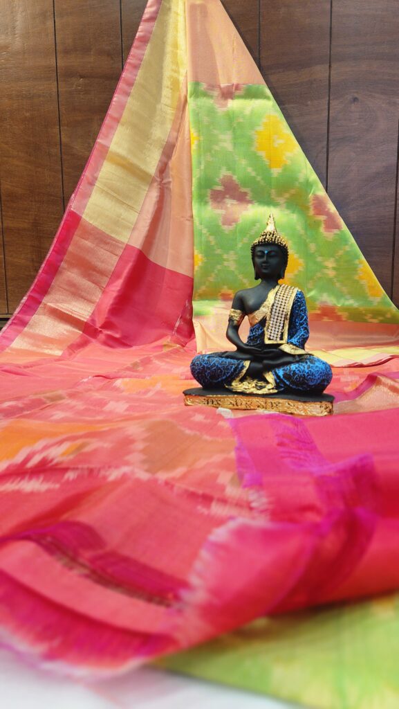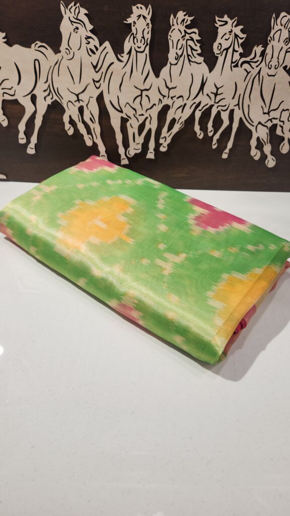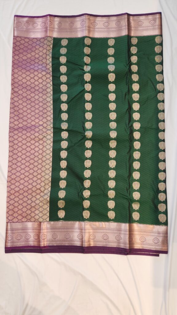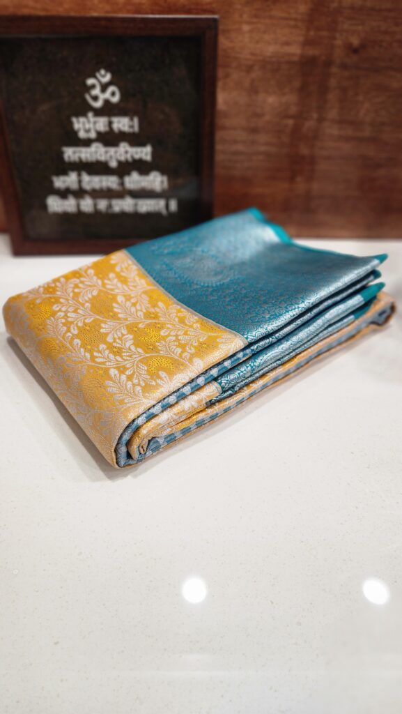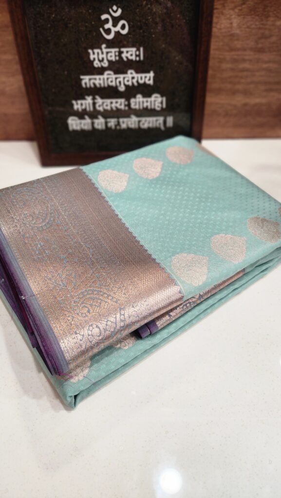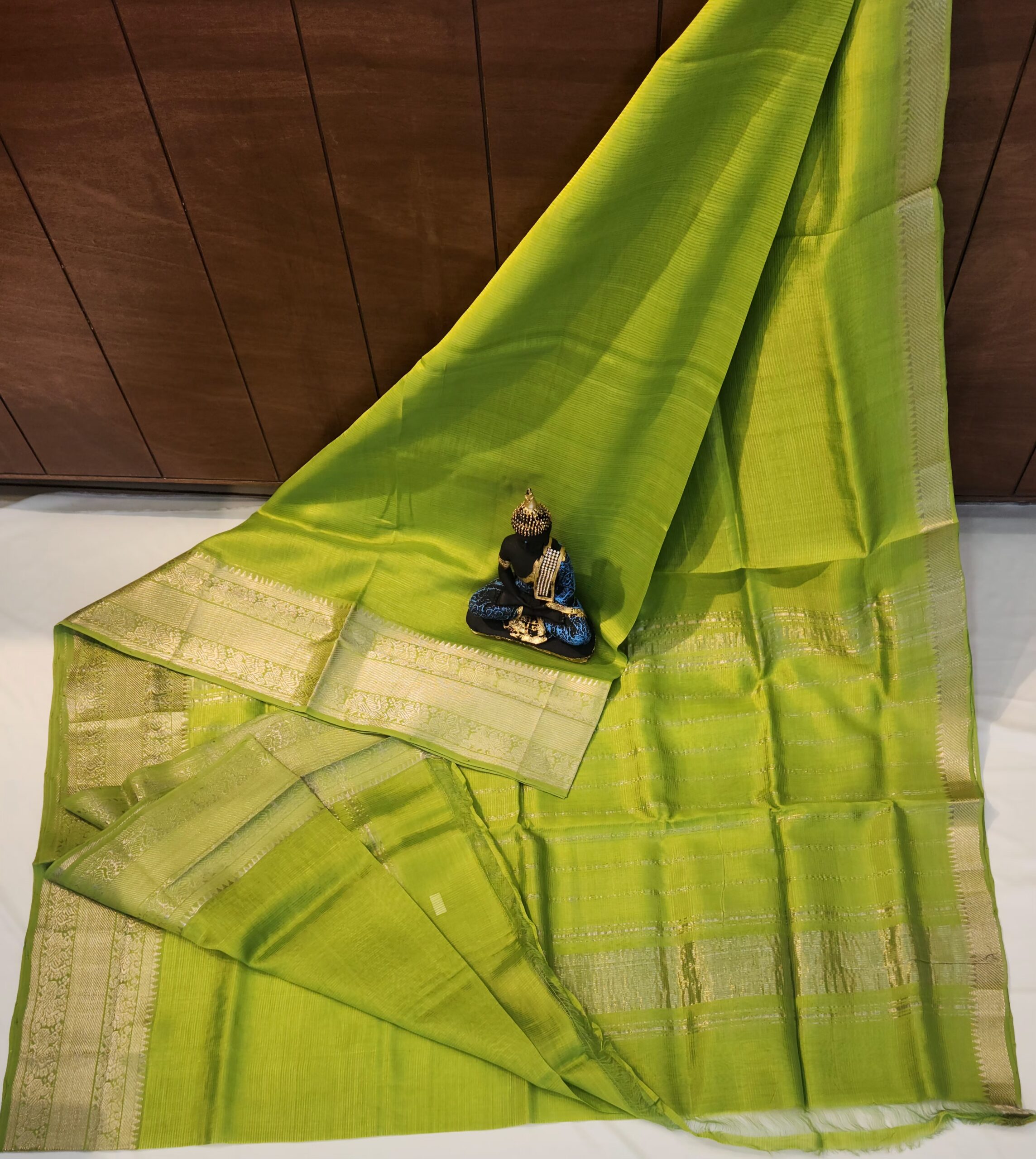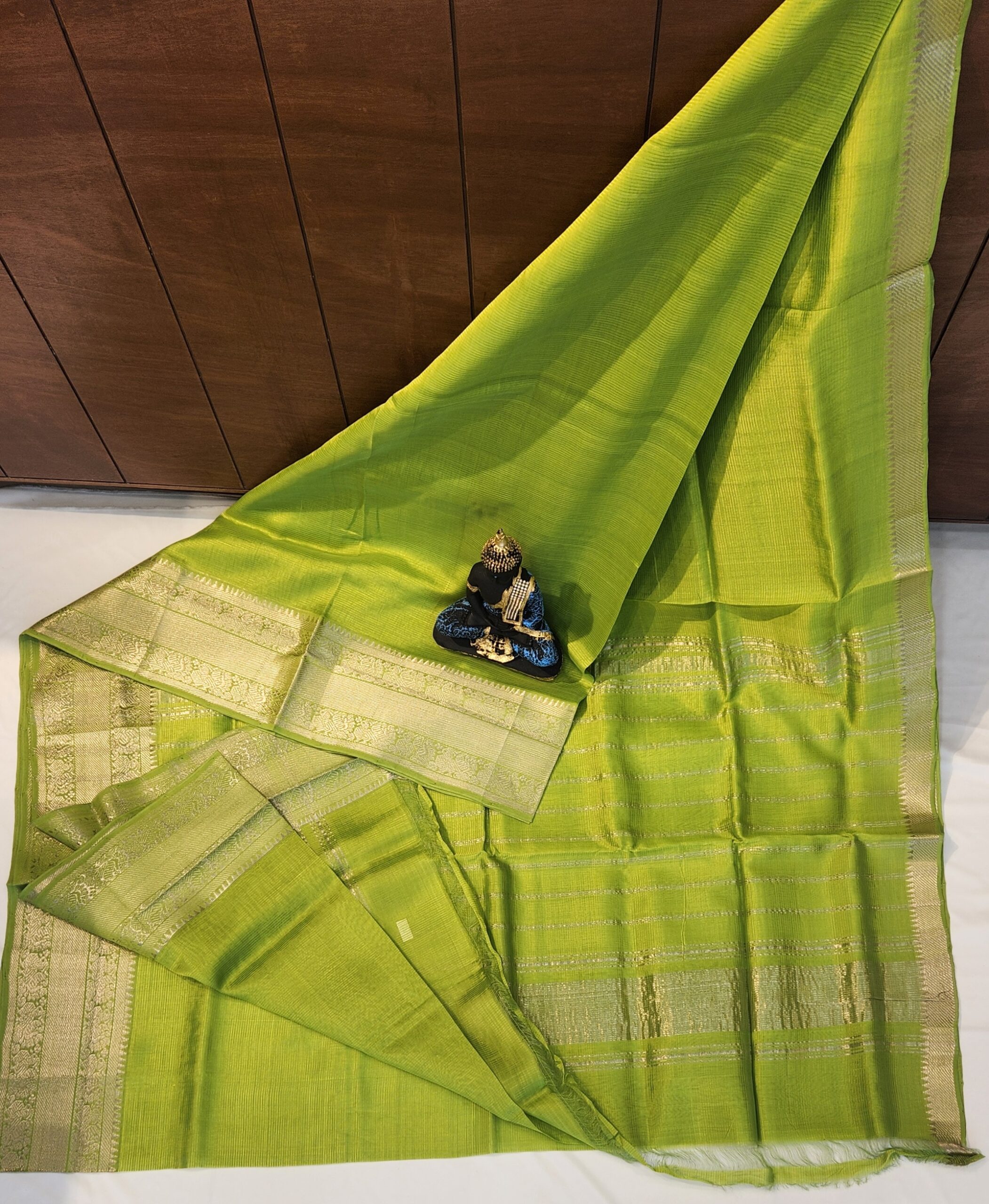 Elevate your ethnic wardrobe with this Pure Mangalgiri Silk Saree adorned with a majestic Kanchi border. Handwoven in the heritage town of Mangalgiri, this saree blends the soft, lightweight texture of pure silk with the grandeur of traditional Kanchipuram-style zari borders. The subtle sheen, rich contrast pallu, and finely crafted blouse piece make it a perfect choice for weddings, festivities, and graceful gatherings.