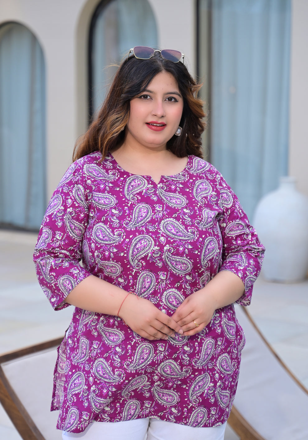 Brighten up your everyday style with this Purple Printed Pure Cotton Top – a perfect blend of comfort and charm.