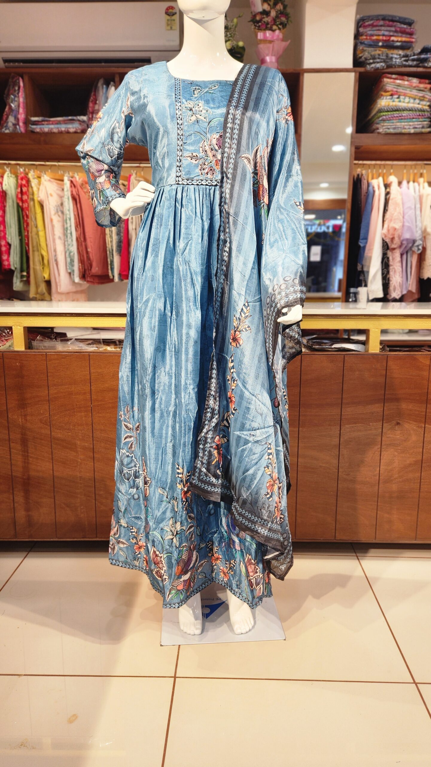 Step into refined elegance with this stunning Roman Silk Long Gown paired with a Dupatta — the perfect fusion of grace and contemporary charm. Crafted from luxurious Roman silk, this outfit flows beautifully and makes a striking impression on any occasion.