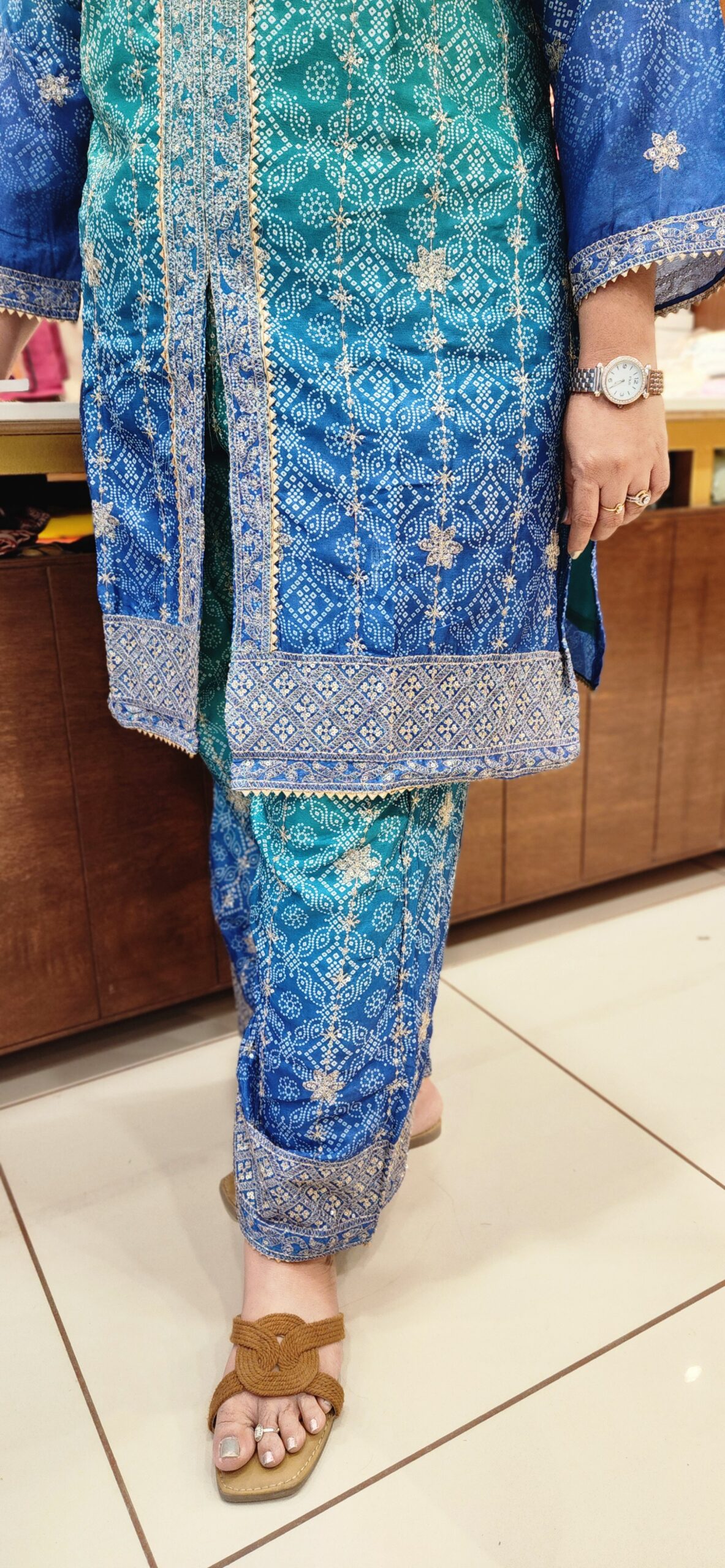 Fabric: High-quality Roman Silk Kurta and palazzos for a soft, structured drape.
