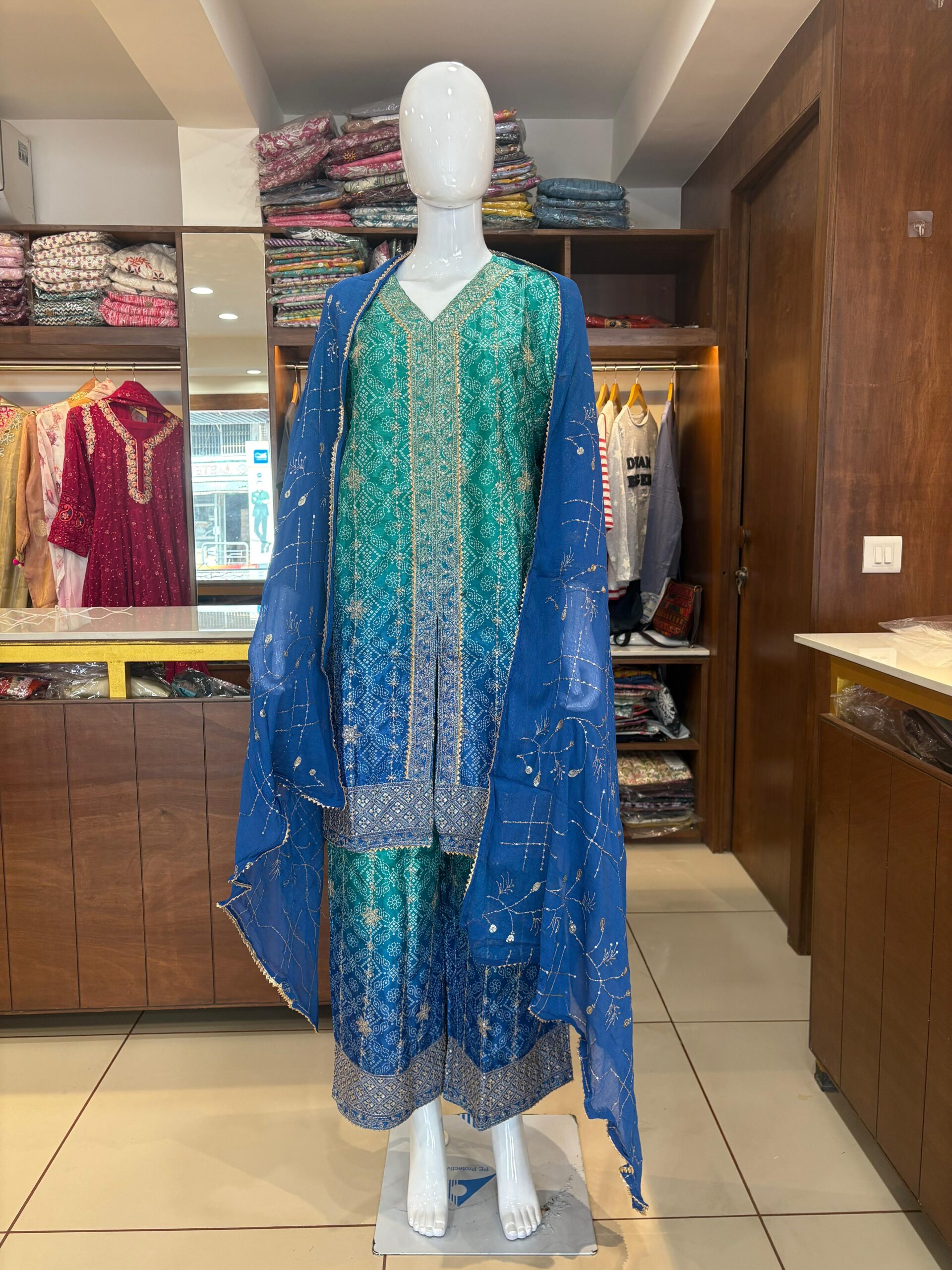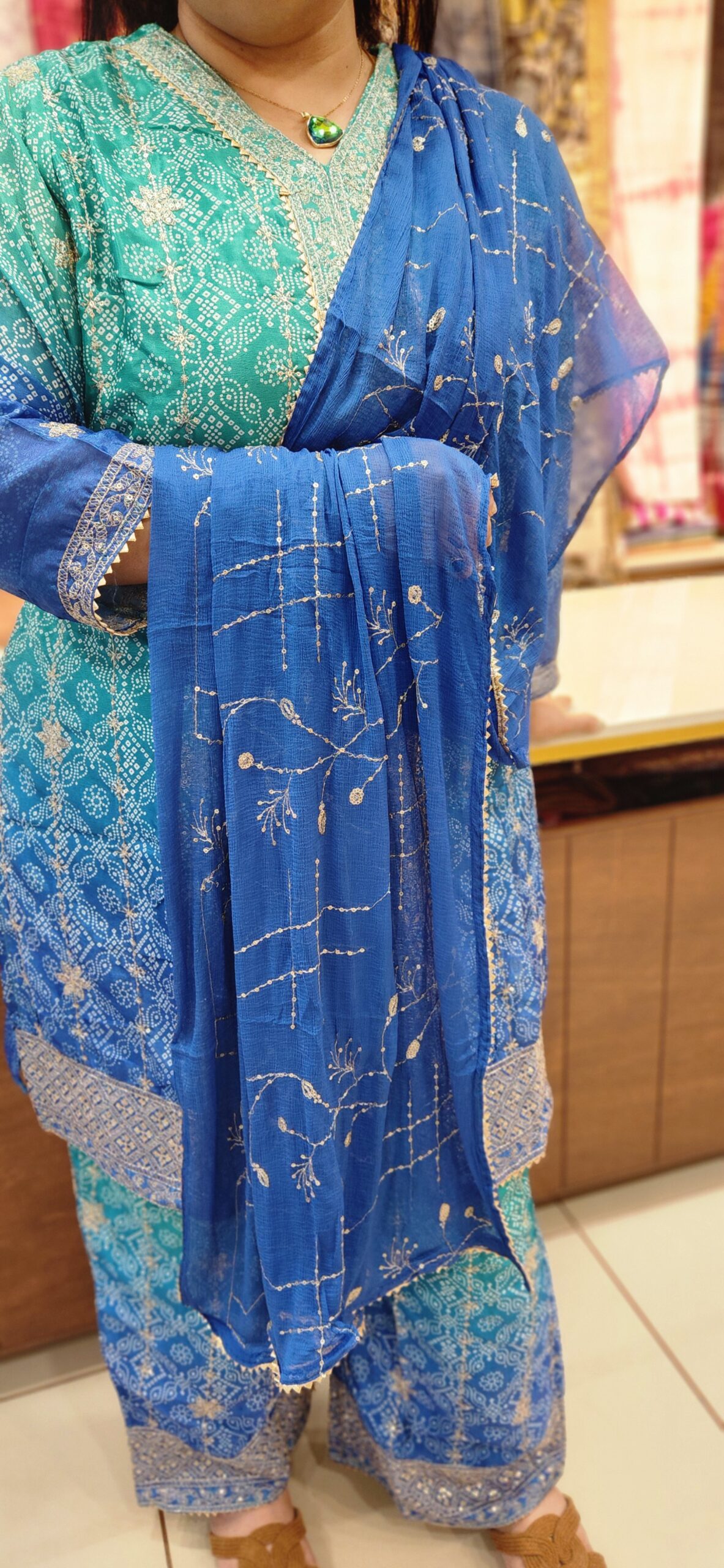 Embrace effortless glamour with our stunning two-tone Roman Silk palazzo Set. This outfit features a beautifully long-line kurta in a vibrant teal-to-blue gradient, adorned with intricate white ethnic motifs and delicate silver zari detailing along the borders.