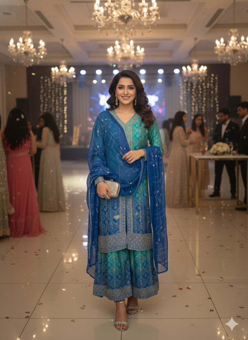 Dupatta: Includes a lightweight, sheer azure blue dupatta with silver sparkle accents to complete the party-ready aesthetic.