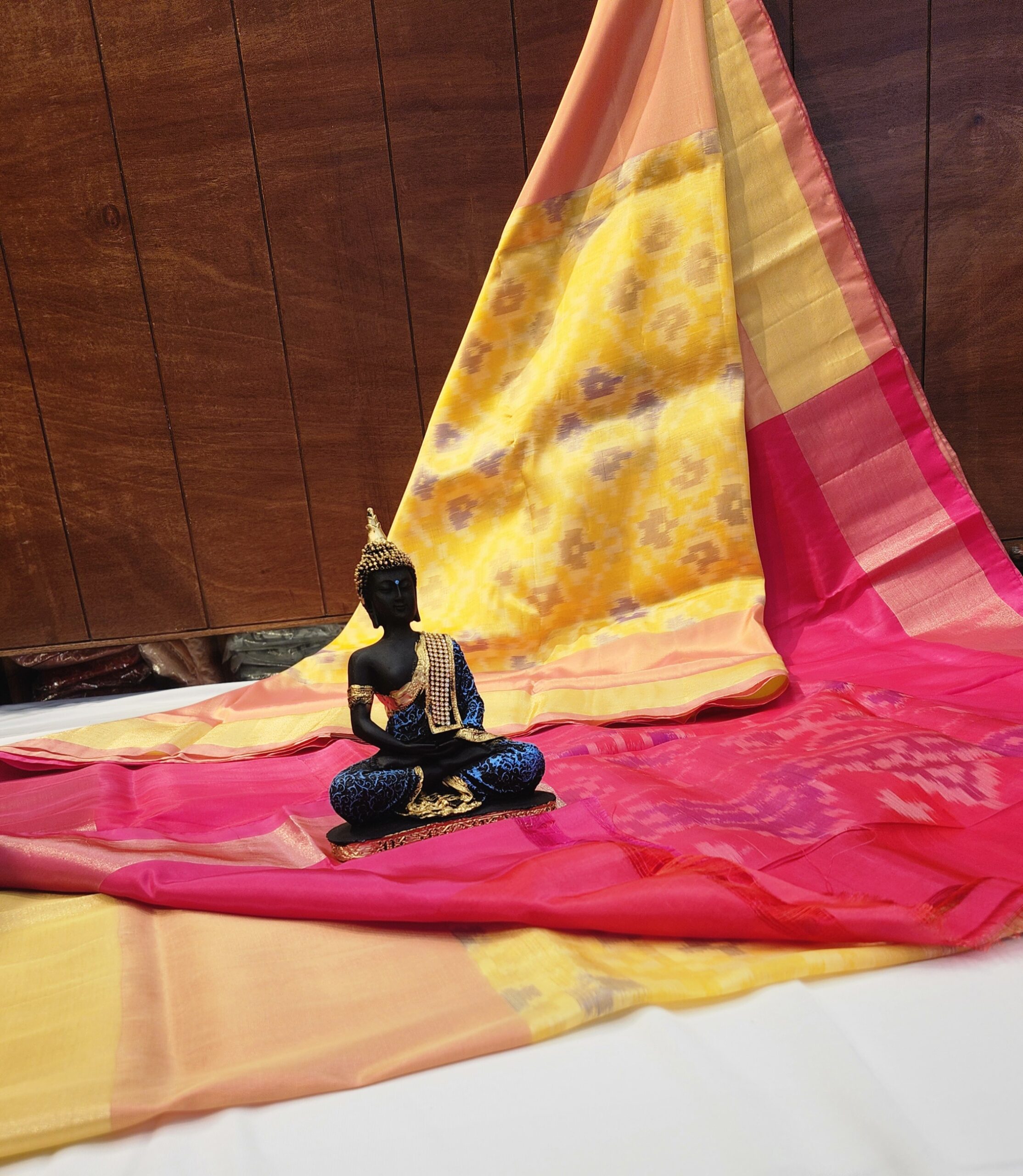 Celebrate tradition with a touch of elegance in this Sico Pochampally Saree – a graceful blend of silk and cotton, known for its signature geometric ikat patterns. Lightweight yet rich in texture, this saree offers the sheen of silk with the comfort of cotton. The classic Pochampally motifs woven with precision across the body and pallu make it perfect for festive gatherings, poojas, and elegant daywear.