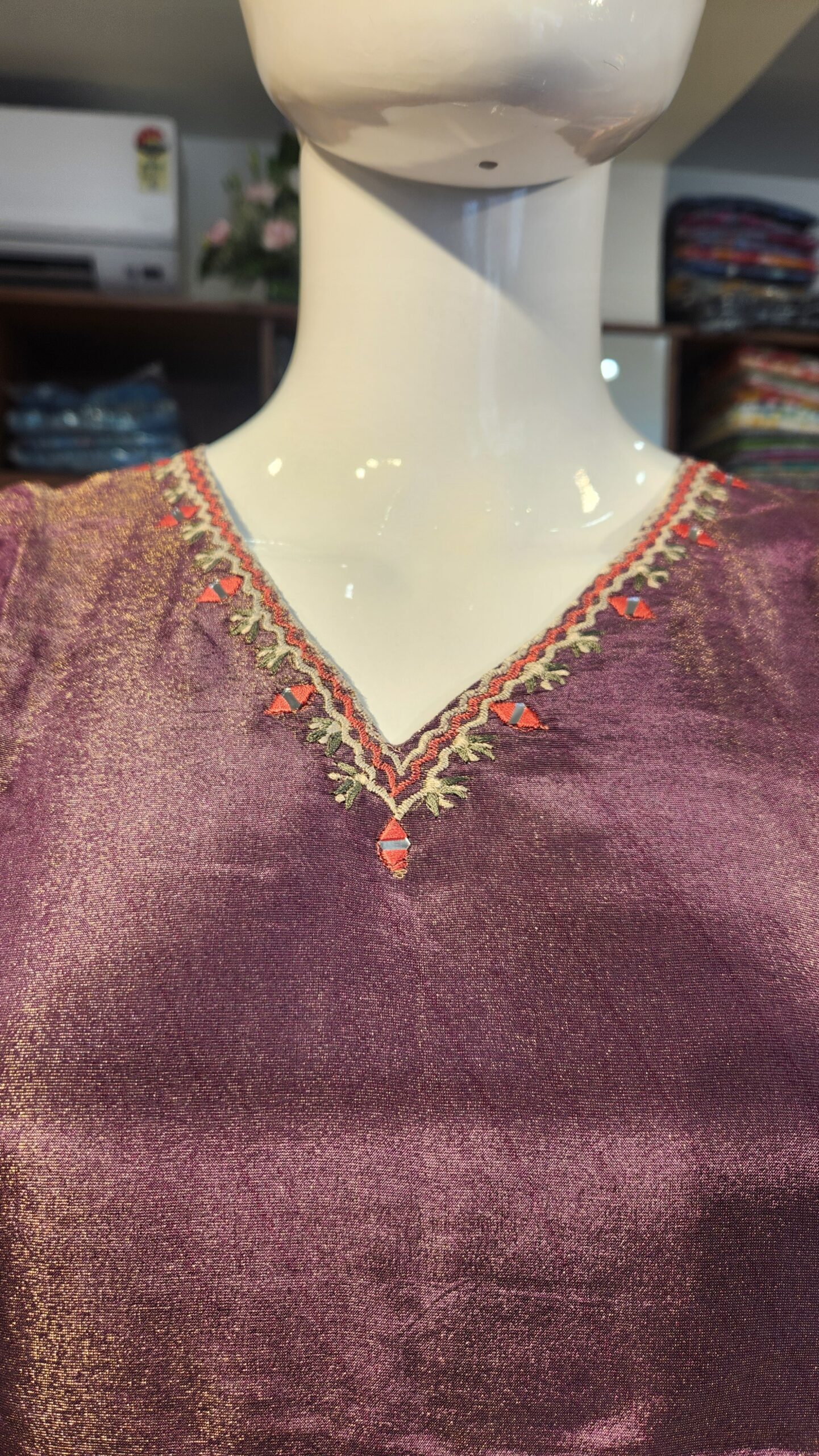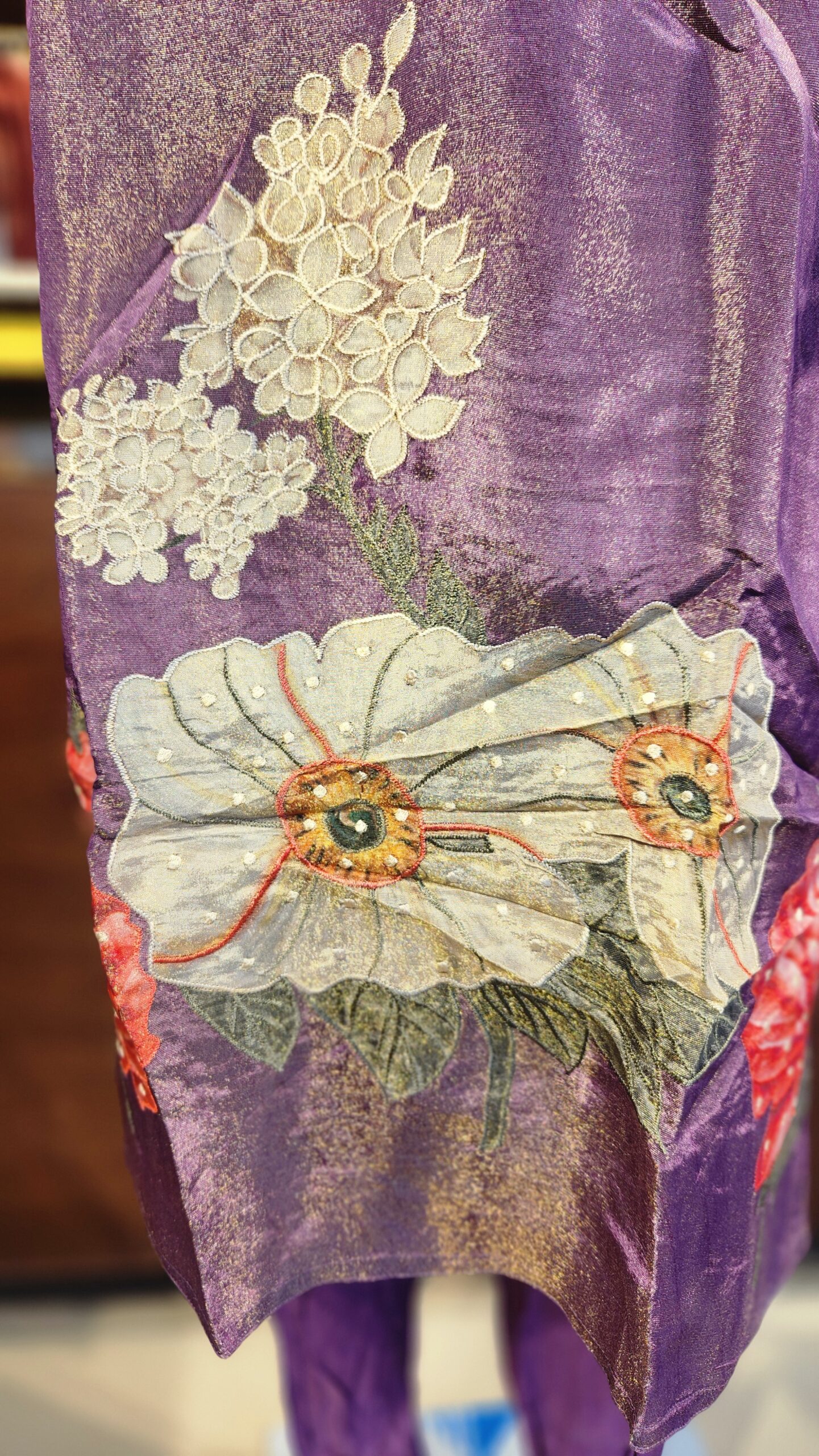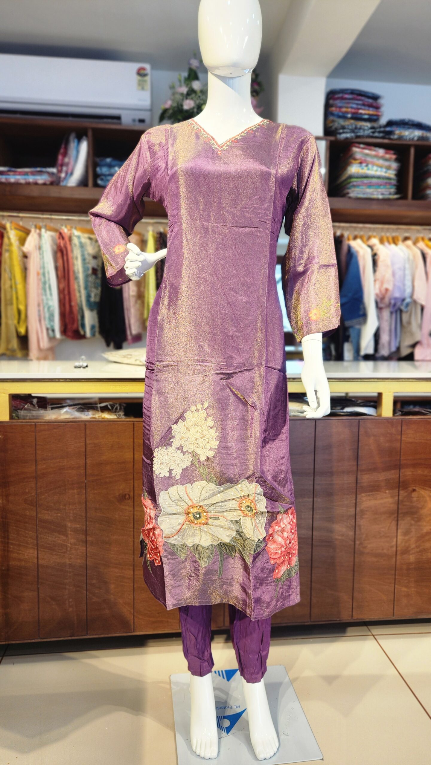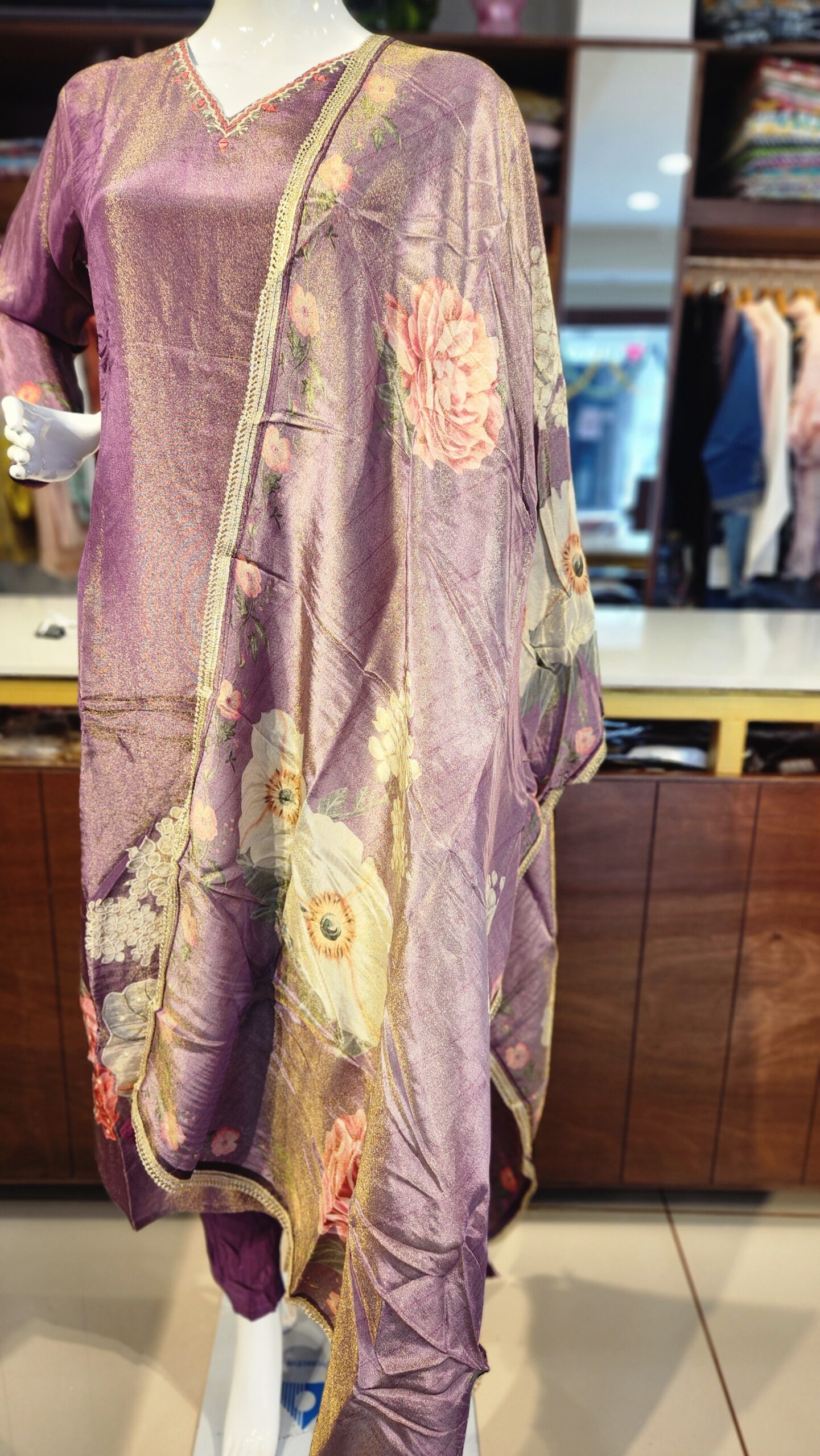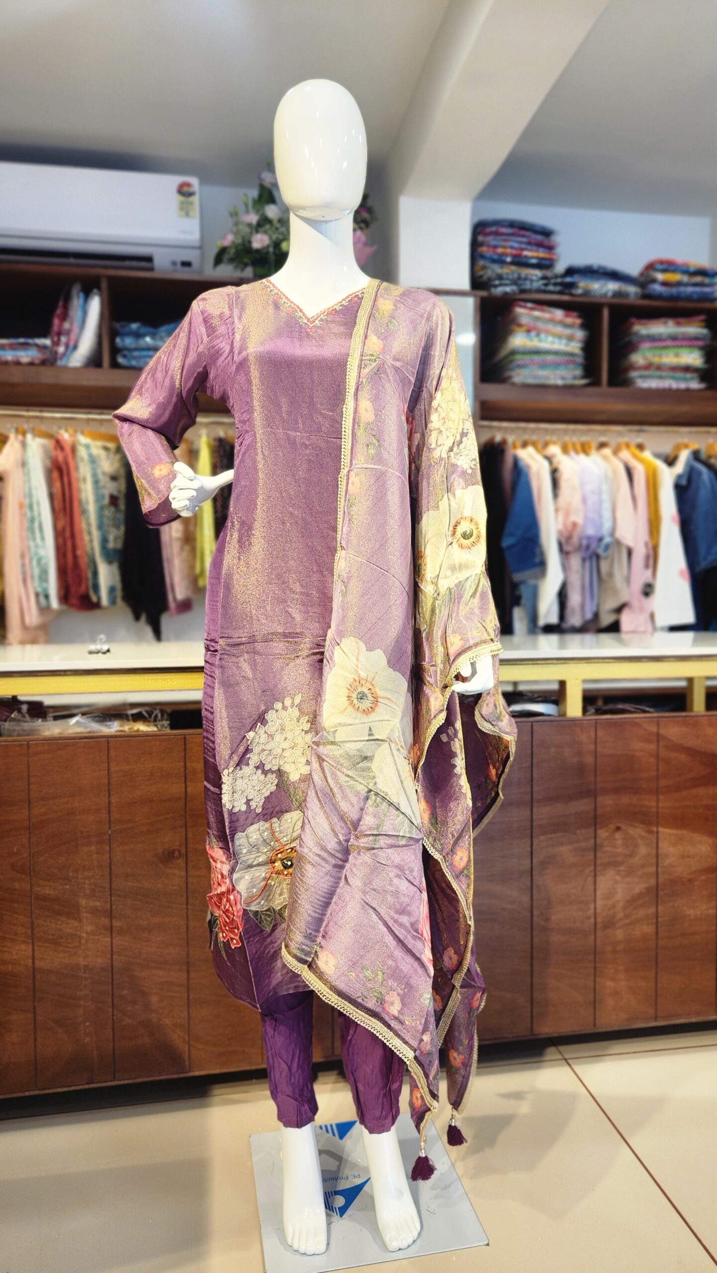 Add a touch of regal elegance to your wardrobe with this exquisite tissue silk 3-piece suit. Crafted from lightweight, semi-sheer tissue silk, the set features a gracefully tailored kurta, matching bottoms, and a digital printed organza dupatta. The subtle sheen and crisp texture of tissue silk give the outfit a refined, luxurious look—perfect for festive occasions, weddings, or formal gatherings.