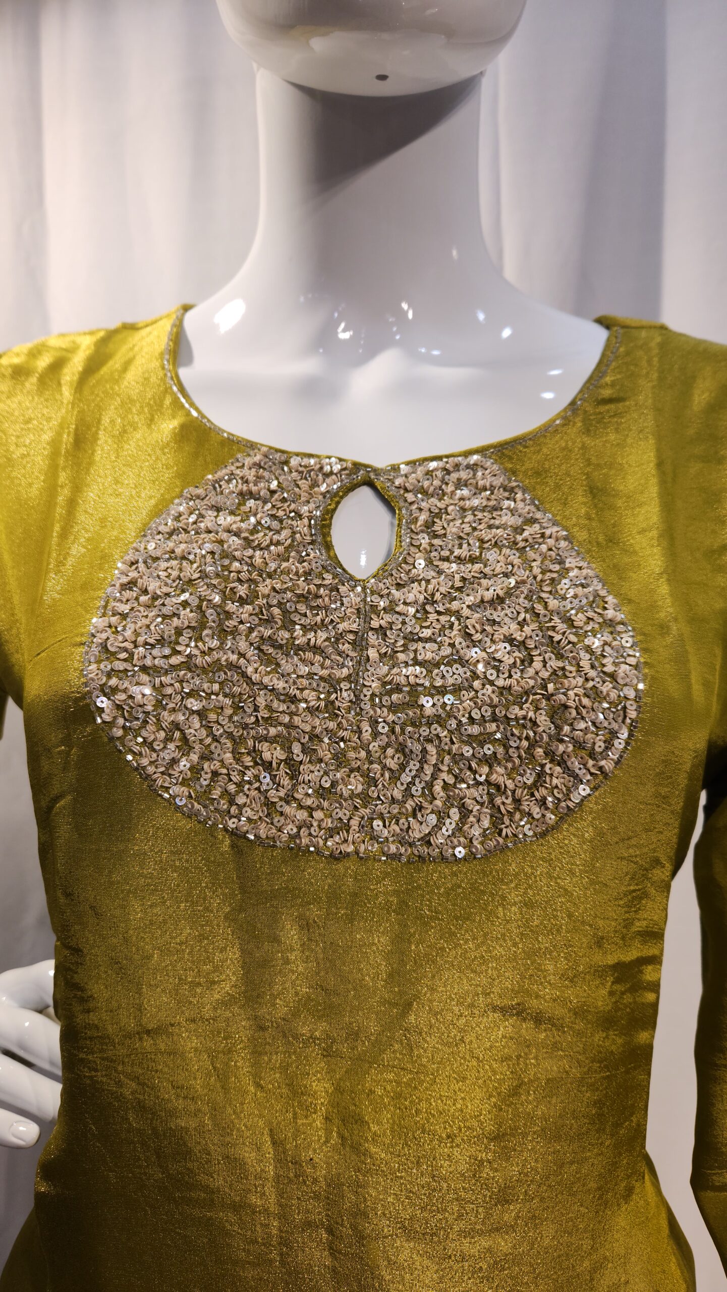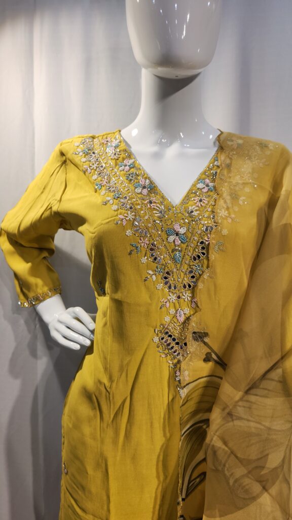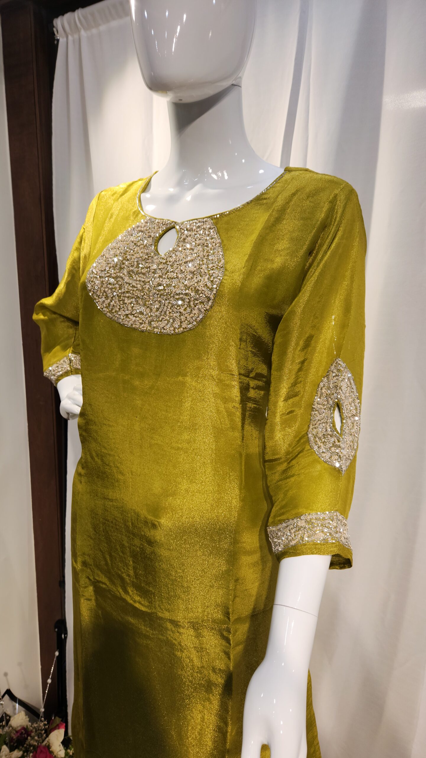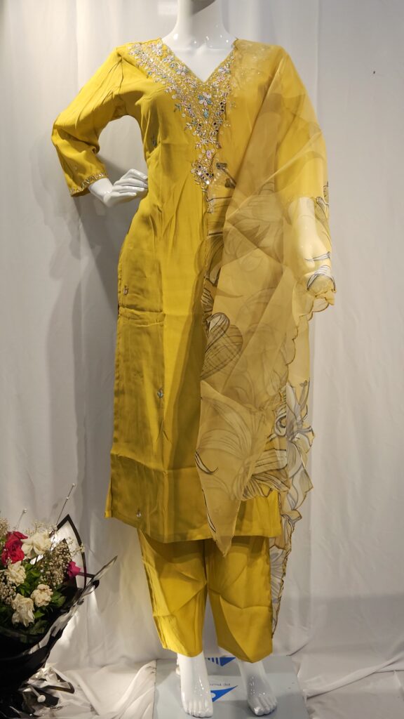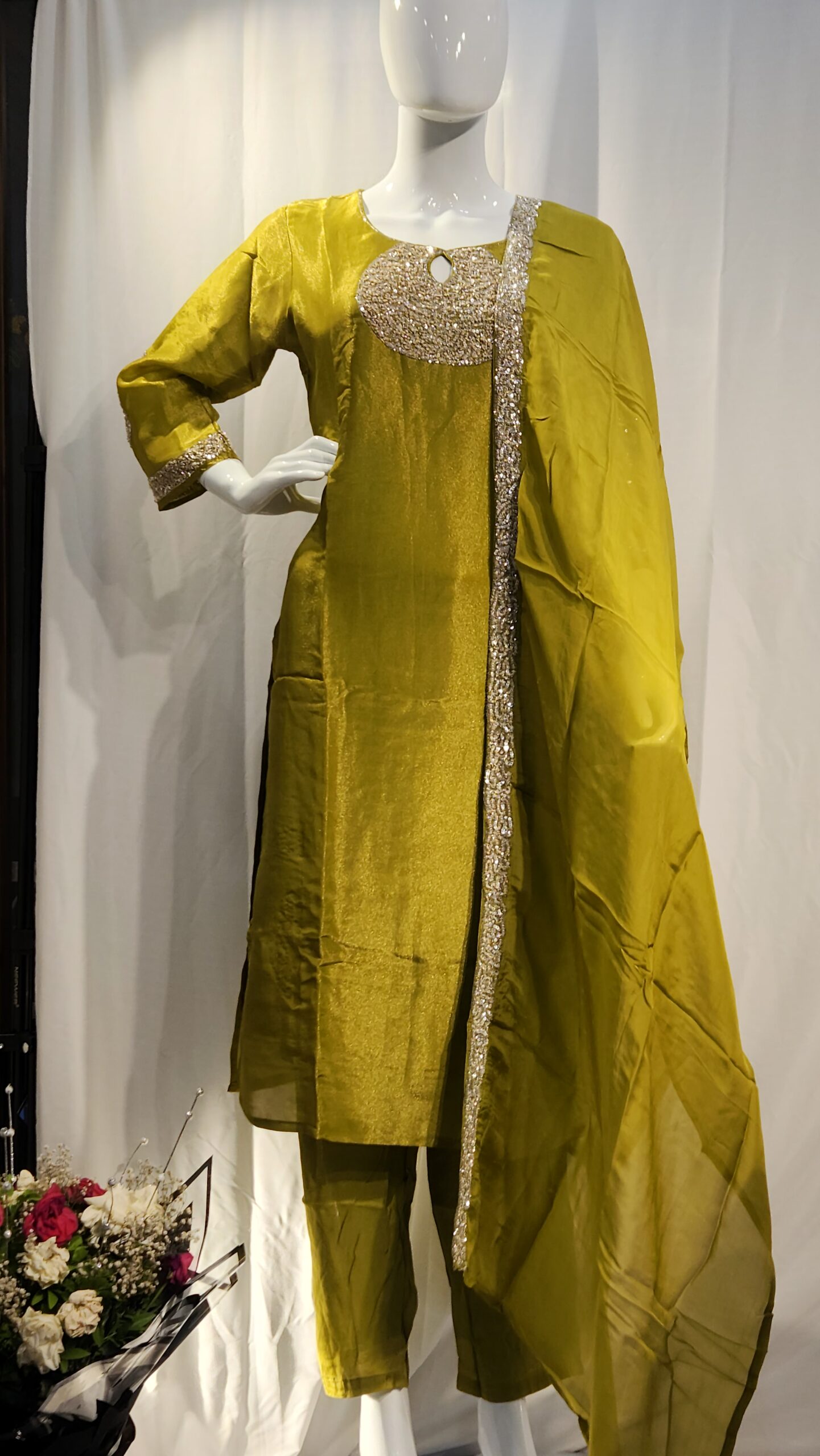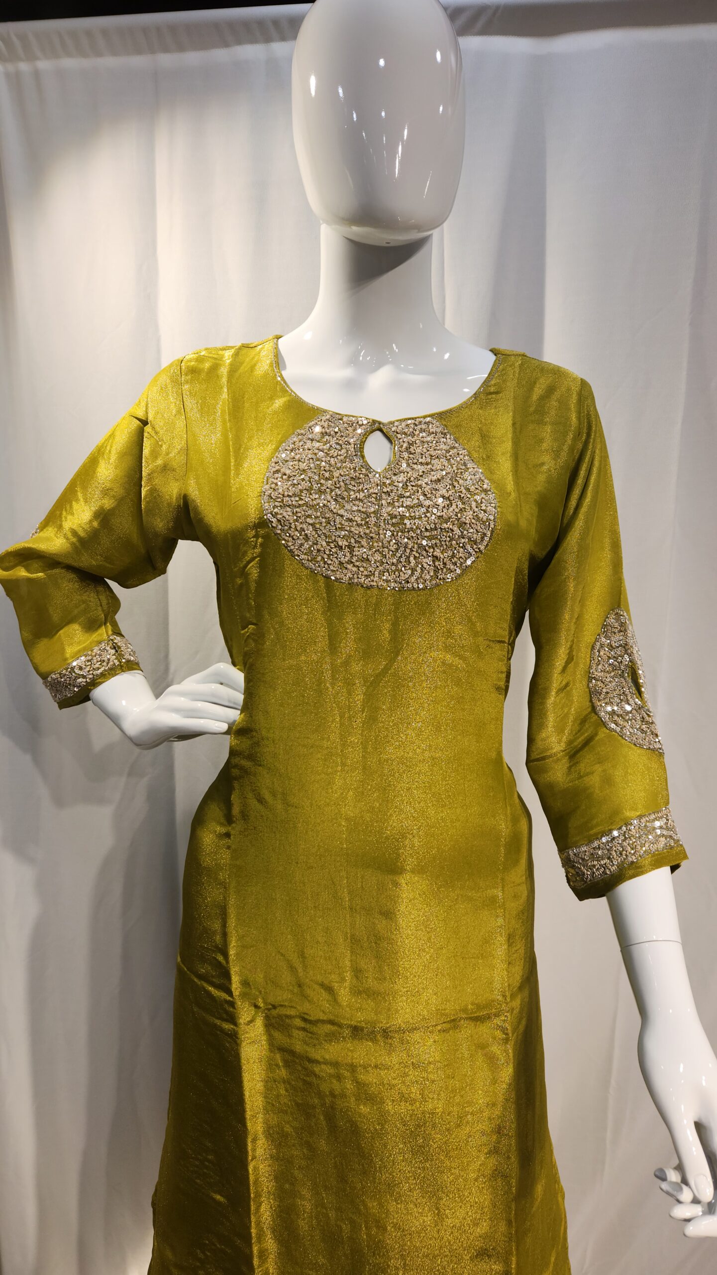 Step into timeless grace with this beautifully designed Tissue Silk Ethnic Suit, a masterpiece of delicate craftsmanship and refined luxury. Crafted from premium tissue silk, this suit radiates a subtle sheen and offers a graceful drape, making it the perfect choice for weddings, festive occasions, and elegant soirées.